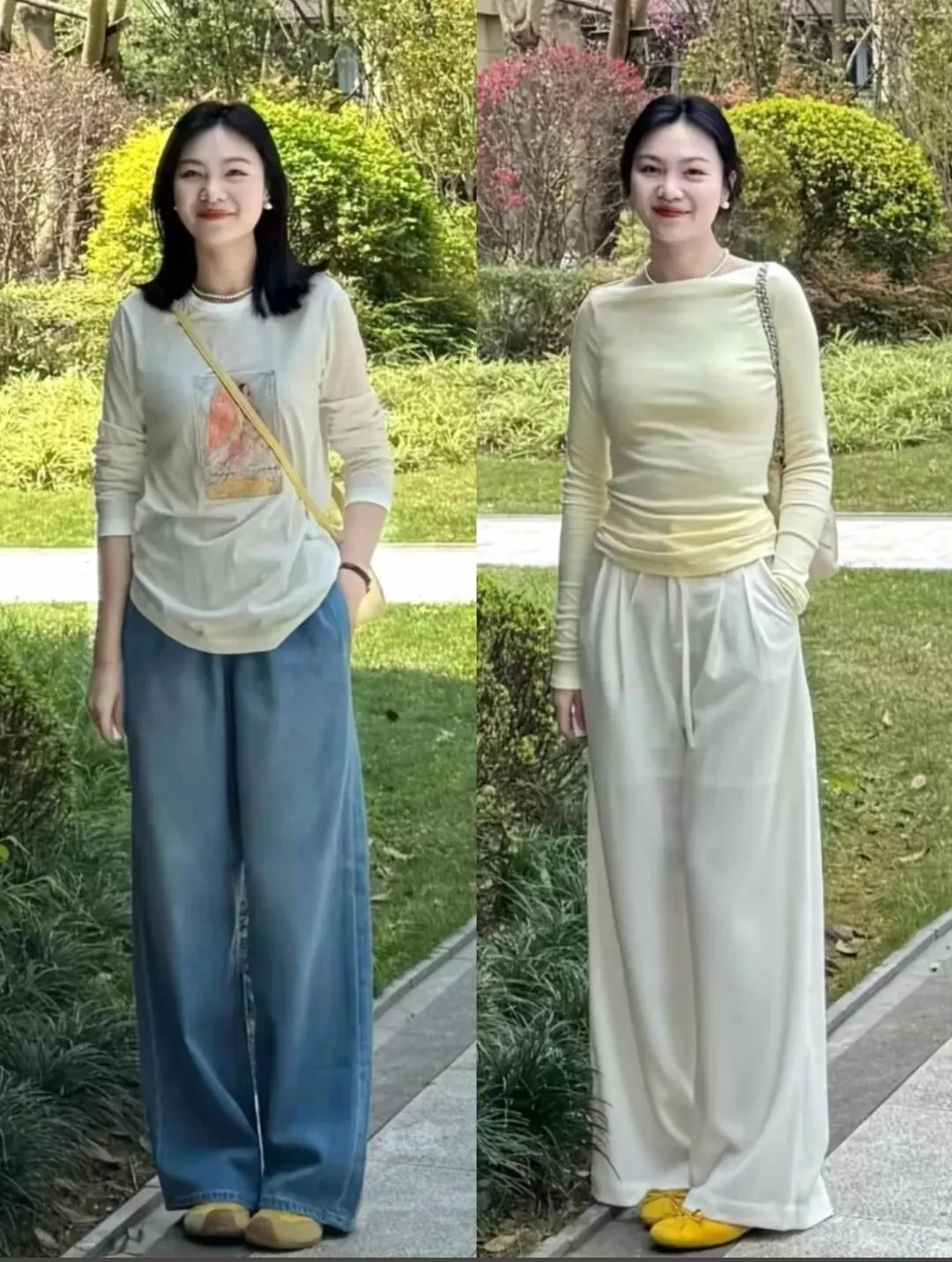 2. 温柔松弛风|针织/薄款上衣,适配春日温差第4、7套以柔软针织/轻薄上衣为核心,拿捏春日温柔感:- 鹅黄色薄款针织上衣+白色阔腿裤:低饱和黄色自带春日治愈感,阔腿裤垂坠感十足,搭配黄色单鞋,整套配色干净高级,通勤穿从容优雅,约会穿温柔浪漫;- 米白色轻薄褶皱上衣+深蓝直筒牛仔裤:面料自带肌理感,简约却不单调,直筒牛仔裤修饰腿型,红色单鞋点亮整体,复古又耐看,适配春日微凉天气。核心秘诀:春日选轻薄透气面料(针织、天丝、棉麻),兼顾温度与舒适度,颜色以低饱和莫兰迪色、奶油色为主,容错率极高。