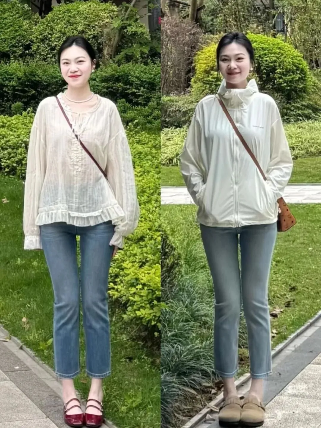 3. 简约通勤风|基础款叠穿,实用又显瘦第3、5、6、8套主打基础款叠穿,适配职场、日常多种场景:- 浅色系印花薄款上衣+深蓝阔腿牛仔裤:宽松版型藏肉显瘦,阔腿裤的垂坠感优化身材线条,日常通勤、周末逛街都能穿,舒适不束缚;- 浅蓝薄款针织上衣+浅灰牛仔短裙:蓝白配色清新干净,针织面料自带温柔质感,短裙凸显轻盈感,日常通勤低调又精致;- 米白色轻薄罩衫+浅蓝直筒牛仔裤:层次感拉满,轻薄罩衫增加穿搭细节,直筒牛仔裤利落显瘦,春日出游拍照超出片;- 米白色轻薄外套+浅蓝修身牛仔裤:简约外套适配春日温差,修身牛仔裤贴合腿型,整体干净利落,职场通勤、日常聚会都得体。米白色轻薄罩衫+浅蓝直筒牛仔裤:层次感拉满,轻薄罩衫增加穿搭细节,直筒牛仔裤利落显瘦,春日出游拍照超出片;- 米白色轻薄外套+浅蓝修身牛仔裤:简约外套适配春日温差,修身牛仔裤贴合腿型,整体干净利落,职场通勤、日常聚会都得体。春日穿搭总结,舒适为本,简约为主。春日穿搭不必追求夸张与繁复,像图中这8套造型一样,以基础款为核心,搭配舒适面料、耐看配色,再通过细节点缀,就能穿出不费力的高级感。