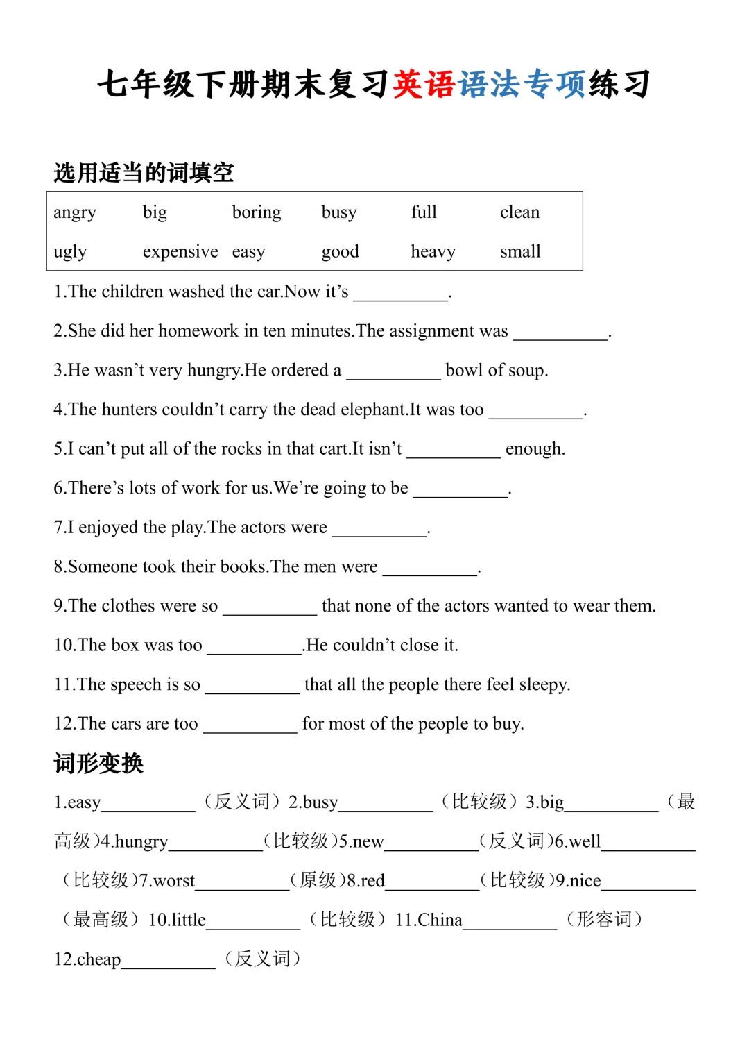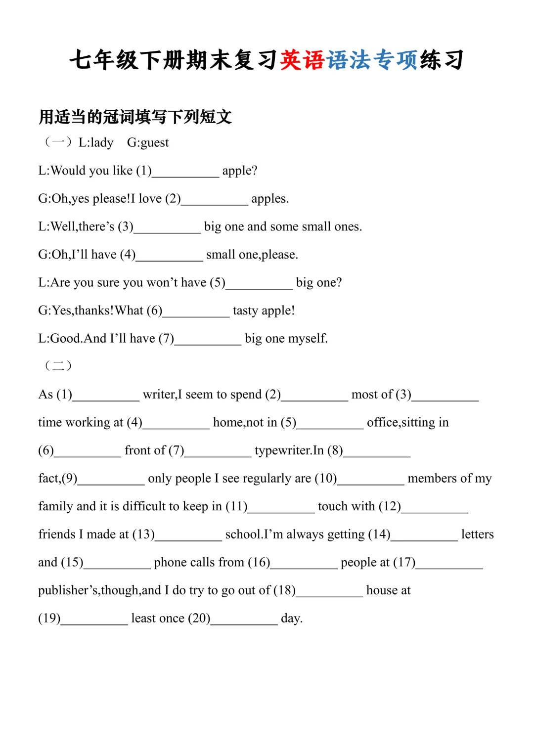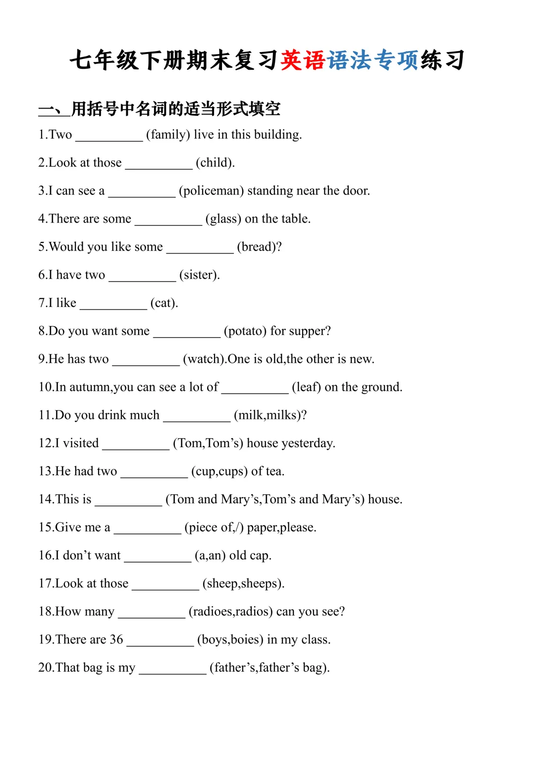 七年级下册期末复习英语语法专项练习(pdf电子版含答案,可下载打印)