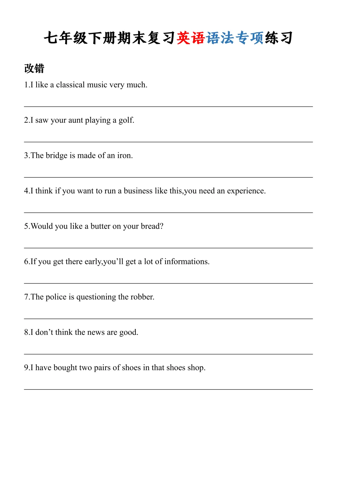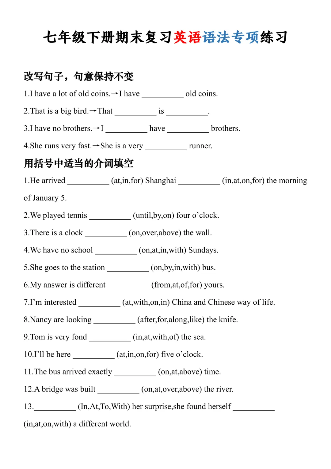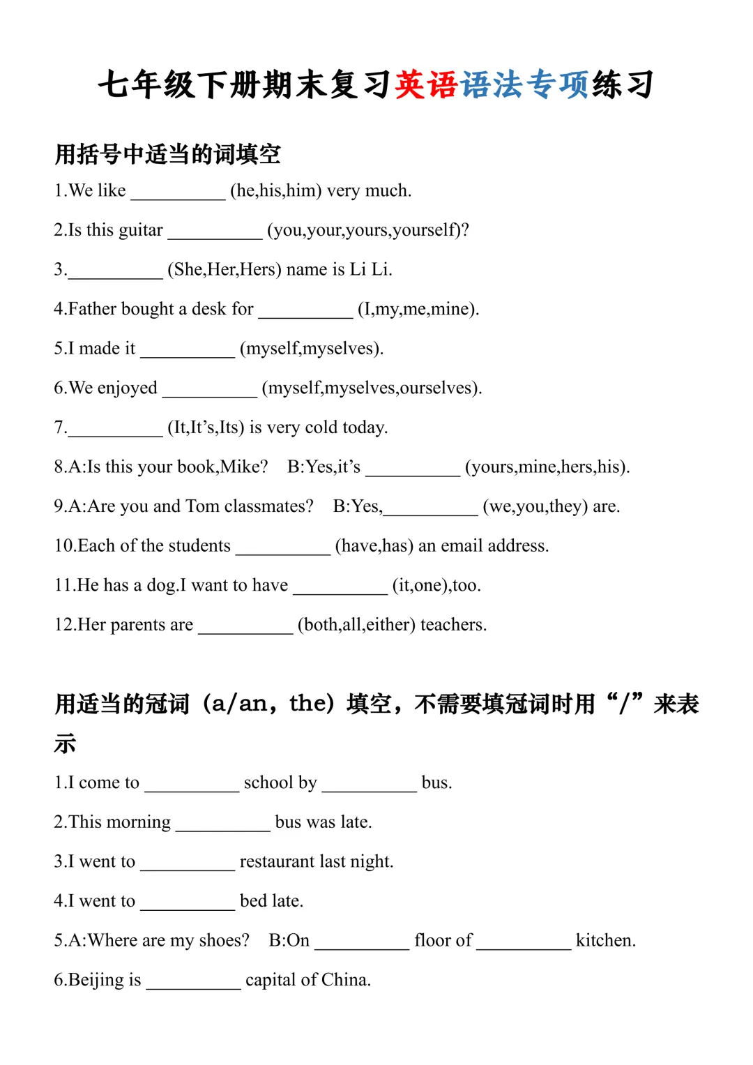 七年级下册期末复习英语语法专项练习(pdf电子版含答案,可下载打印)