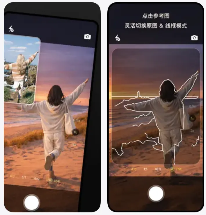 原图 / 线框模式切换,强光弱光都能用,还能建专属素材库。