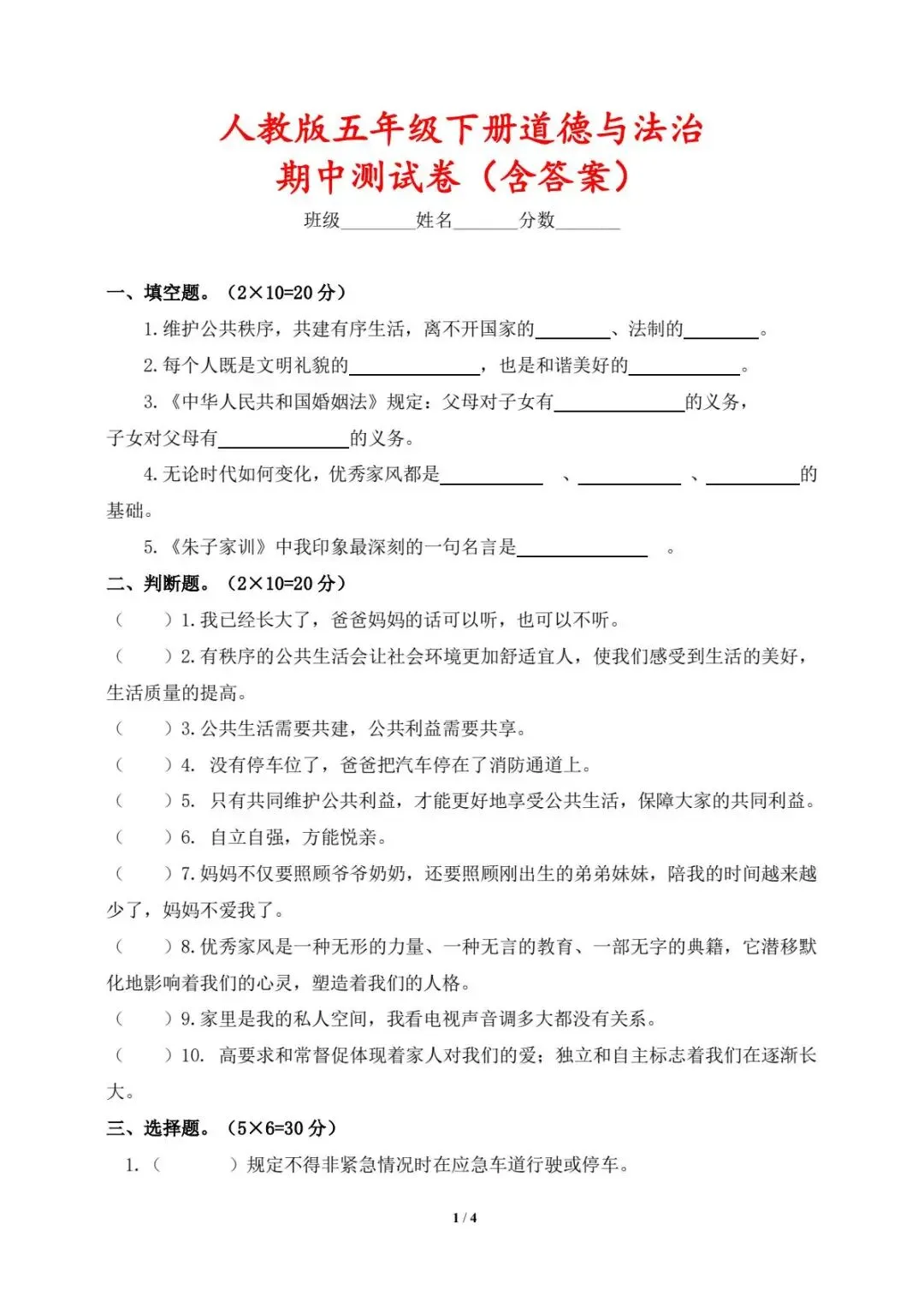 五年级家长必看!道德与法治期中考试临近,公共生活、家人关系等高频考点你家孩子掌握了吗?我们为大家准备了超实用的期中测试卷,精准针对考点。电子版可打印,还附有详细答案,助力孩子查缺补漏,期中取得好成绩!