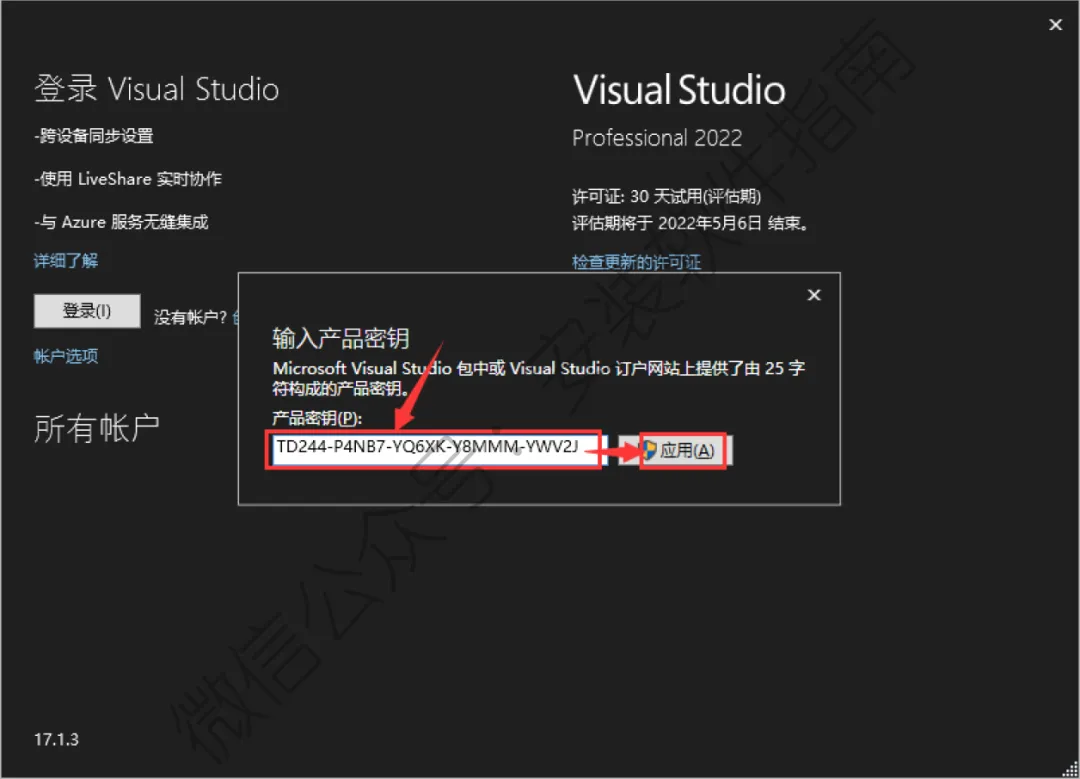 18.输入产品秘钥:安装的是专业版输入【TD244-P4NB7-YQ6XK-Y8MMM-YWV2J】,社区版无需秘钥;点击【应用】。