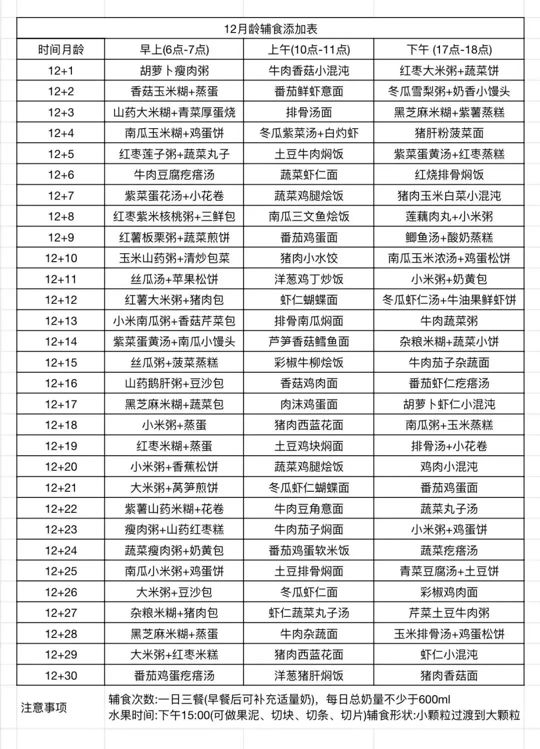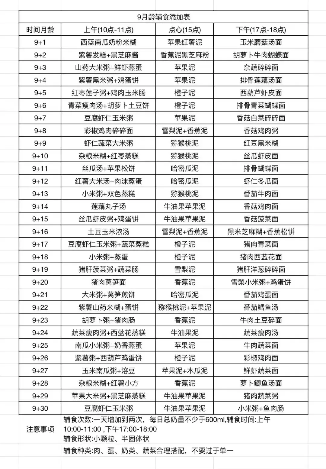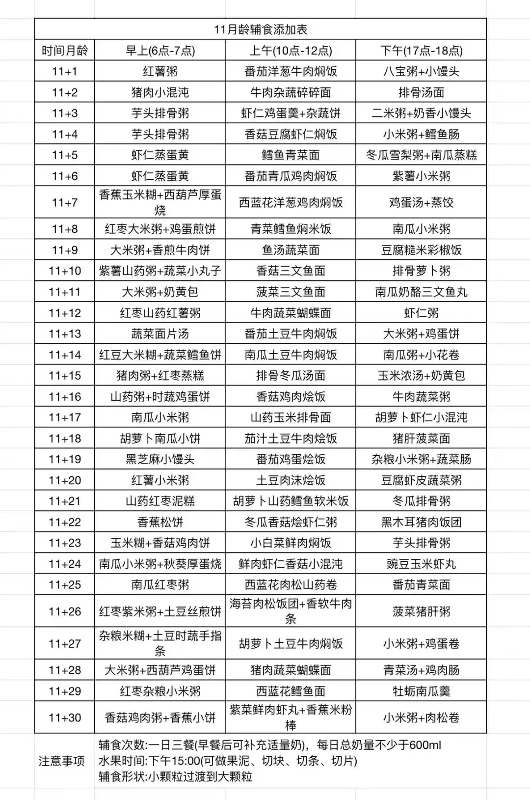 - 辅食次数:一日三餐,早餐后可适量补充奶量
