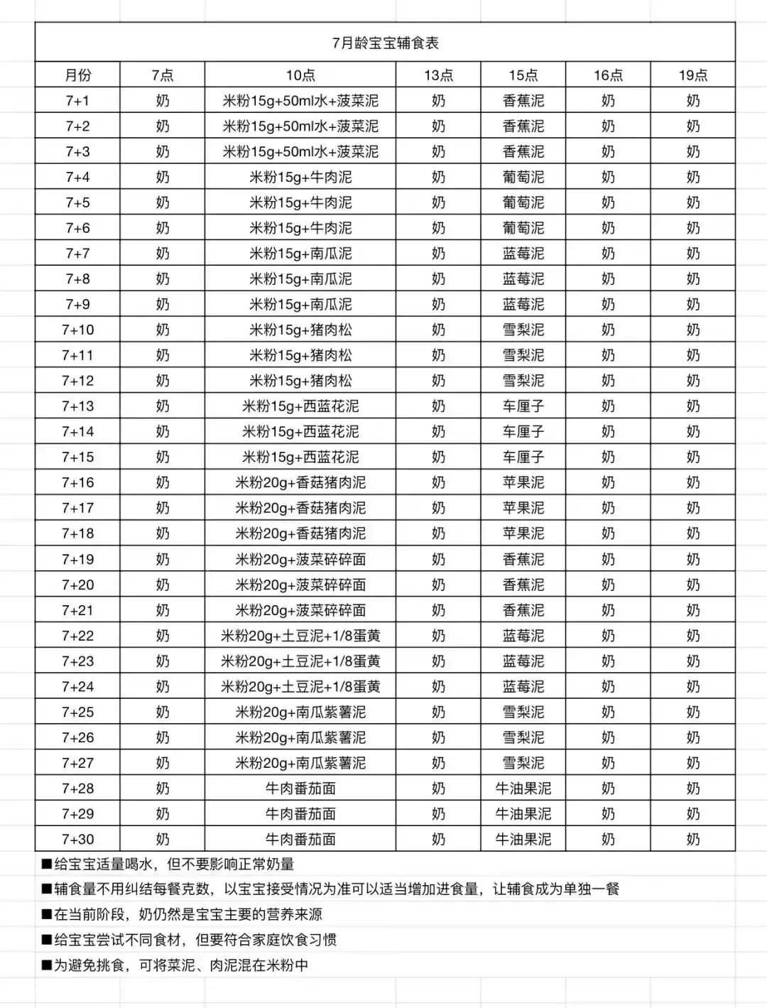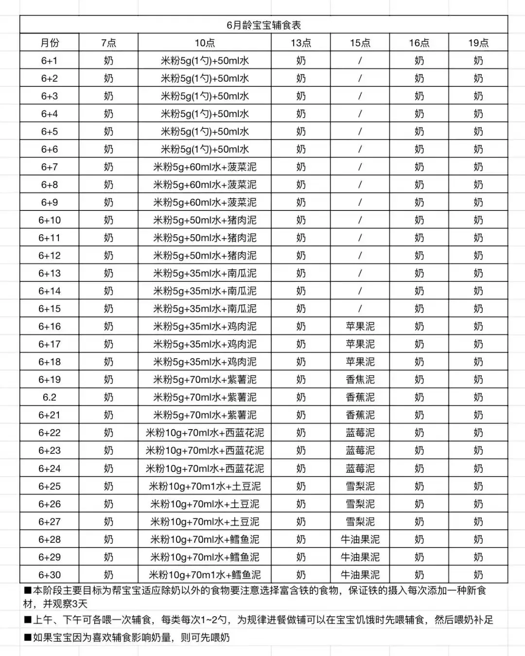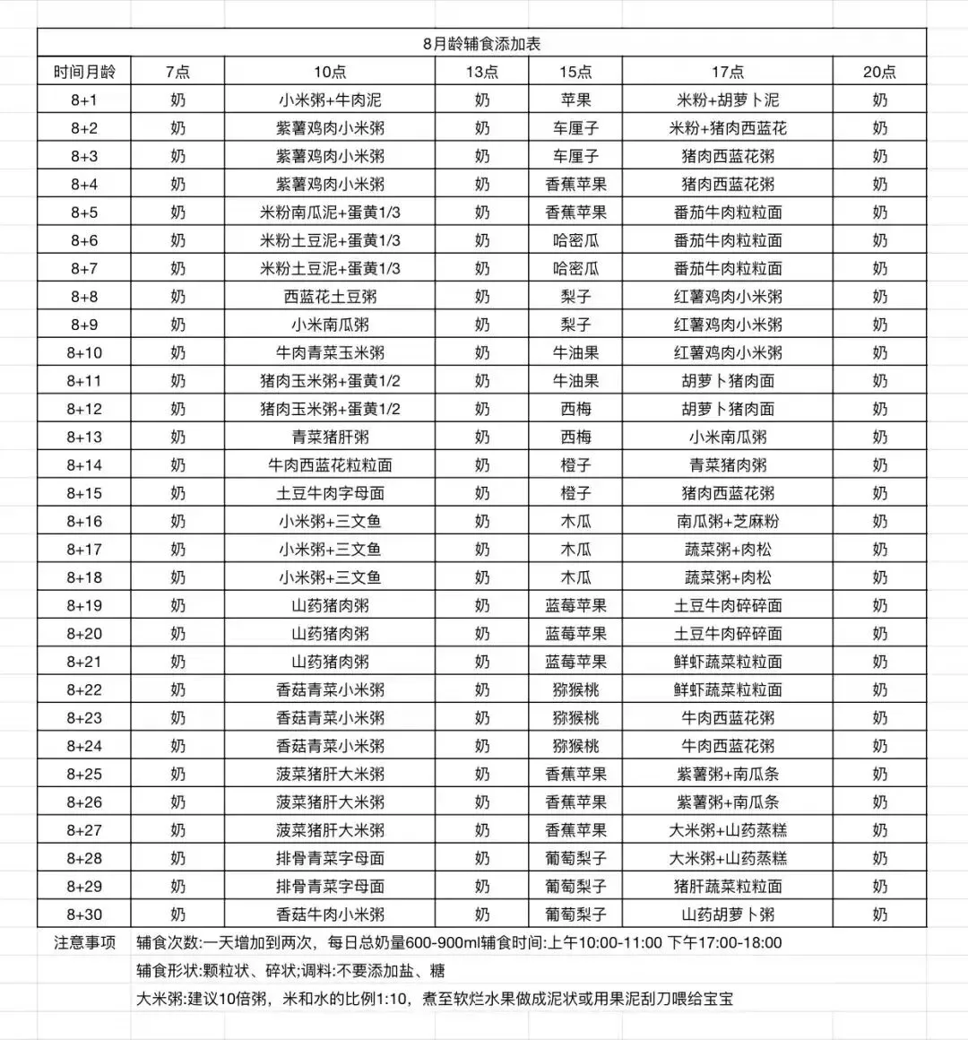 - 辅食次数:一日三餐,早餐后可适量补充奶量