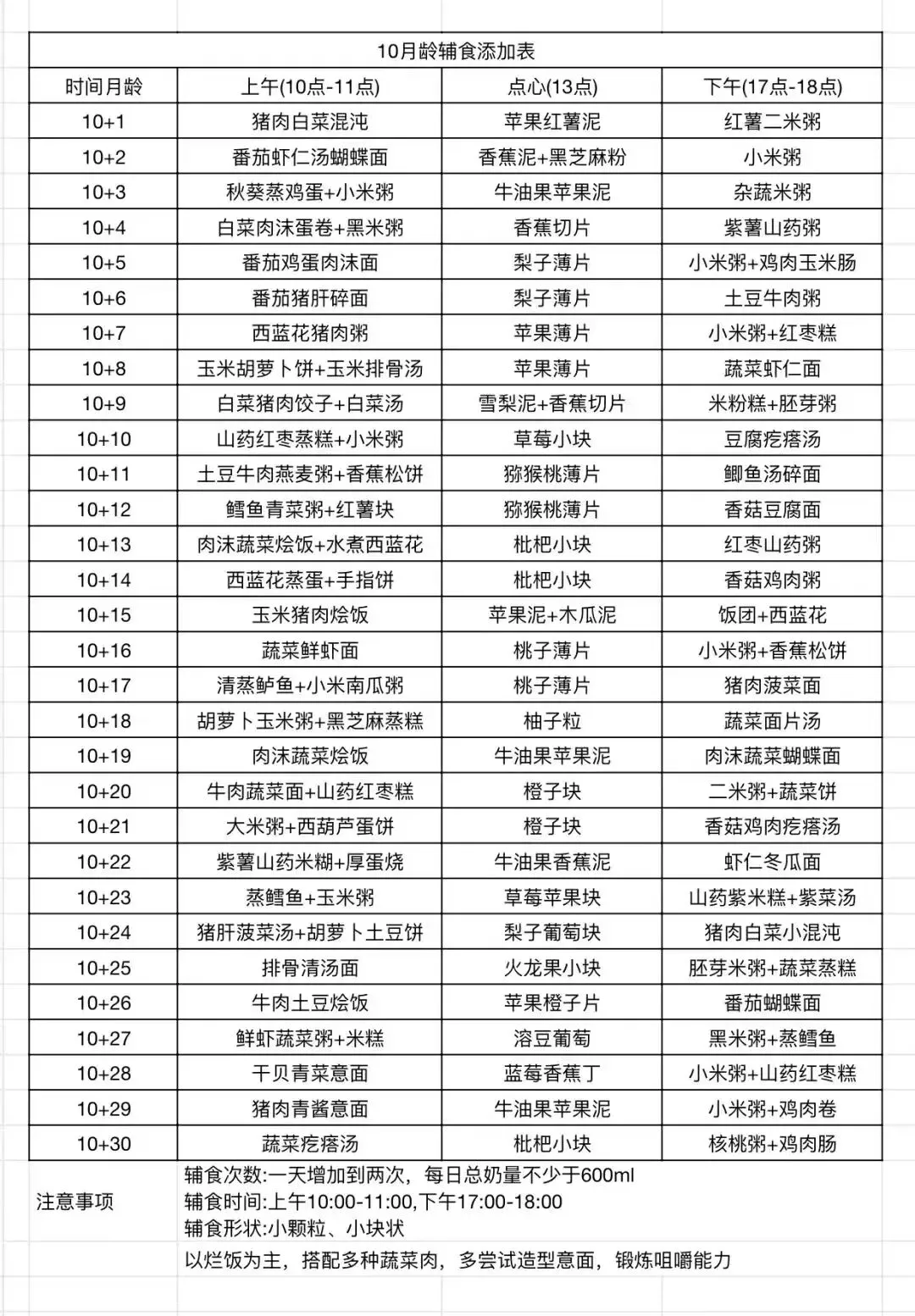 - 辅食时间:上午10:00-11:00,下午17:00-18:00