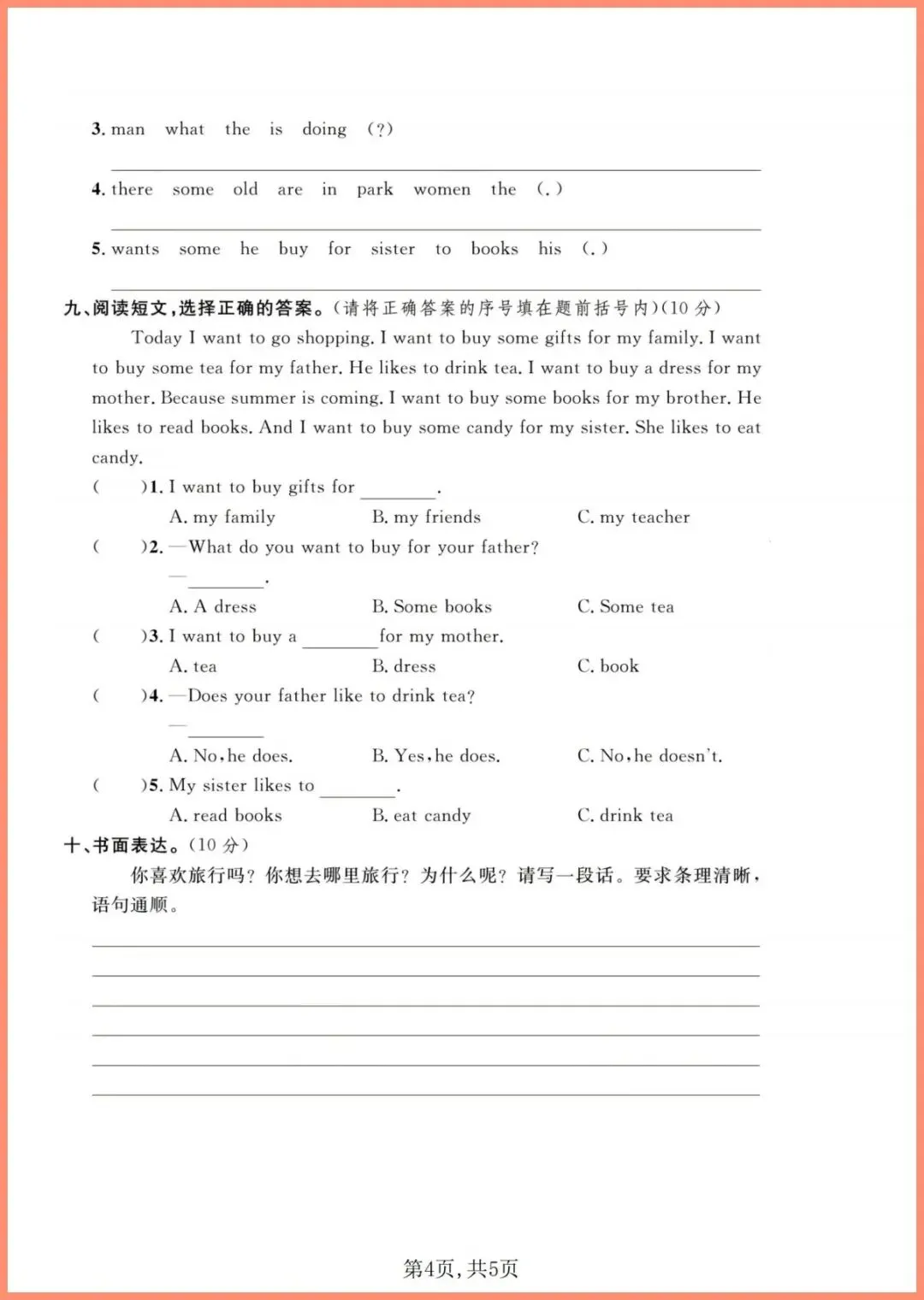 2026春冀教版五年级下册英语期中质量检测卷新鲜出炉,共5页,电子版一键打印!这套卷紧扣课本Unit1-3,涵盖听力、词汇、语法、阅读、写作五大模块,题型对标区统考,附赠高清听力二维码+答案详解。每天15分钟,孩子查漏补缺、提前熟悉期中节奏,成绩稳在班级前三!想让孩子期中不慌张的家长,现在就把卷子打印出来,今晚就能练起来!