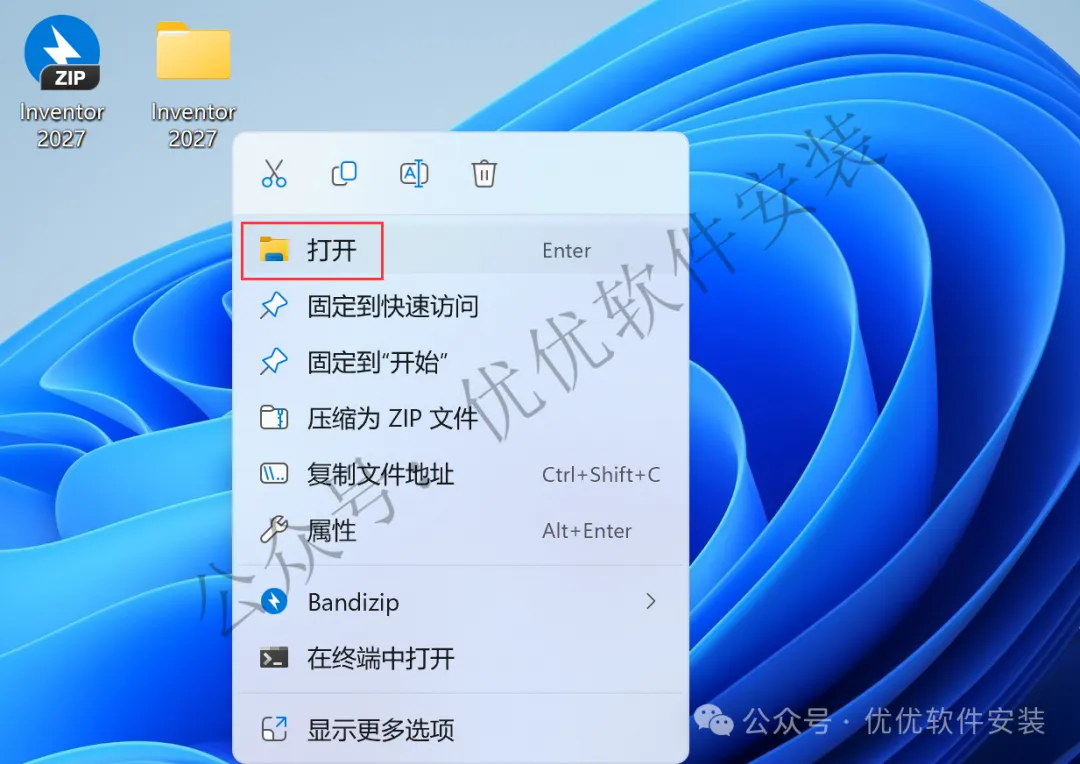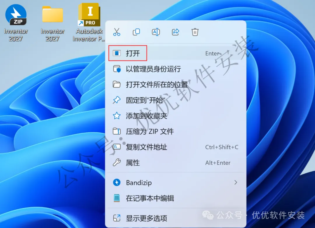 15、回到桌面,右键桌面上的【Inventor 2027软件图标】,点击【打开】