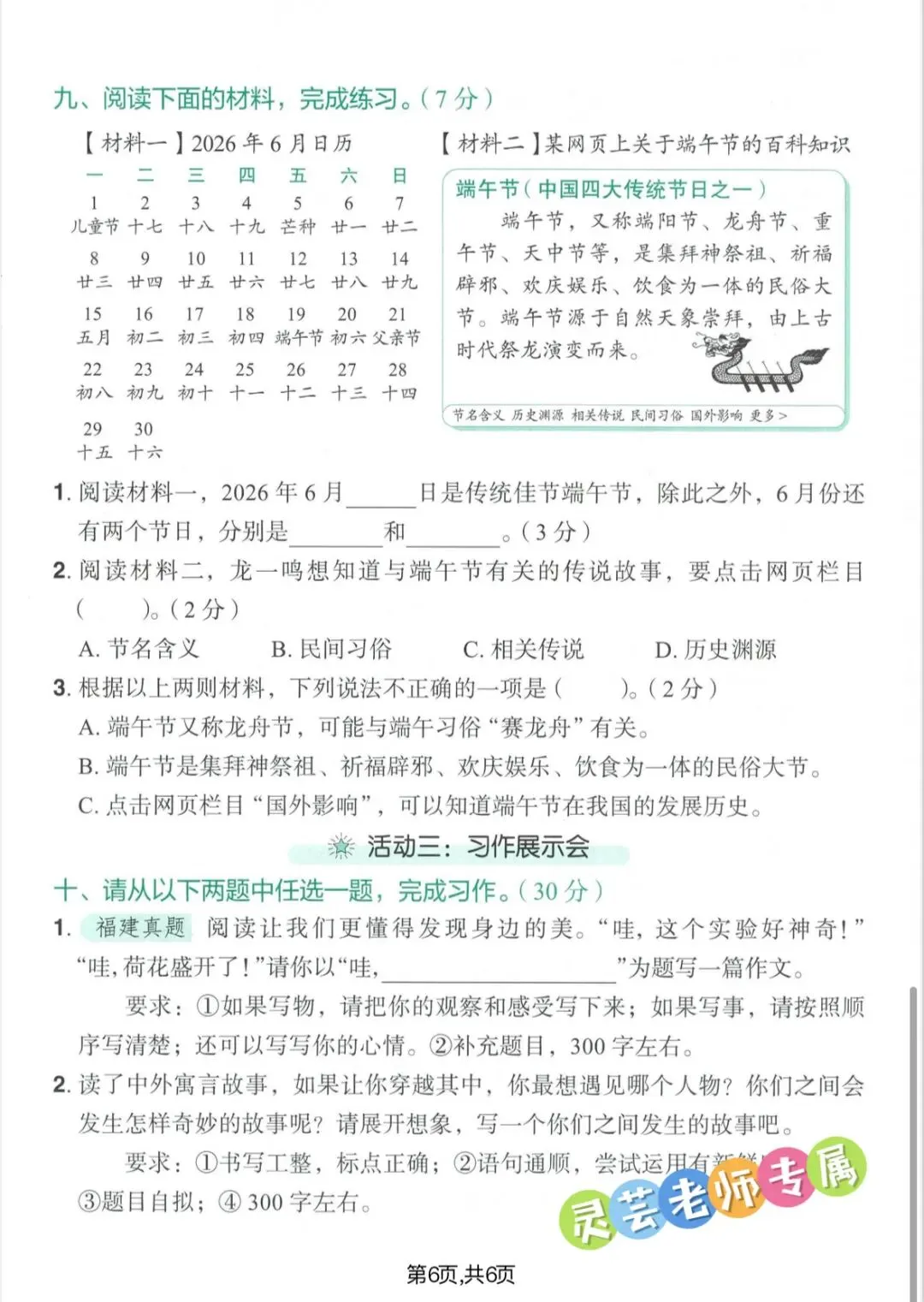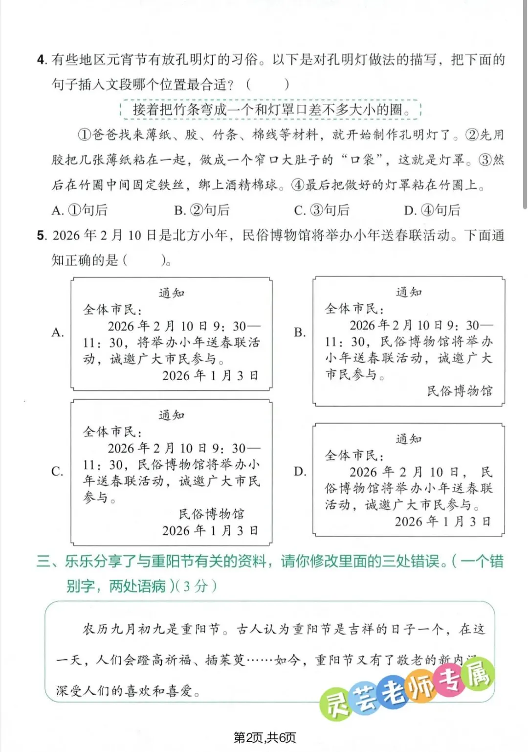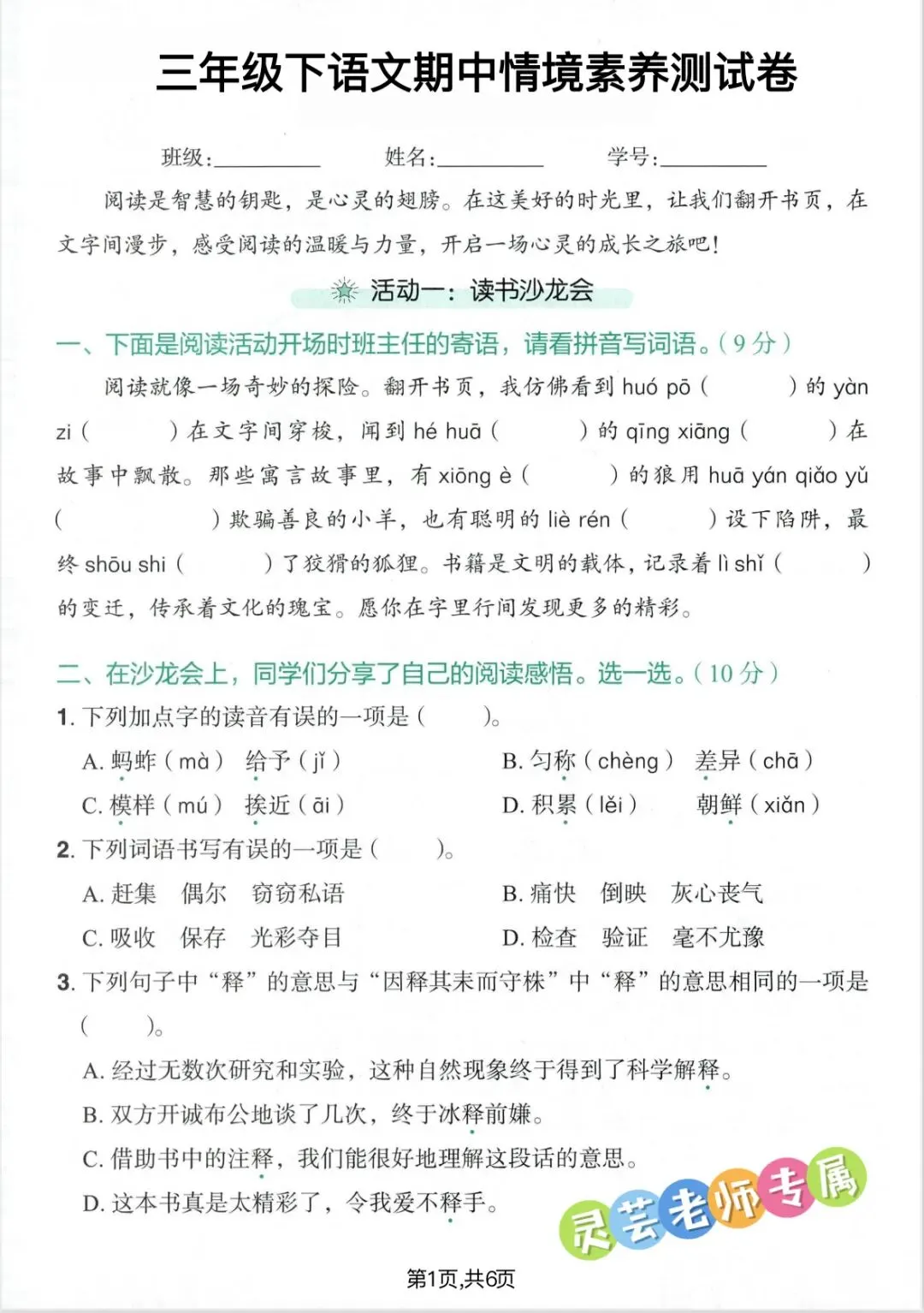 大家好!我是灵芸老师,今天分享的学习资料是:26春三年级语文下册期中情境素养测试卷(可打印),涵盖多音字、词语、句子、阅读理解等,文末有电子版获取方式。如果觉得这份资料不错,建议分享到班级群/年级群,让其他家长打印出来,帮助孩子学习。