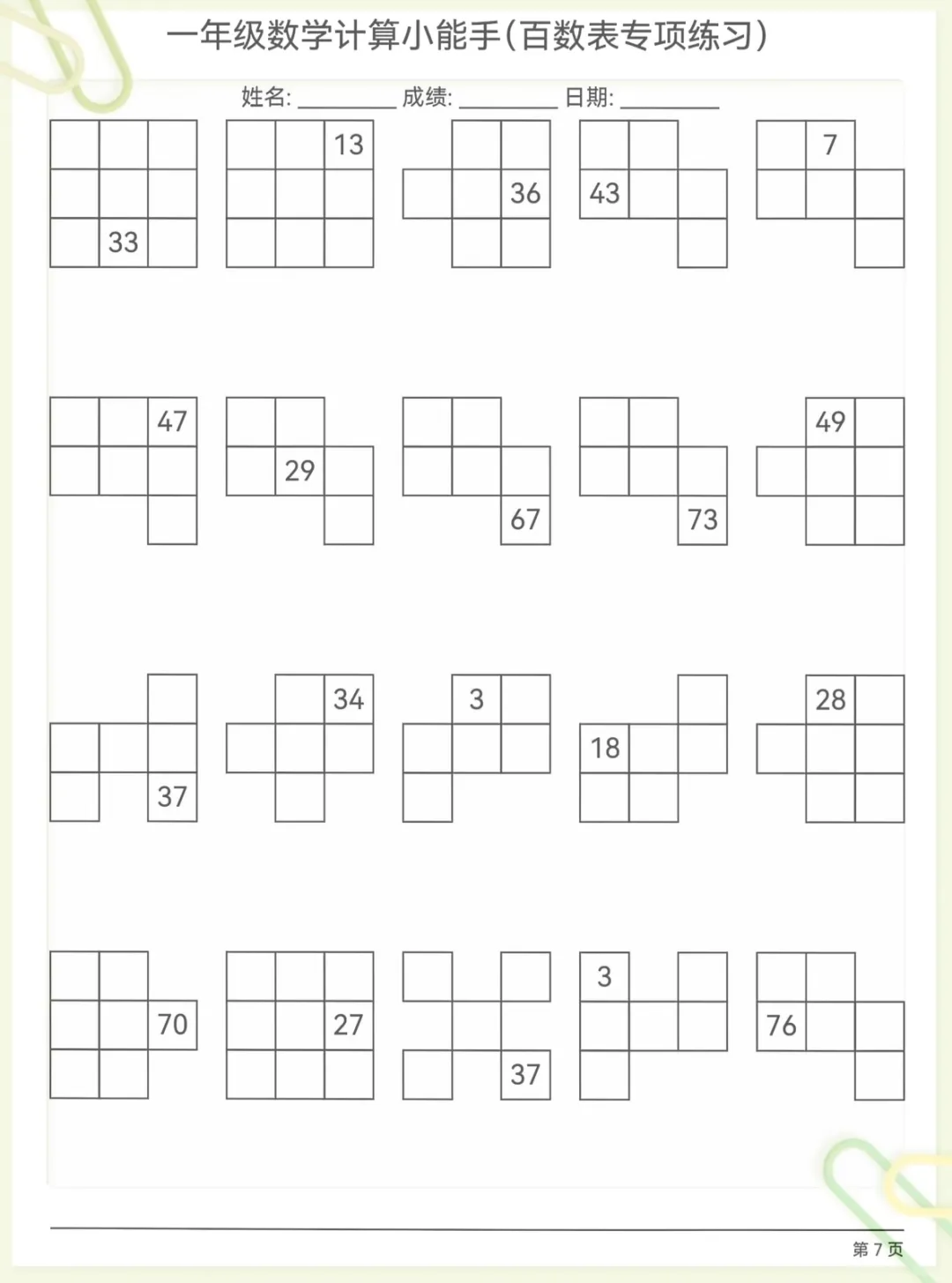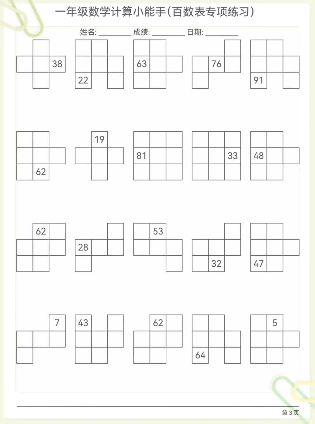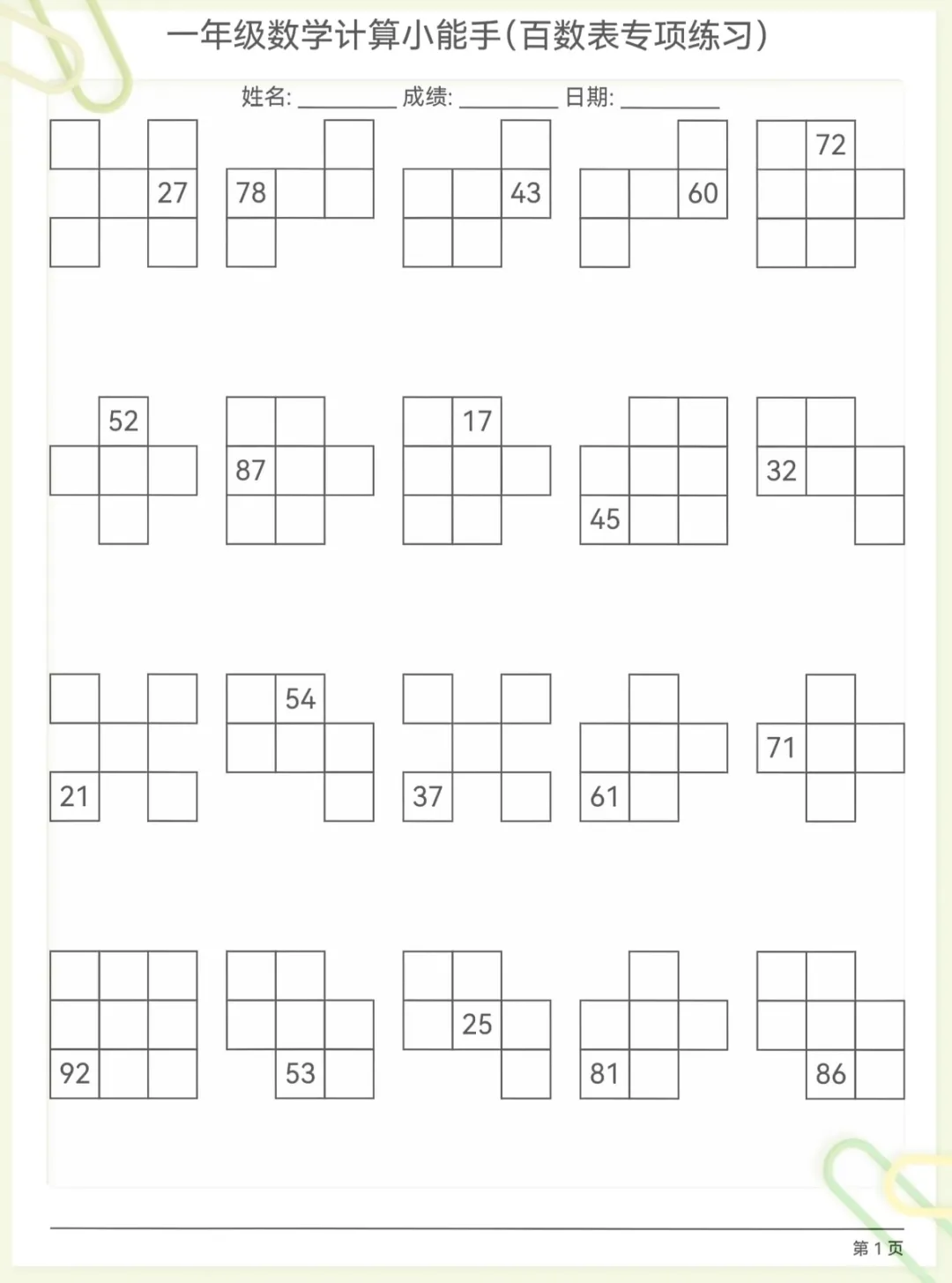 一年级下数学百数表专项练习,共18页,电子版可下载可打印,这份专项练习围绕百数表学习重点设计,帮助孩子熟悉100以内数的顺序与大小规律,进一步巩固数数、填空、找规律、相邻数等常见题型,在练习中提升数学基础与观察思维能力。内容贴合一年级下册学习需求,适合家长打印出来给孩子进行日常巩固与专项训练,需要的家长可以赶紧备一份,让孩子练一练。