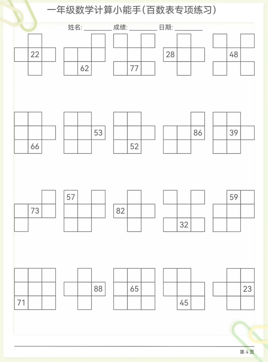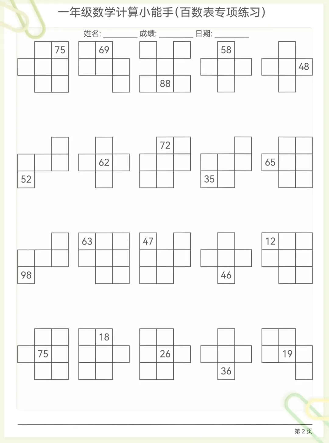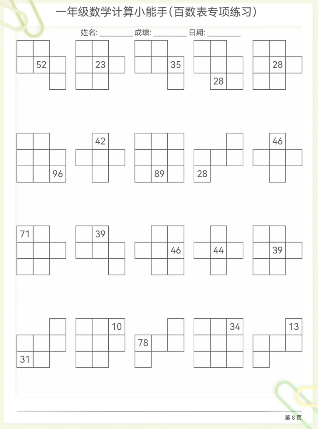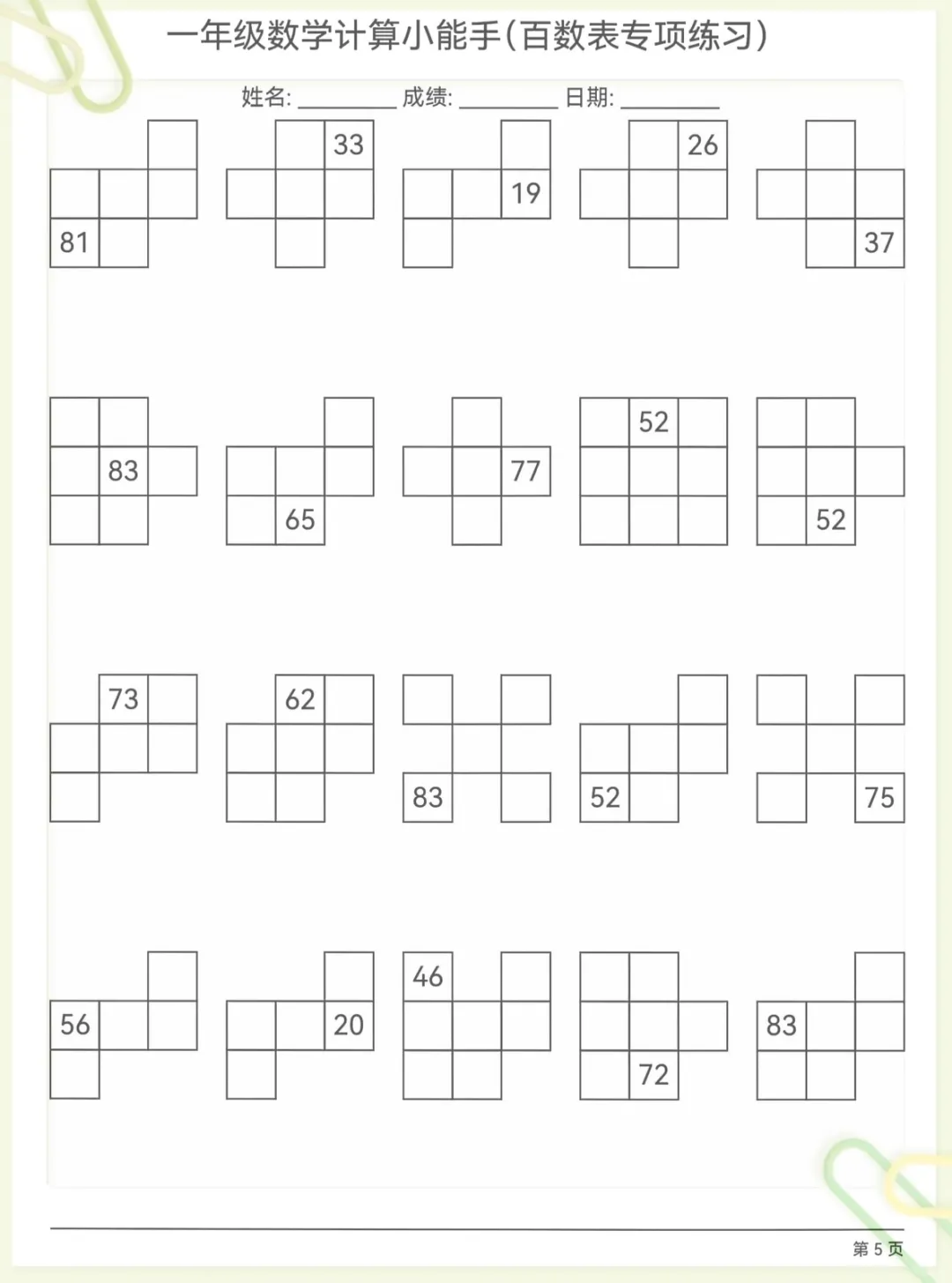 一年级下数学百数表专项练习,共18页,电子版可下载可打印,这份专项练习围绕百数表学习重点设计,帮助孩子熟悉100以内数的顺序与大小规律,进一步巩固数数、填空、找规律、相邻数等常见题型,在练习中提升数学基础与观察思维能力。内容贴合一年级下册学习需求,适合家长打印出来给孩子进行日常巩固与专项训练,需要的家长可以赶紧备一份,让孩子练一练。
