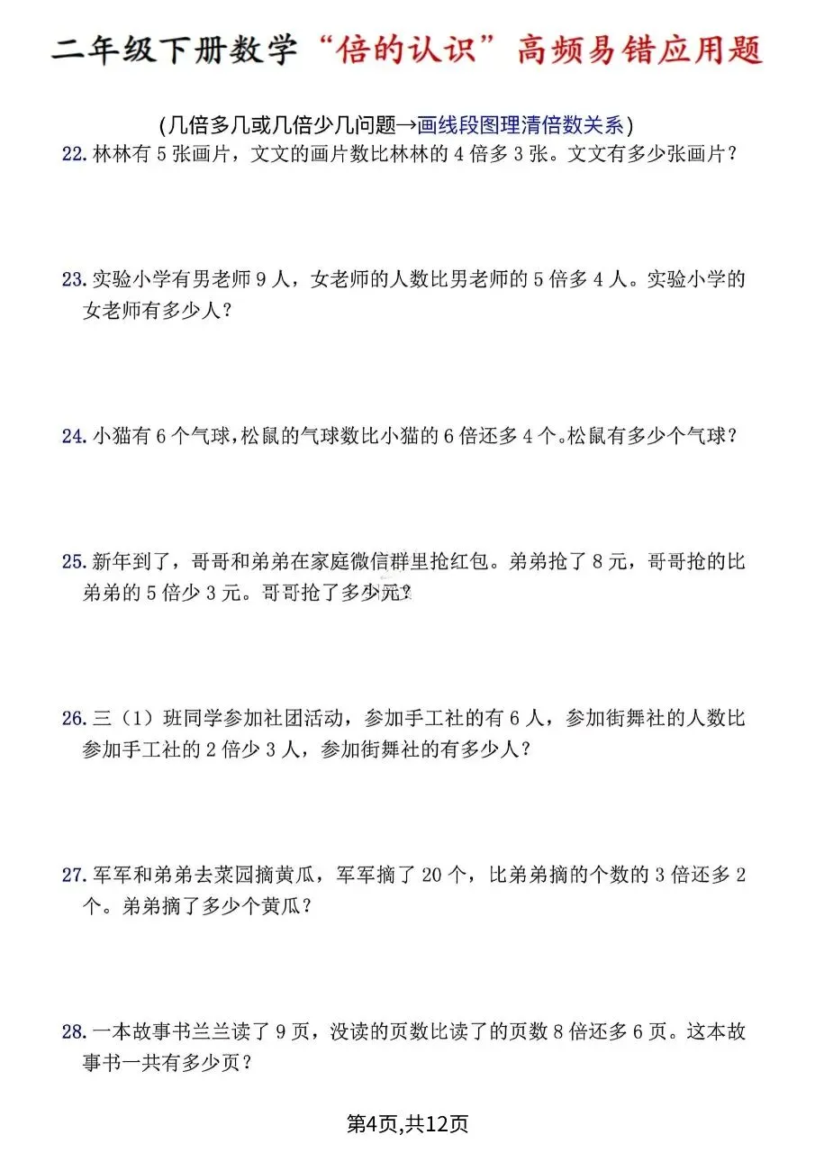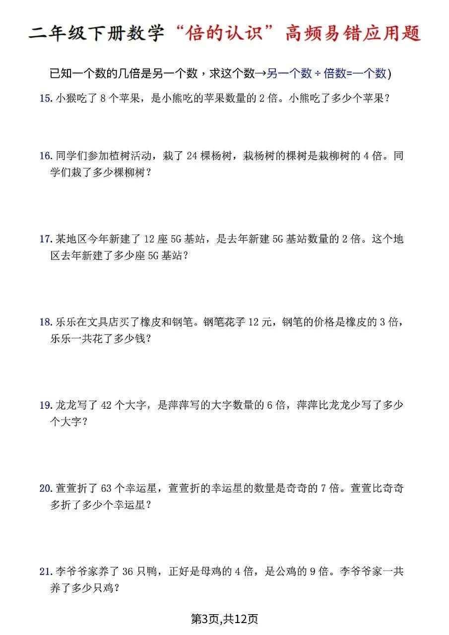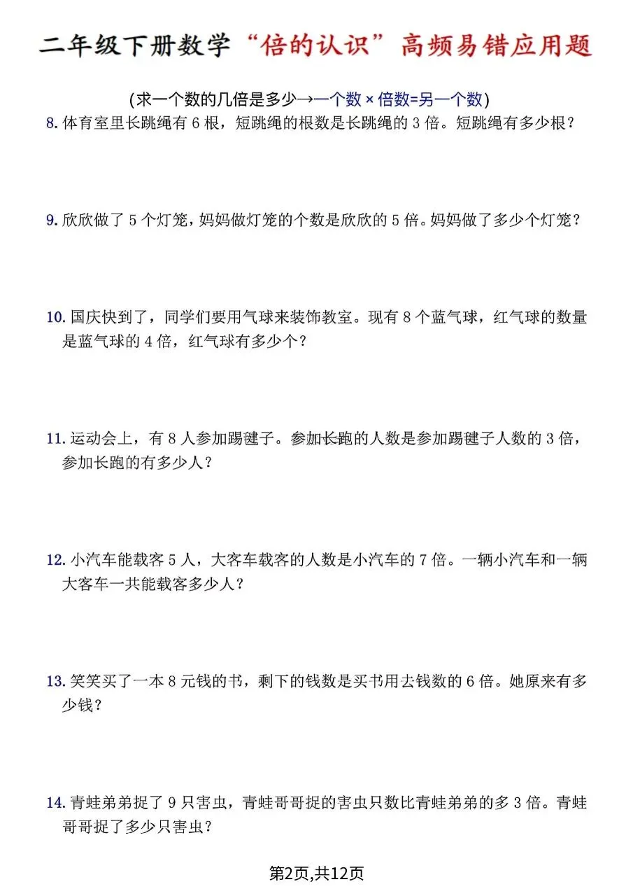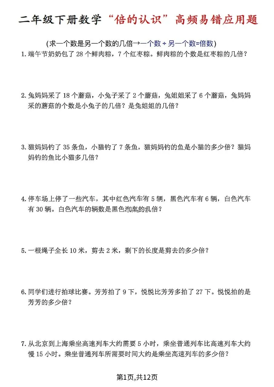 这是一份人教版二年级下册数学期中拔尖测试卷,满这份资料是二年级下册数学“倍的认识”高频易错题,按6类题型整理:求倍数、求一个数的几倍是多少、已知几倍求原数、几倍多/少几、年龄倍数、增减数量达标倍数,共40道应用题,附解题公式、步骤与易错提示,用于专项突破。