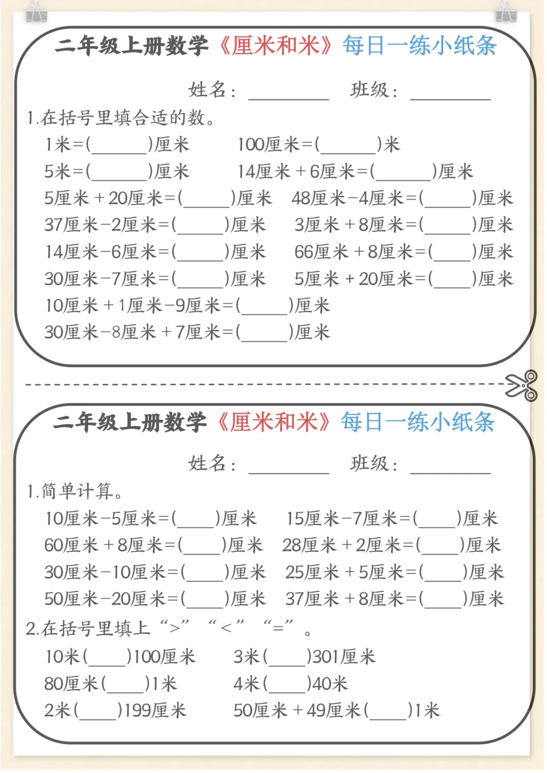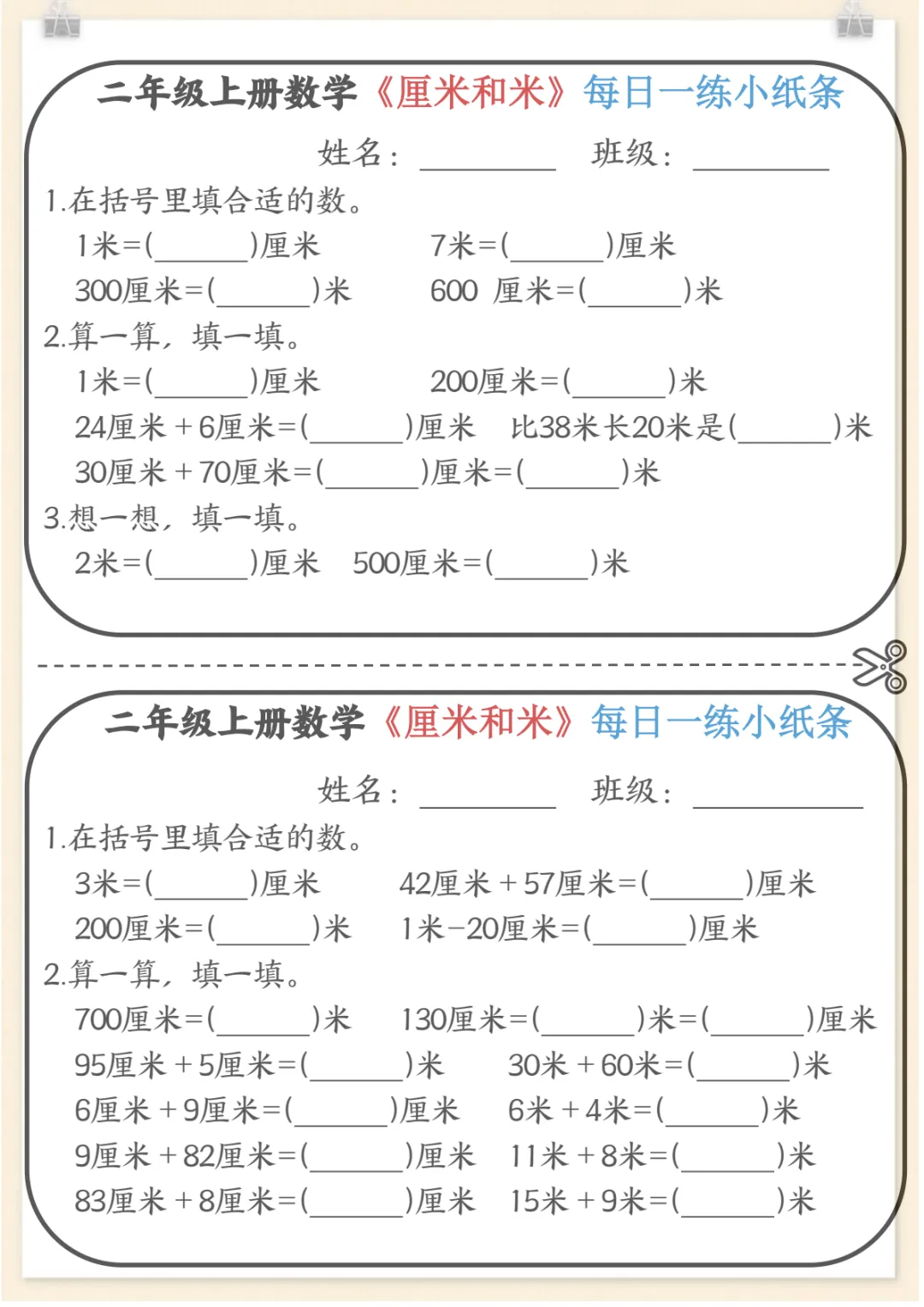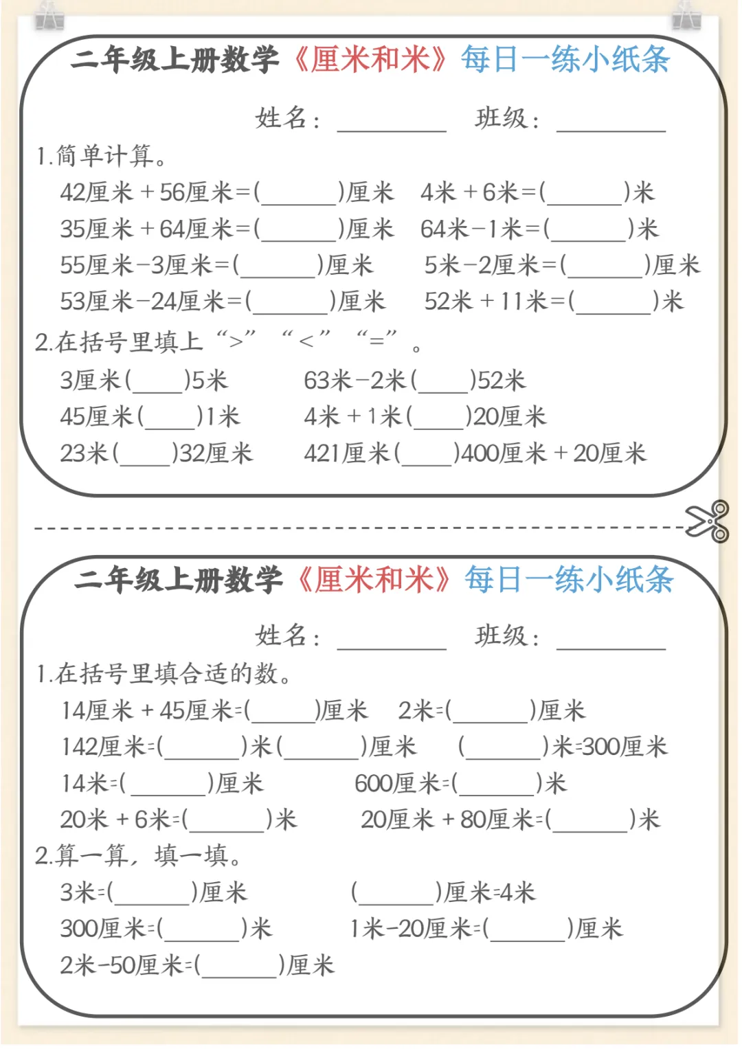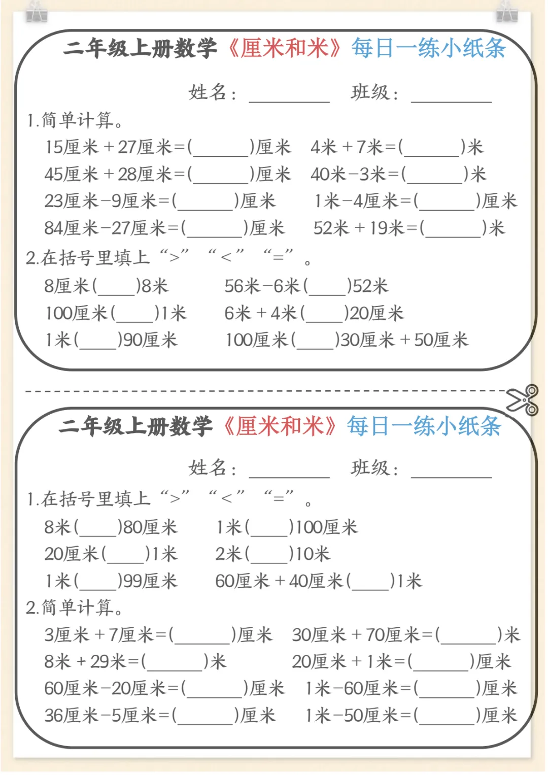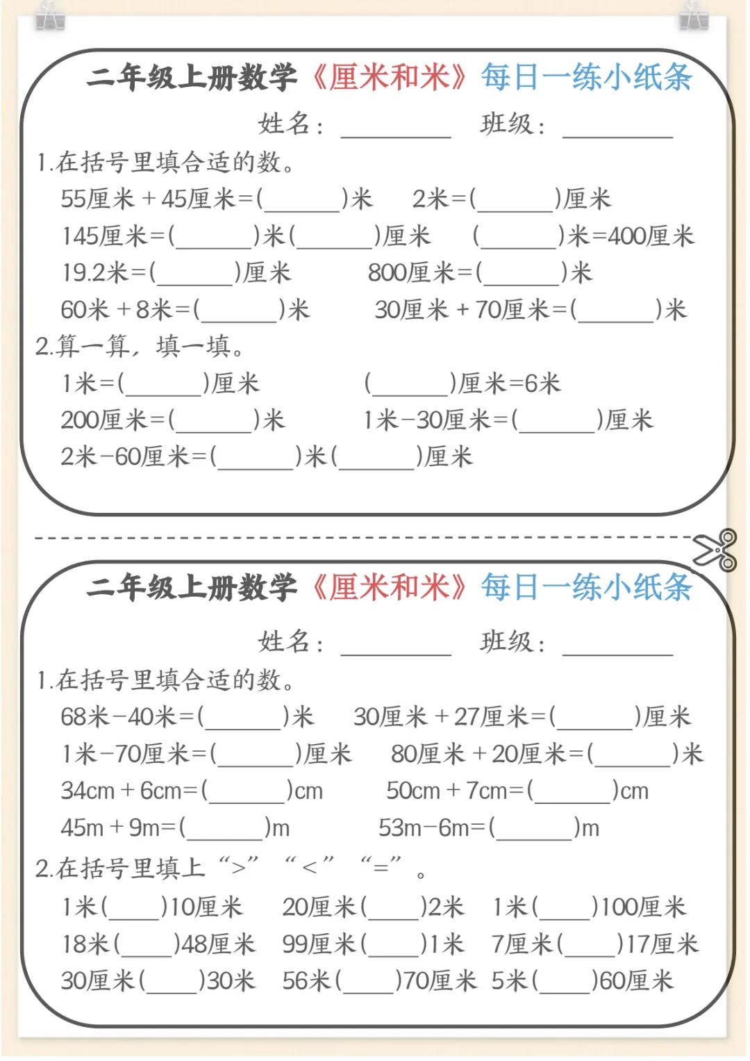 二年级上数学《厘米和米》每日一练小纸条,共6页,电子版可下载可打印,这份练习紧扣二年级数学长度单位学习内容,围绕厘米和米的认识、单位区分、实际测量与简单应用等知识进行每日巩固,帮助孩子在反复练习中加深理解、打牢基础,提升运用长度单位解决基础问题的能力。需要的家长可以抓紧保存打印出来,让孩子每天练一练。