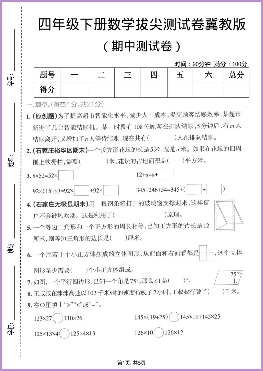 24年春冀教版四年级下册数学期中拔尖测试卷新鲜出炉,整整5页精华,电子版一键可打!卷内分基础闯关、思维拔高、易错突围三大模块,覆盖冀教本册前半重难点,题题对标课本又略高半格,专练孩子审题速度与解题策略。做完一套,薄弱点一目了然,家长陪娃对答案时还能顺势点拨思路,期中冲刺提分稳稳的!想让孩子考场多拿10分?现在就打印,今晚练起来!