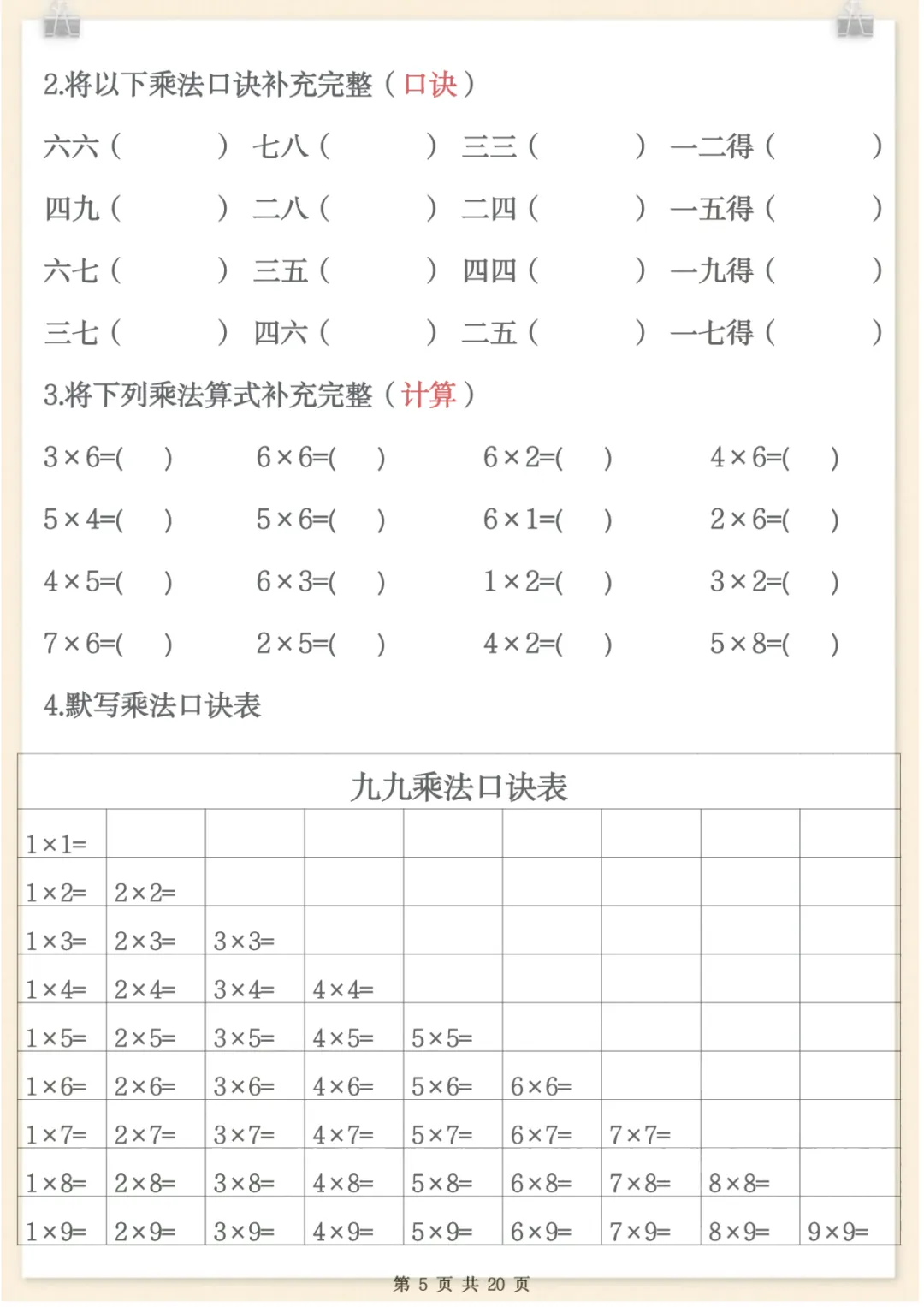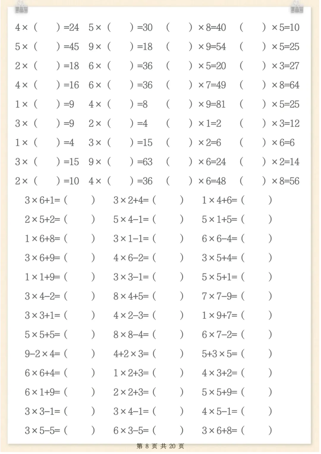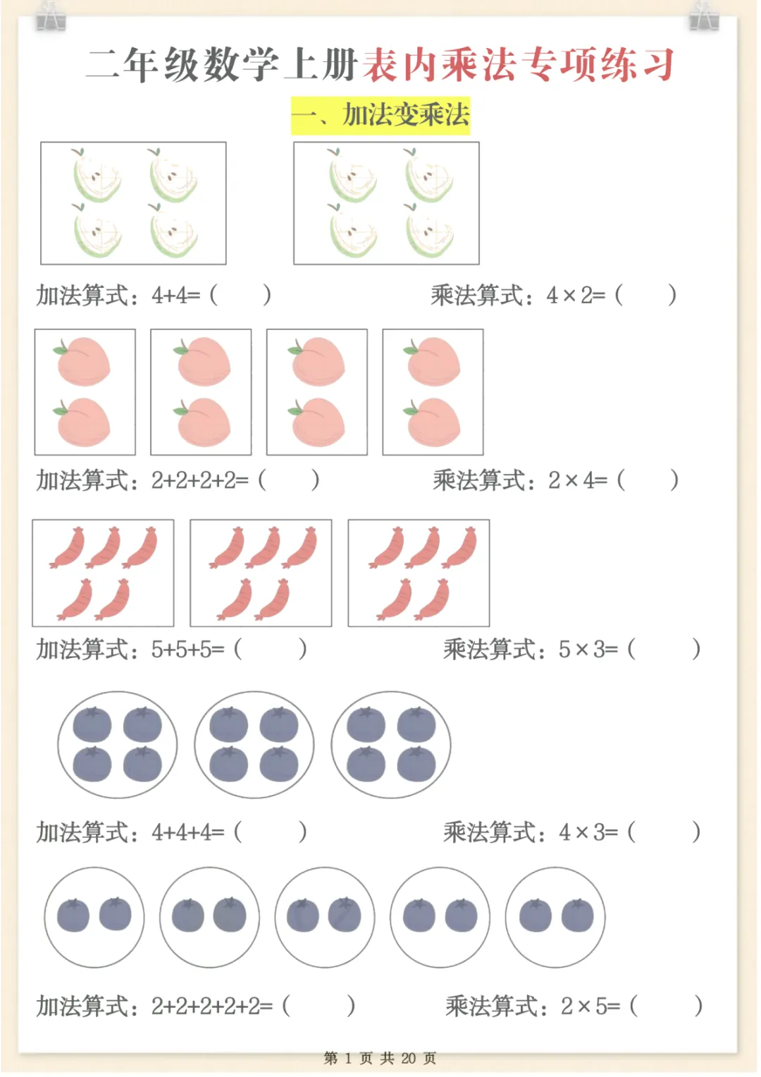 二年级数学上册表内乘法专项练习,共20页,电子版可下载可打印,这份资料紧扣二年级数学上册表内乘法学习内容,围绕乘法口诀运用、基础计算训练及相关专项练习展开,帮助孩子在反复练习中巩固课堂所学,提升计算熟练度与解题能力,适合家长日常在家配合练习使用,需要的家长可以及时下载打印出来,让孩子练一练吧。