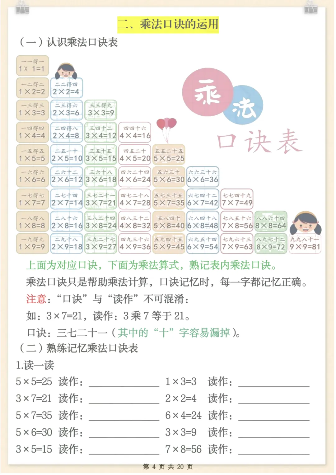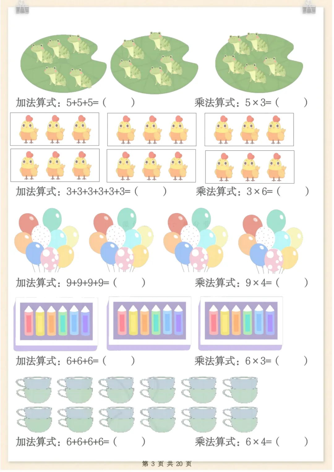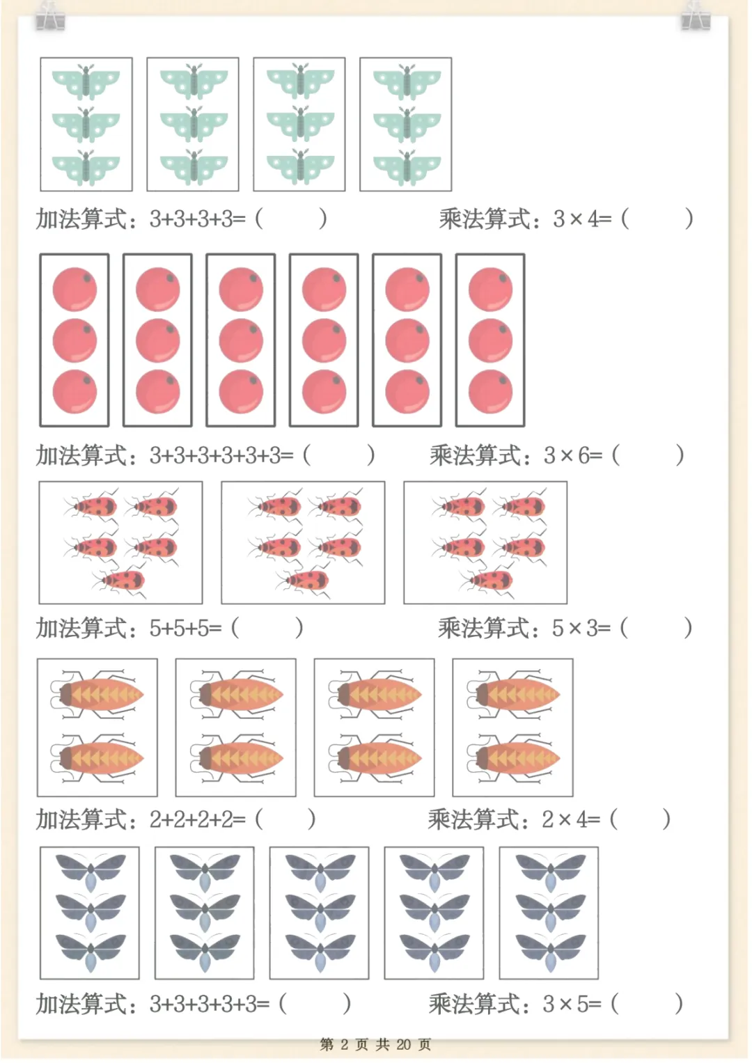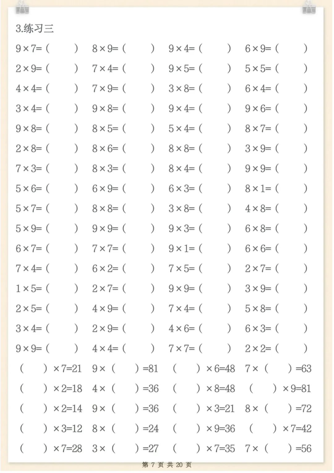 二年级数学上册表内乘法专项练习,共20页,电子版可下载可打印,这份资料紧扣二年级数学上册表内乘法学习内容,围绕乘法口诀运用、基础计算训练及相关专项练习展开,帮助孩子在反复练习中巩固课堂所学,提升计算熟练度与解题能力,适合家长日常在家配合练习使用,需要的家长可以及时下载打印出来,让孩子练一练吧。