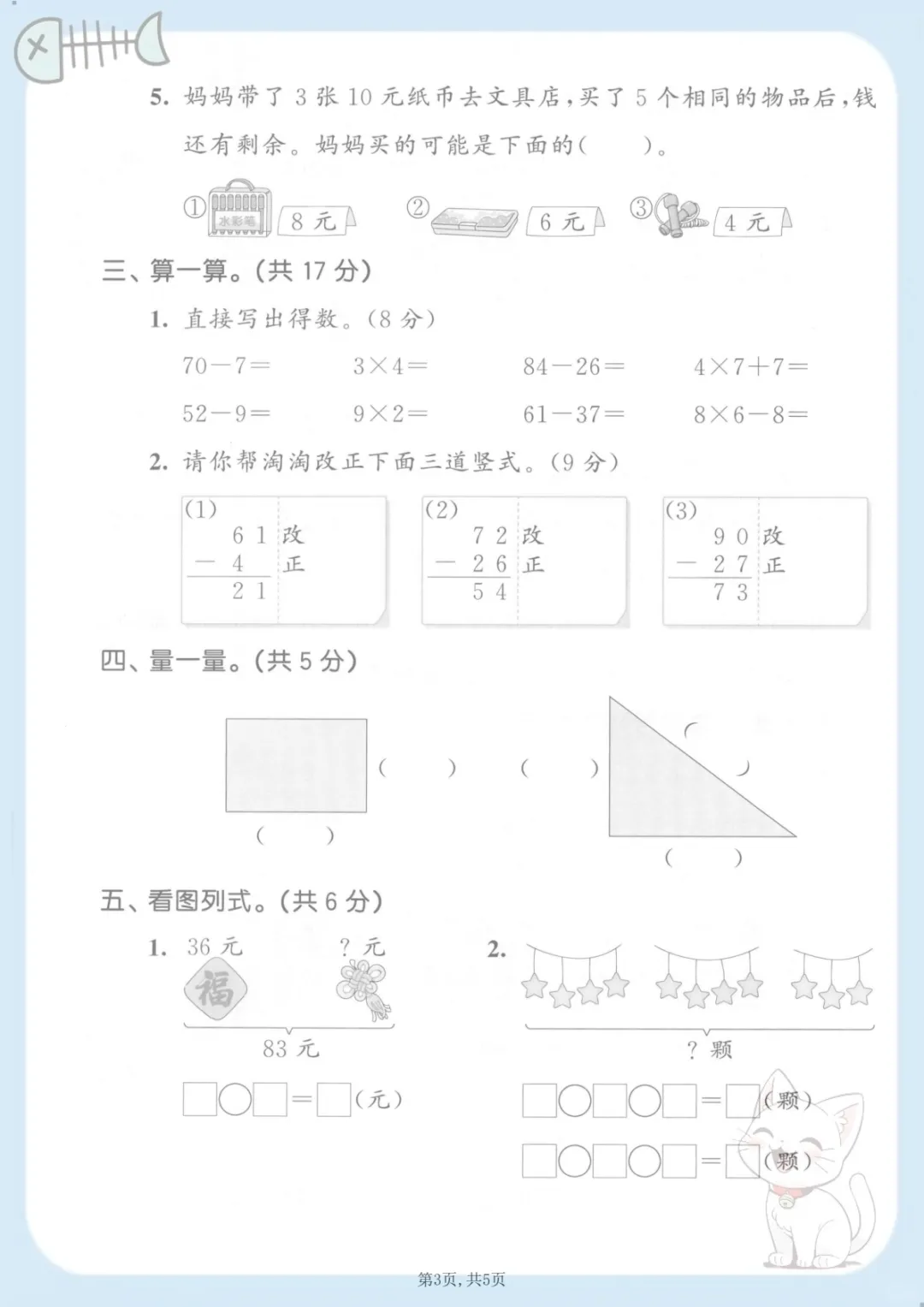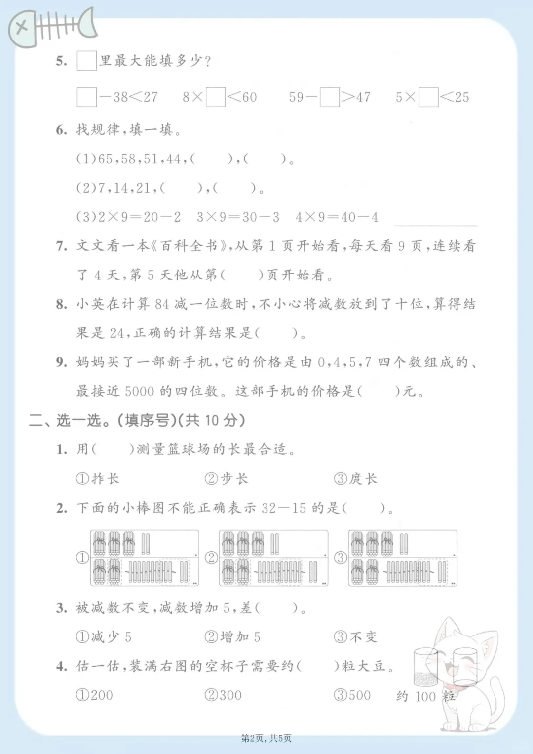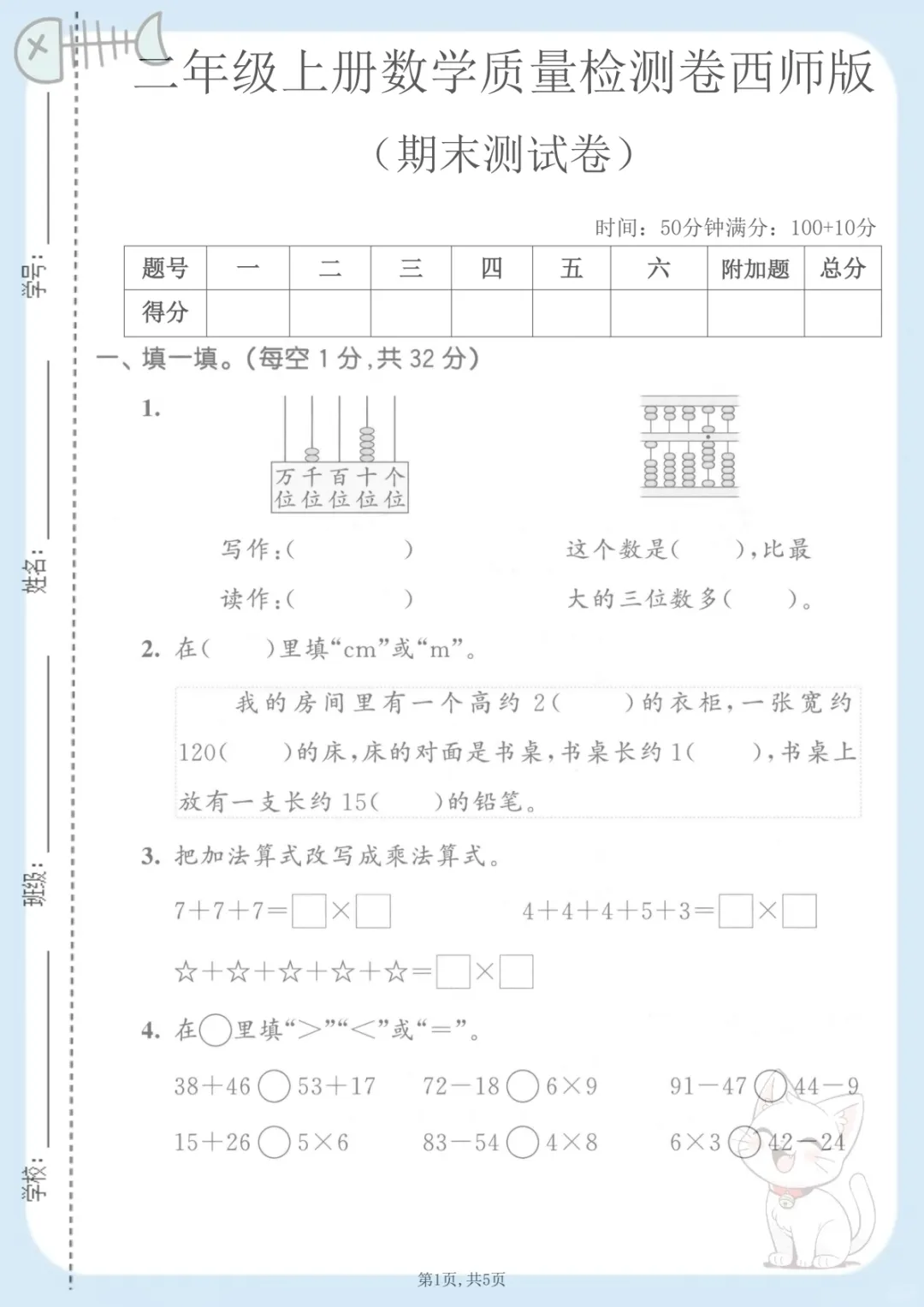 二年级(上)数学期末质量检测卷2《西师版》,共5页,电子版可下载可打印,这份期末质量检测卷紧扣二年级上册数学学习内容,适合孩子在期末阶段进行系统自测与查漏补缺,资料涵盖多个核心知识点与专项训练内容,帮助孩子巩固基础、规范答题思路,进一步提升综合运用能力。需要的家长可以及时下载打印出来,让孩子认真练一练,为期末复习做好准备。