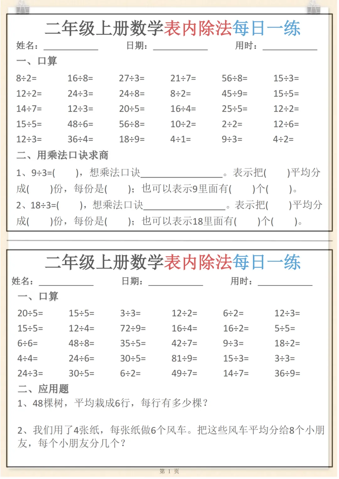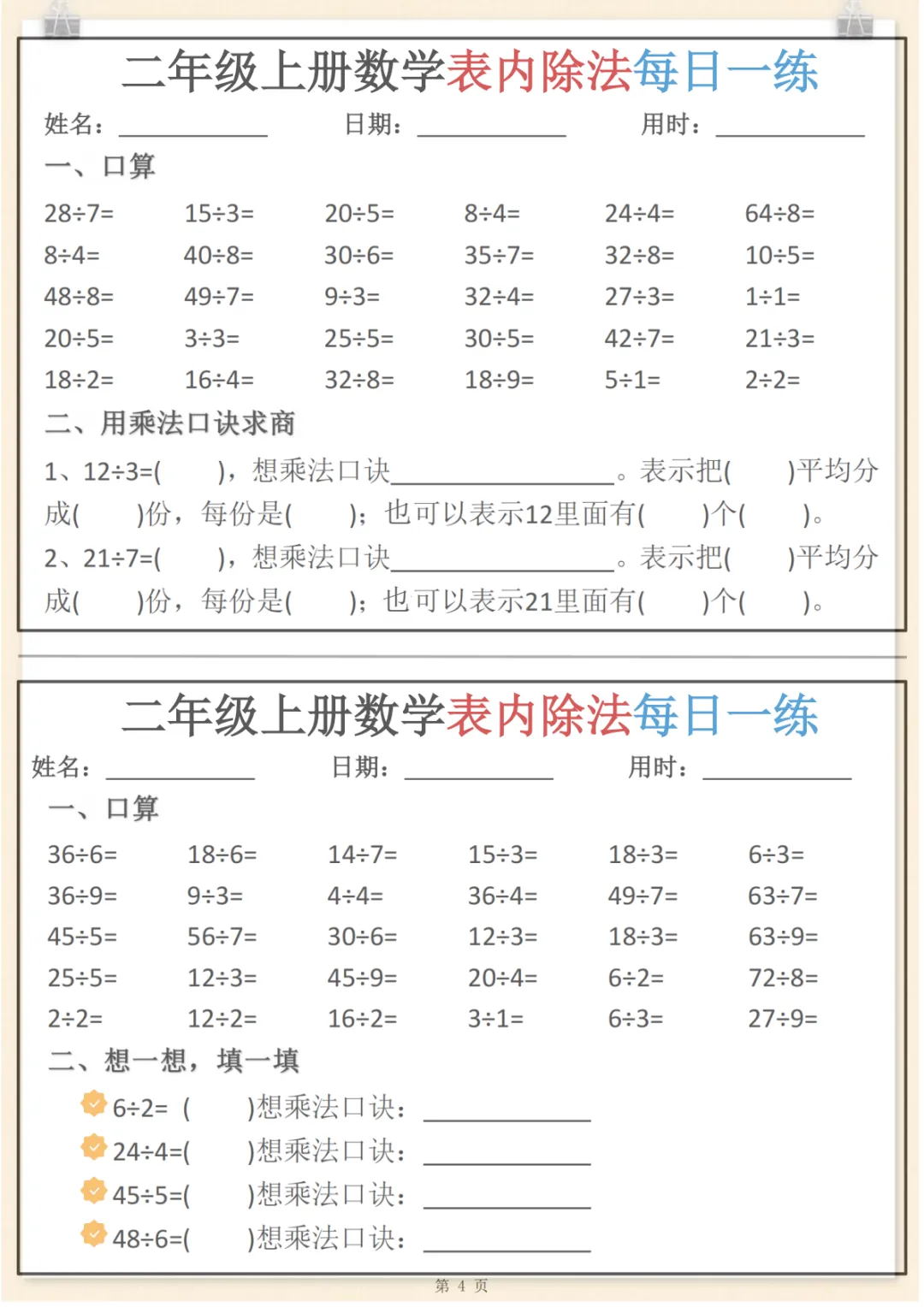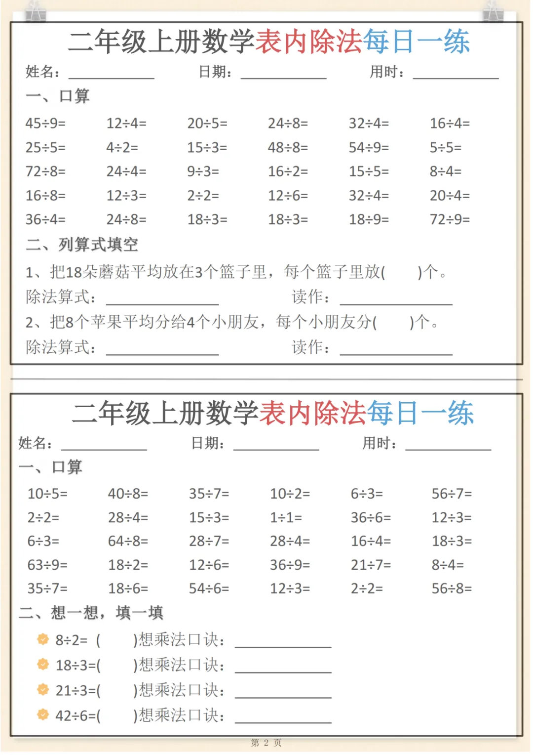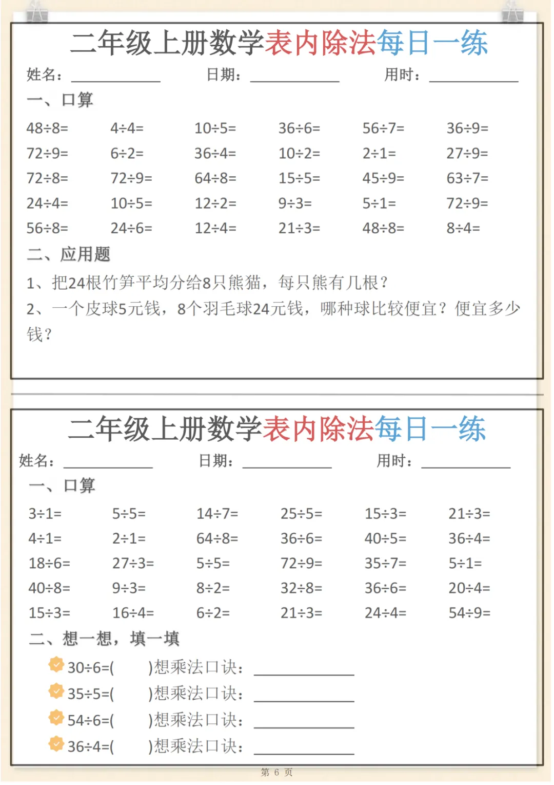 二年级(上)数学表内除法每日一练小纸条,共6页,电子版可下载可打印,这份资料围绕二年级上册数学表内除法训练设计,适合孩子进行日常巩固与同步练习,涵盖表内除法计算、基础应用及多个核心知识点与专项训练内容,帮助孩子在反复练习中夯实基础、提升计算熟练度与解题能力。需要的家长可以赶紧下载打印出来,让孩子每天练一练。