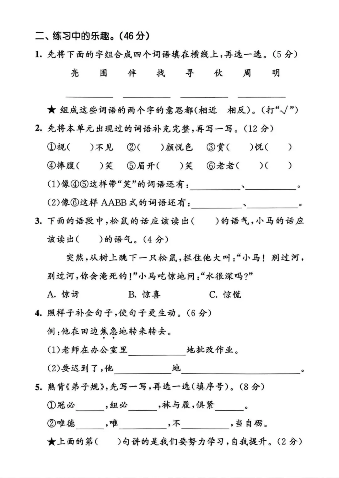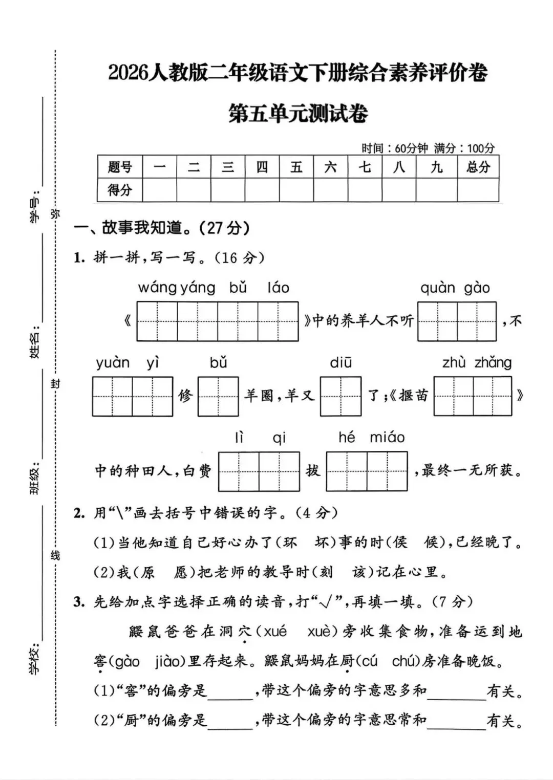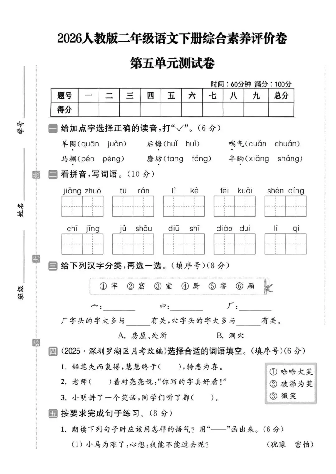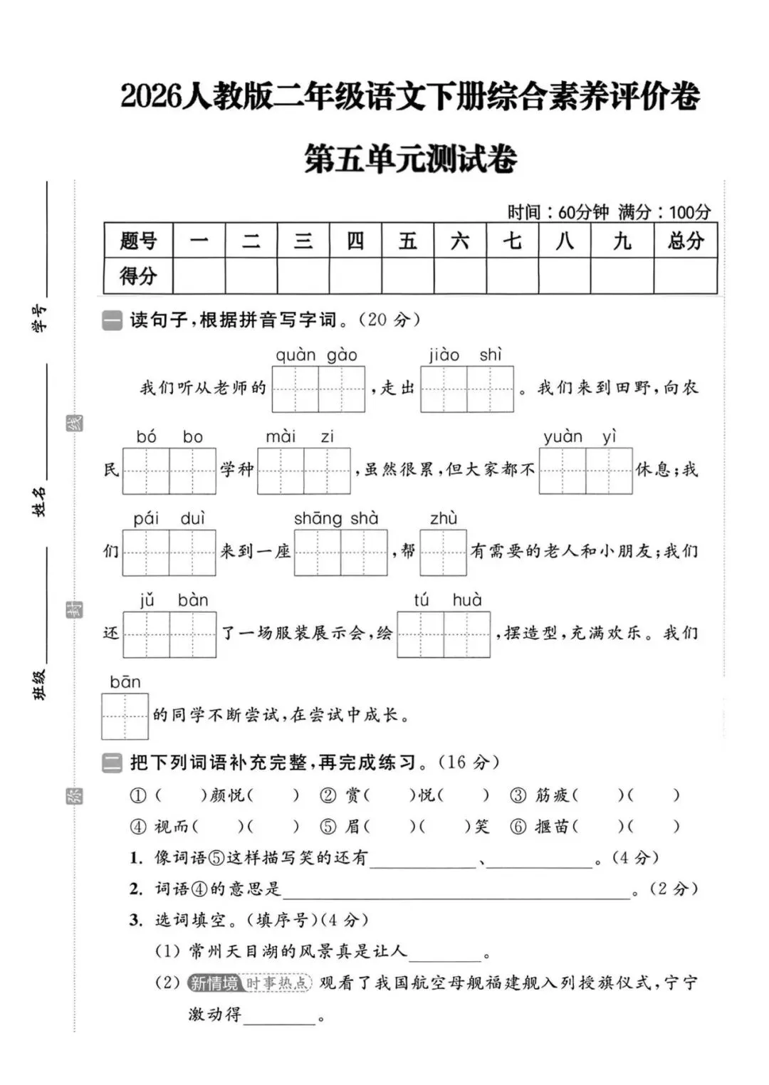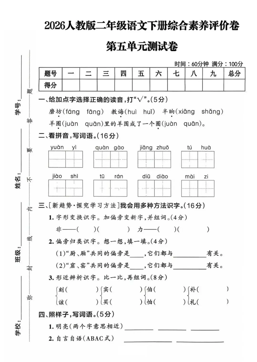 大家好,我是小敏妈妈,今天为大家分享的是;2026学年春人教部编版《二年级下册语文第五单元质量检测卷共5套》,附答案,高清电子版可打印,有word版可编辑