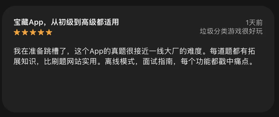 “我在准备跳槽了,这个App的真题很接近一线大厂的难度。每道题都有拓展知识,比刷题网站实用。离线模式,面试指南,每个功能都戳中痛点。”