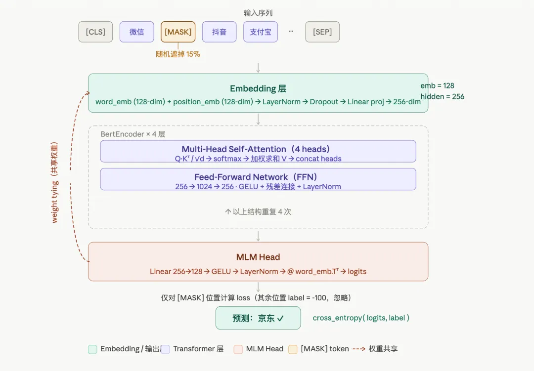 模型不大,8M左右的参数量,整体是 embedding 层 + Transformer encoder + MLM Head。