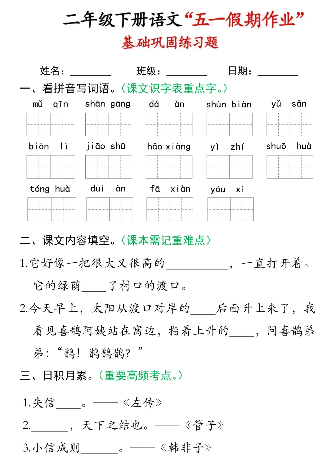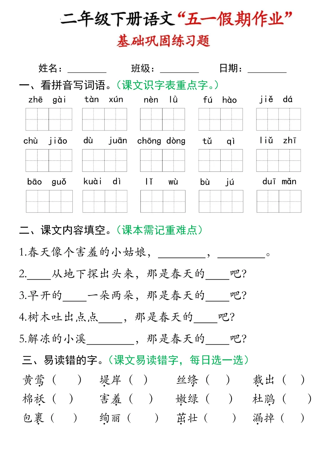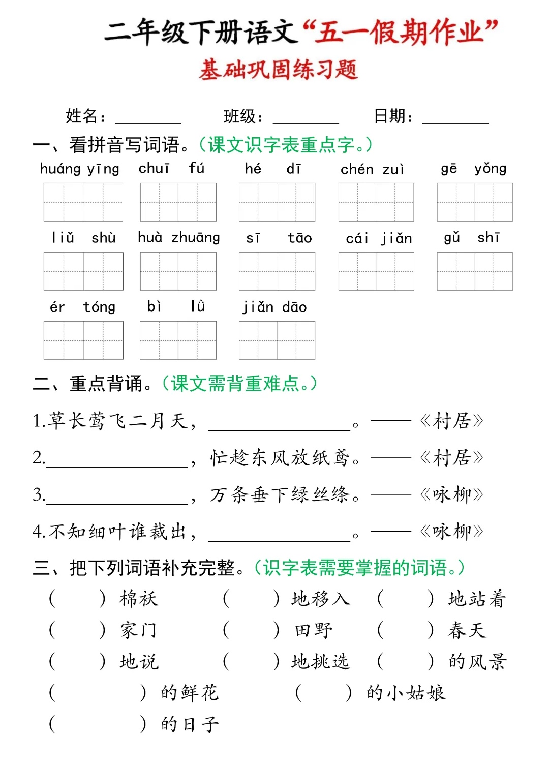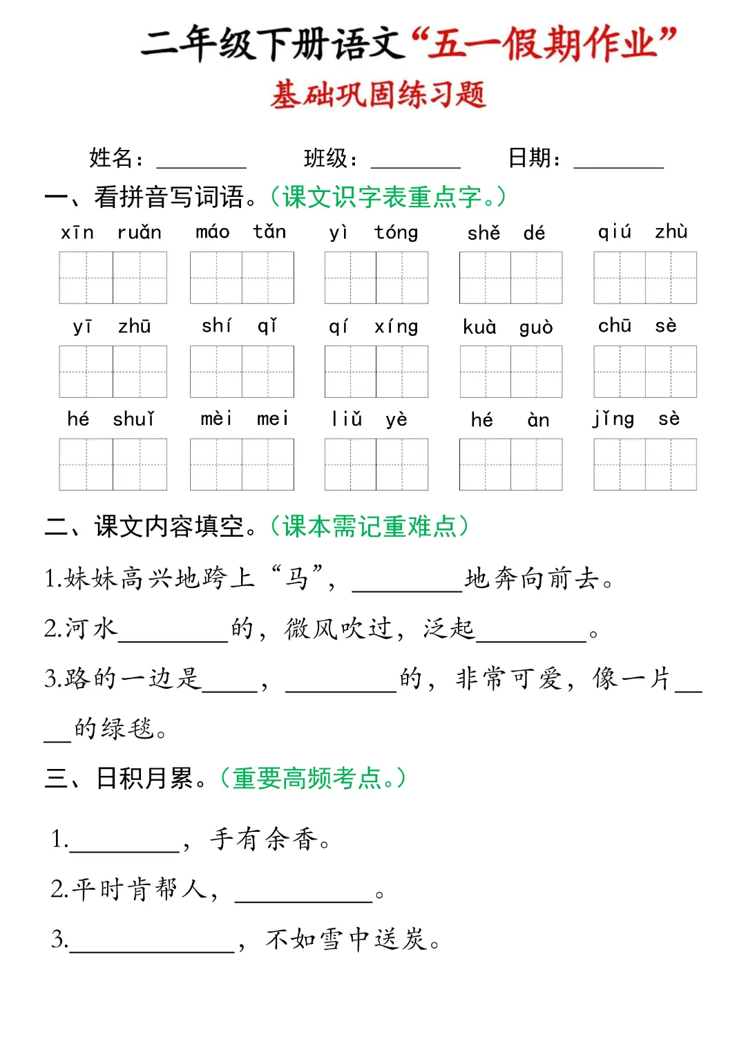 26春新二年级下册语文《五一假期作业》,需要的家长抓紧领取一份给孩子打印🖨️出来,让孩子练一练吧✍🏻欢迎分享到班级群或朋友圈,方便家长打印出来助力孩子高效学习!