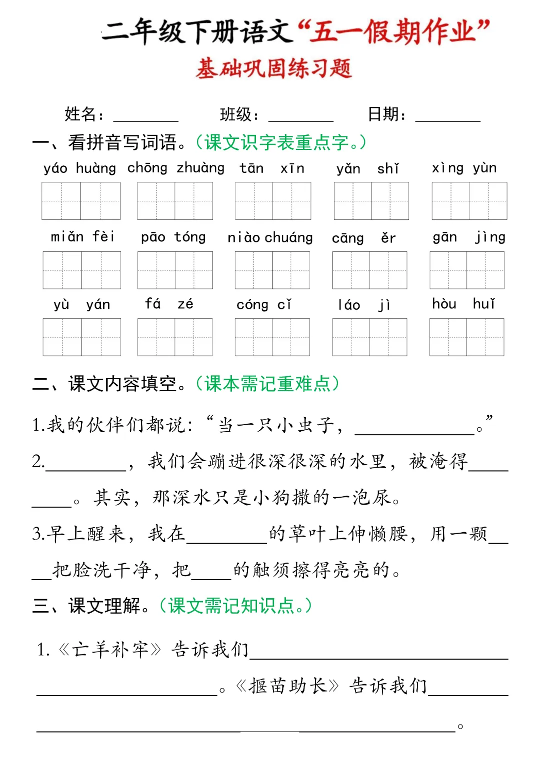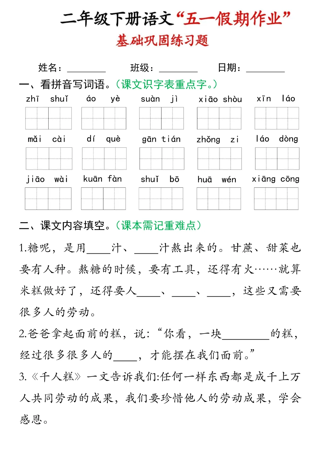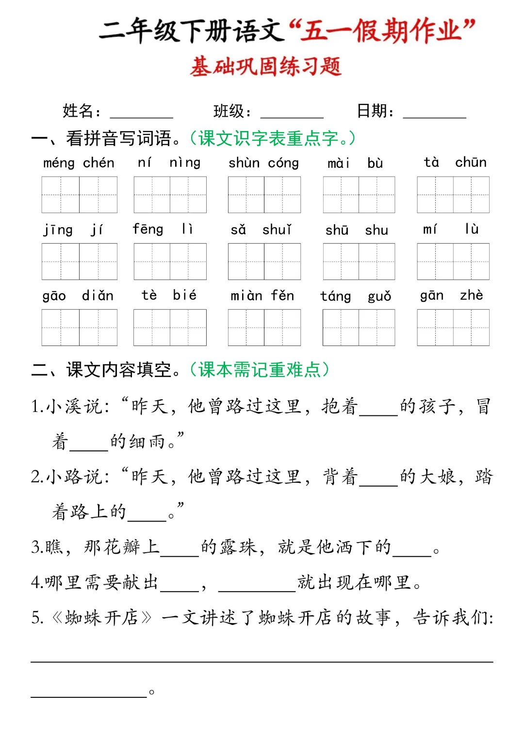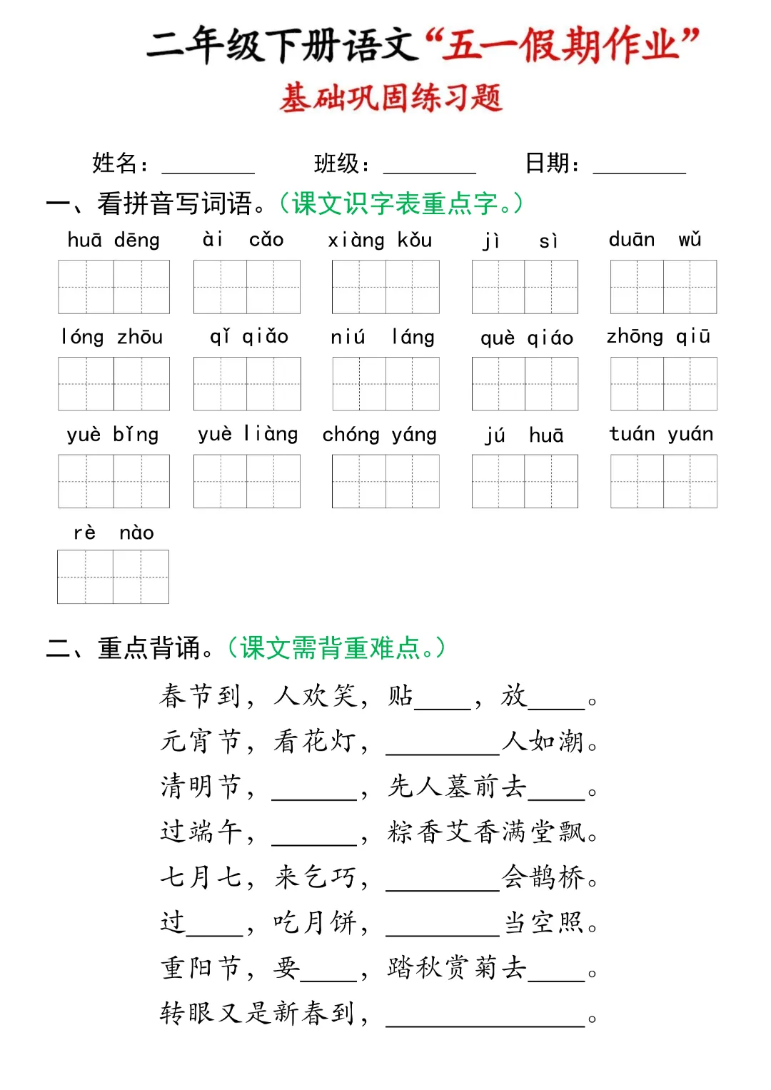 26春新二年级下册语文《五一假期作业》,需要的家长抓紧领取一份给孩子打印🖨️出来,让孩子练一练吧✍🏻欢迎分享到班级群或朋友圈,方便家长打印出来助力孩子高效学习!