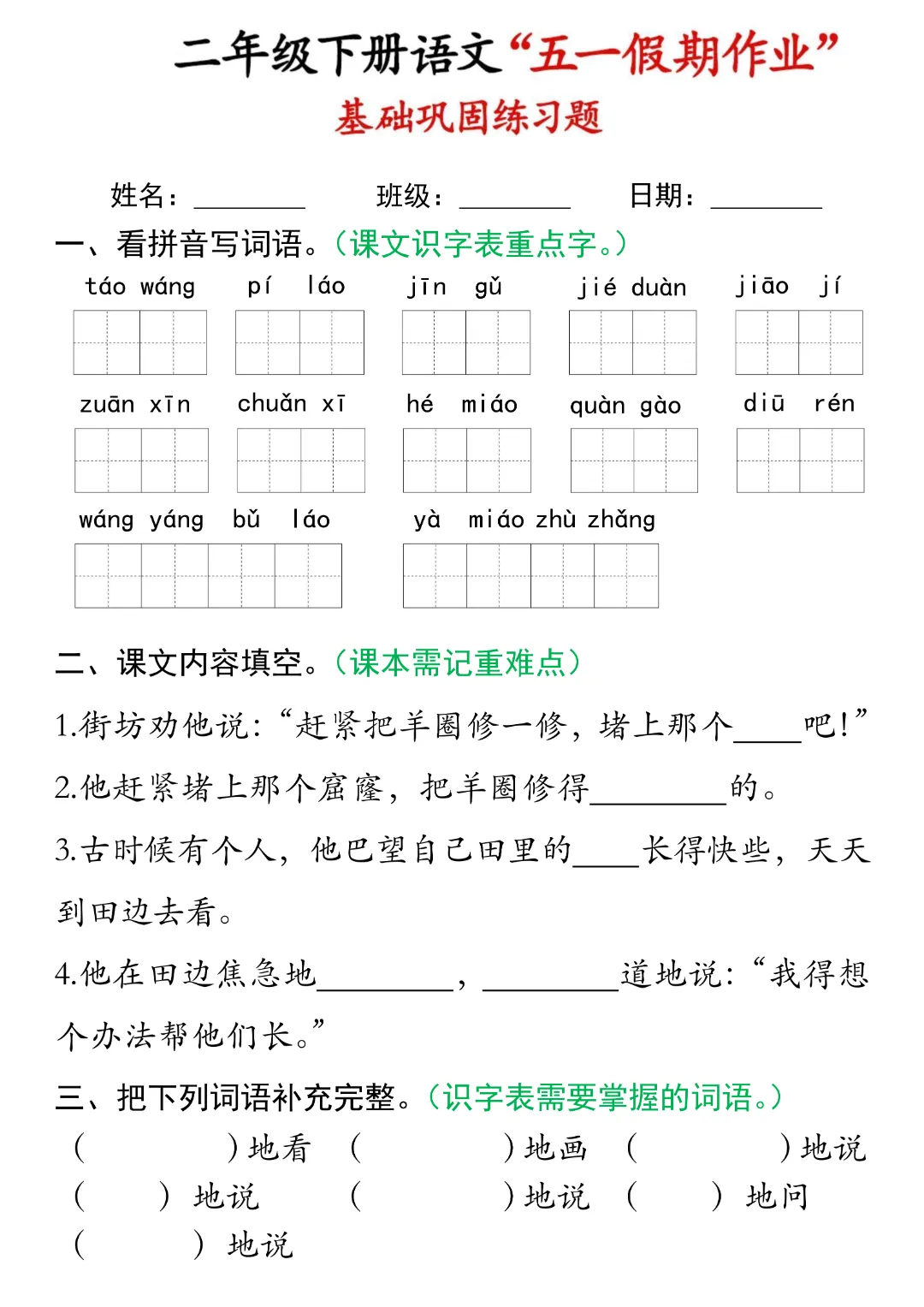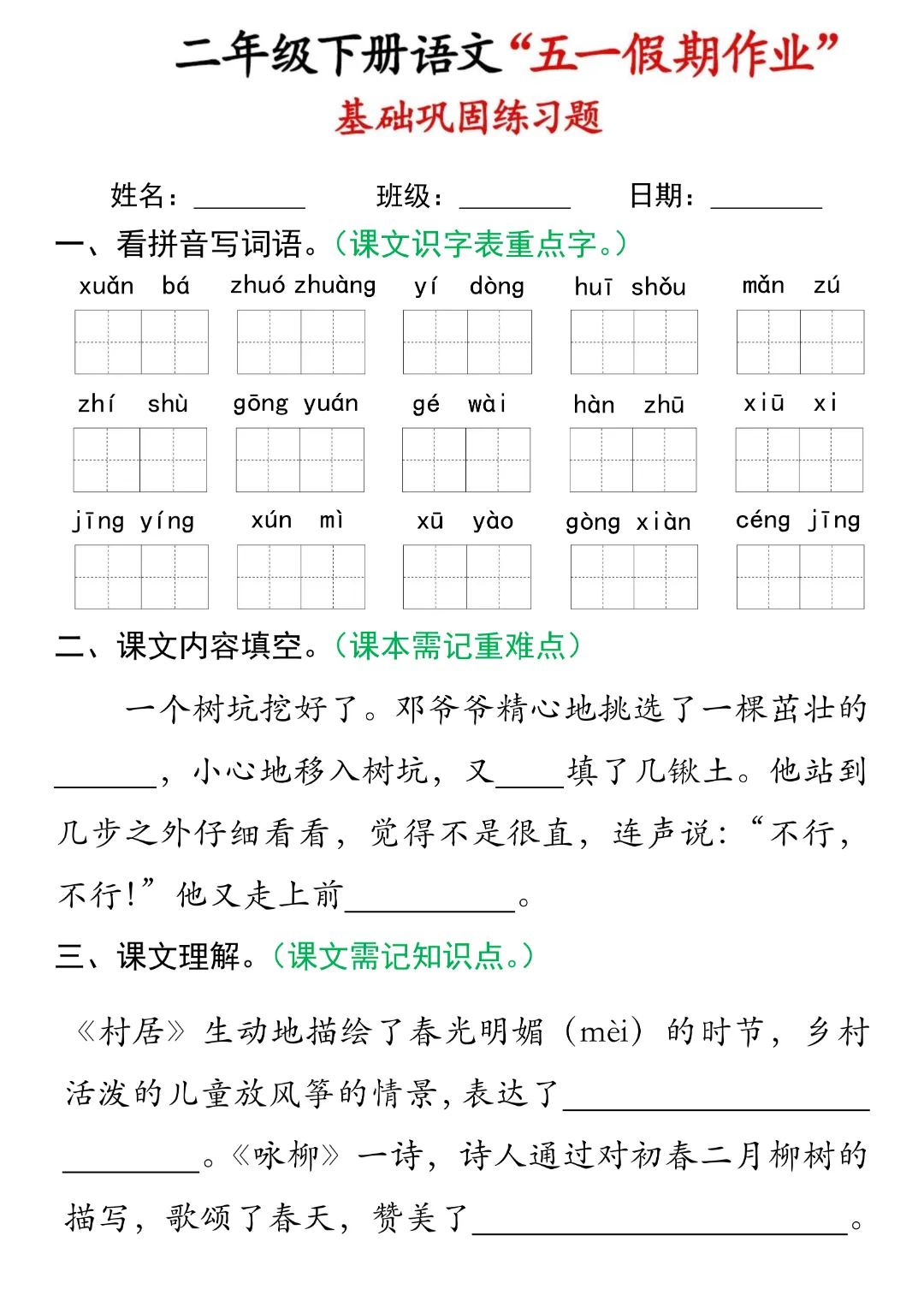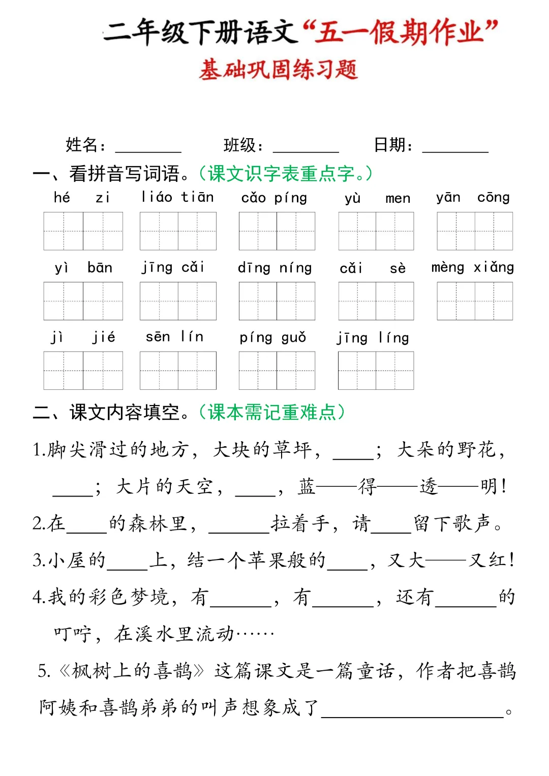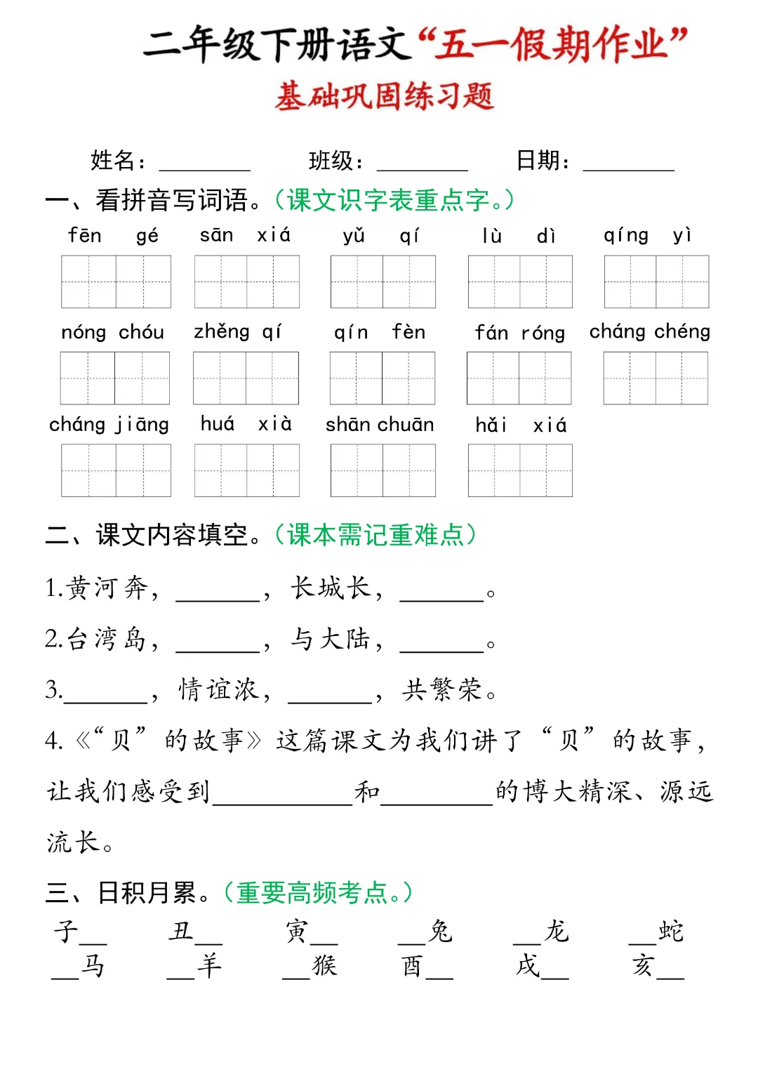 26春新二年级下册语文《五一假期作业》,需要的家长抓紧领取一份给孩子打印🖨️出来,让孩子练一练吧✍🏻欢迎分享到班级群或朋友圈,方便家长打印出来助力孩子高效学习!
