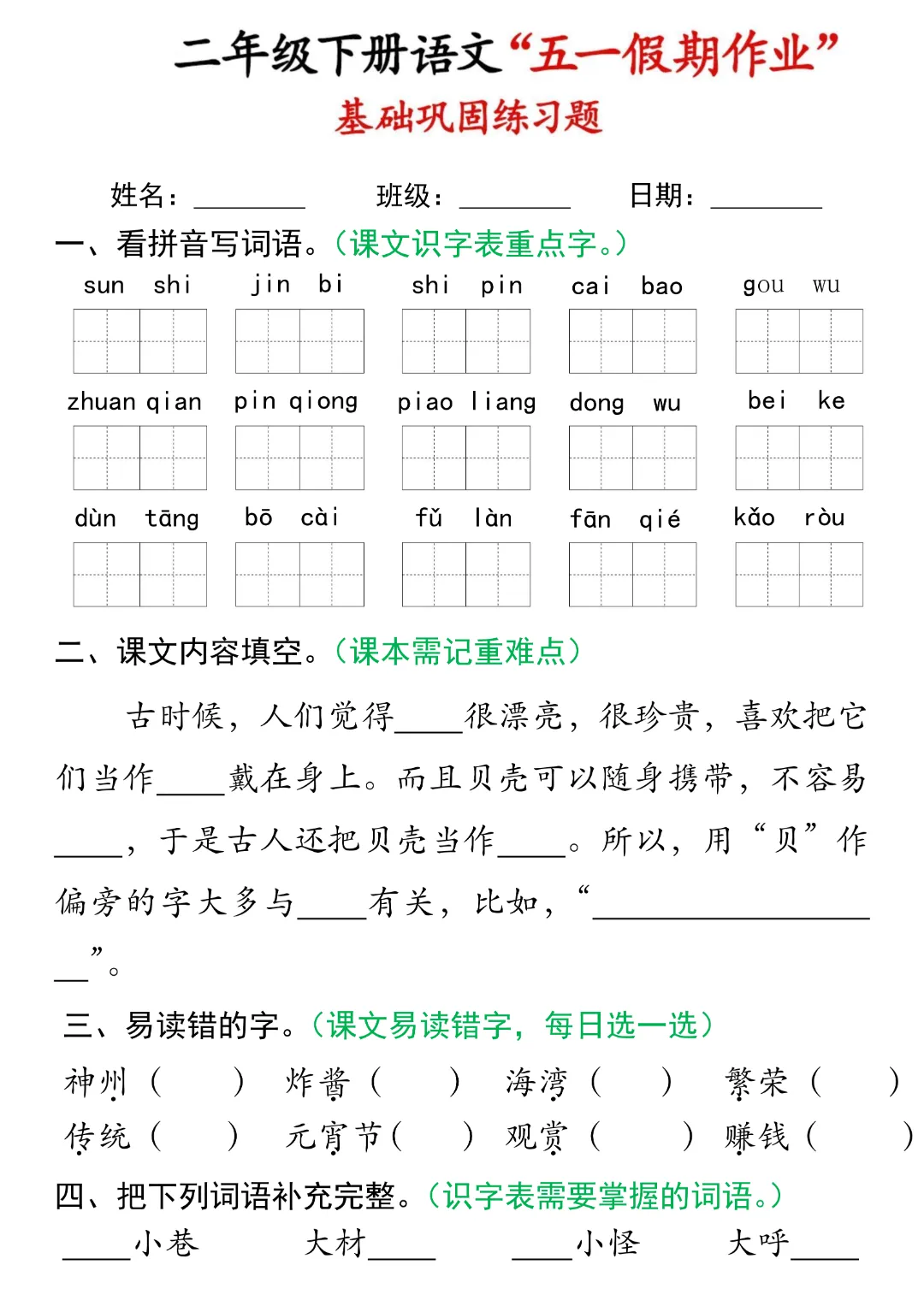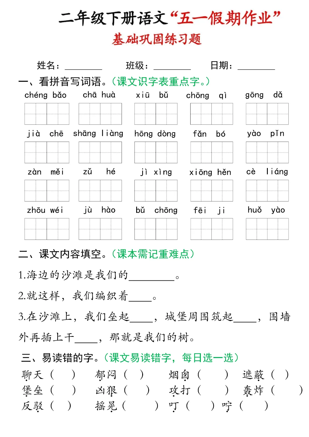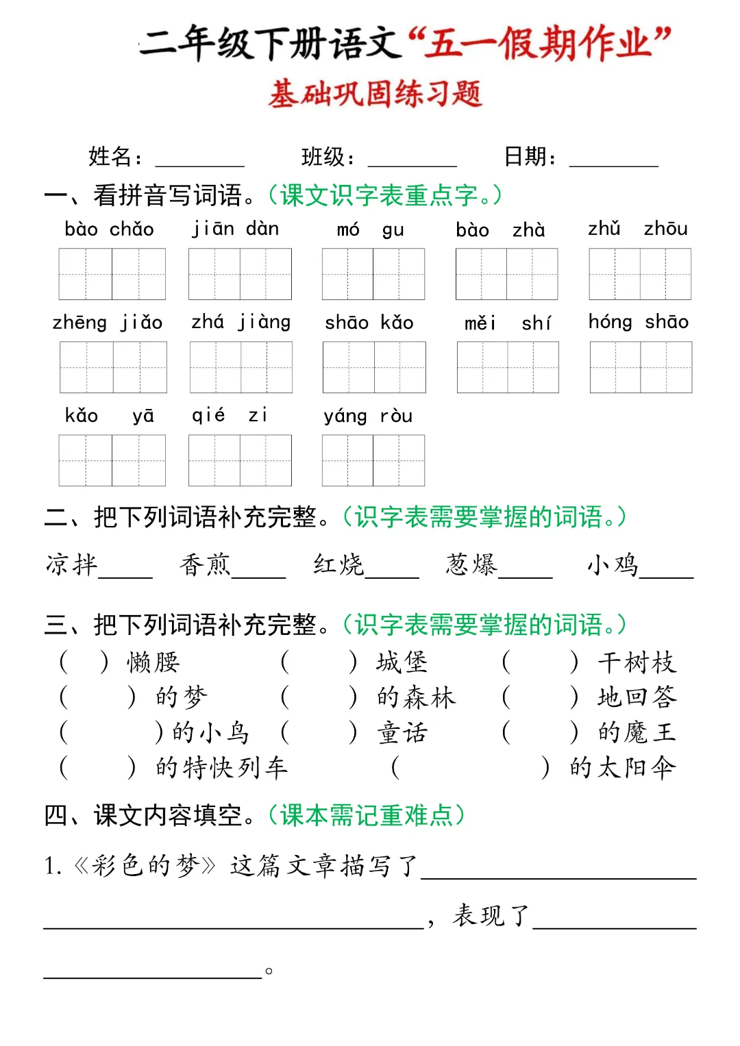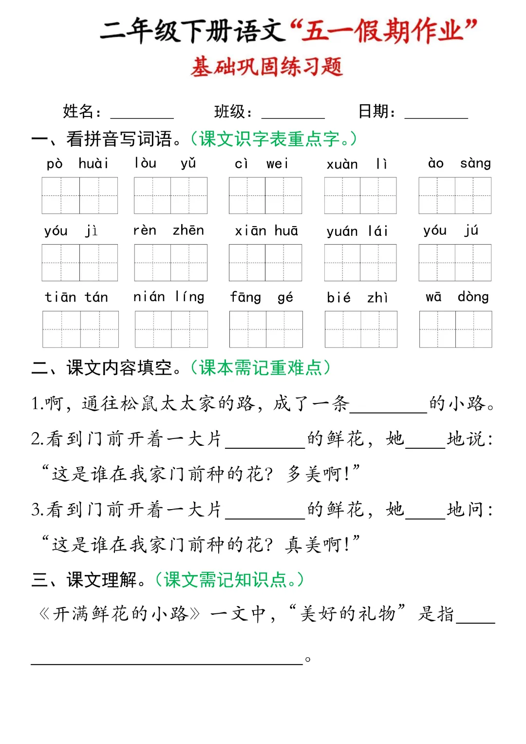 26春新二年级下册语文《五一假期作业》,需要的家长抓紧领取一份给孩子打印🖨️出来,让孩子练一练吧✍🏻欢迎分享到班级群或朋友圈,方便家长打印出来助力孩子高效学习!