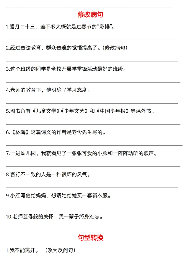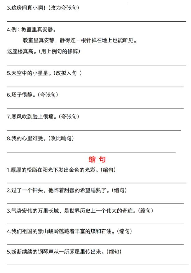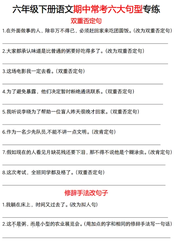 六年级下册语文期中六大句型考点专练,可下载打印