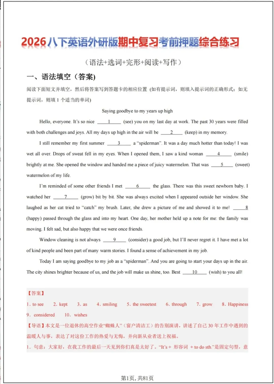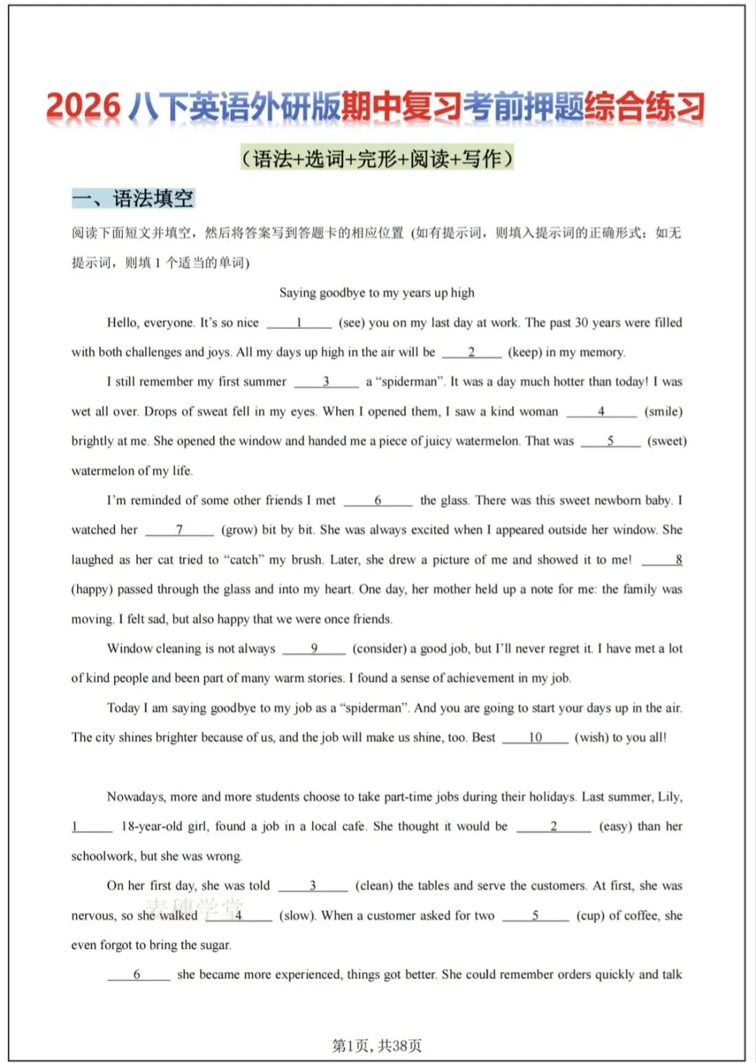 2026新(外研版)八下英语·期中复习考前押题综合练习,电子版可打印!