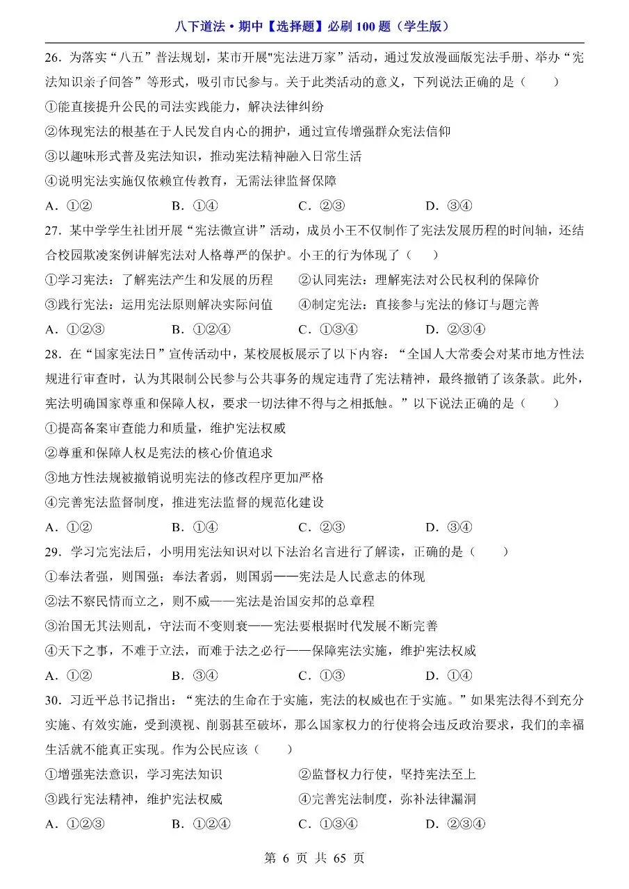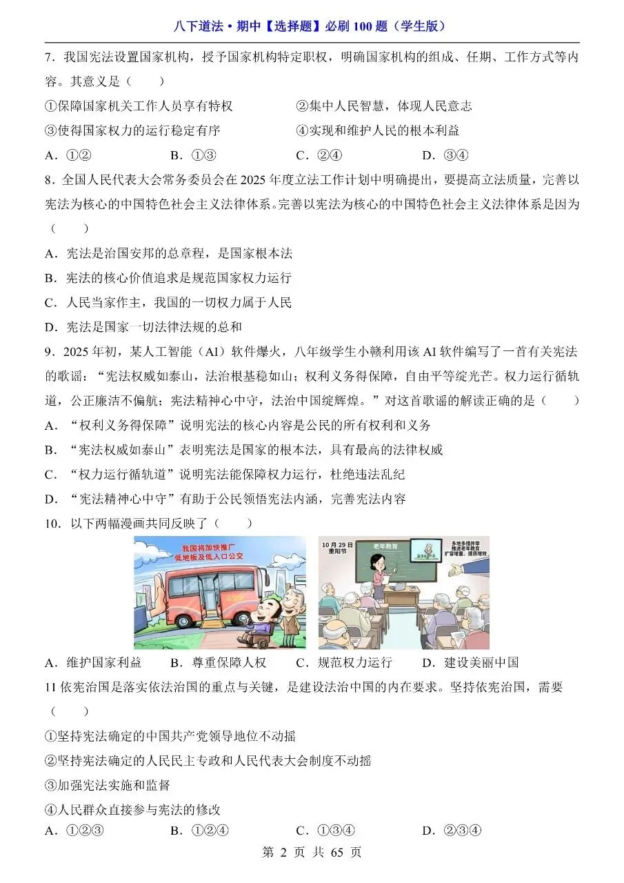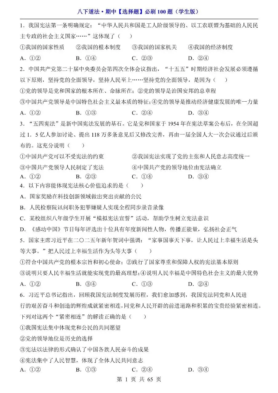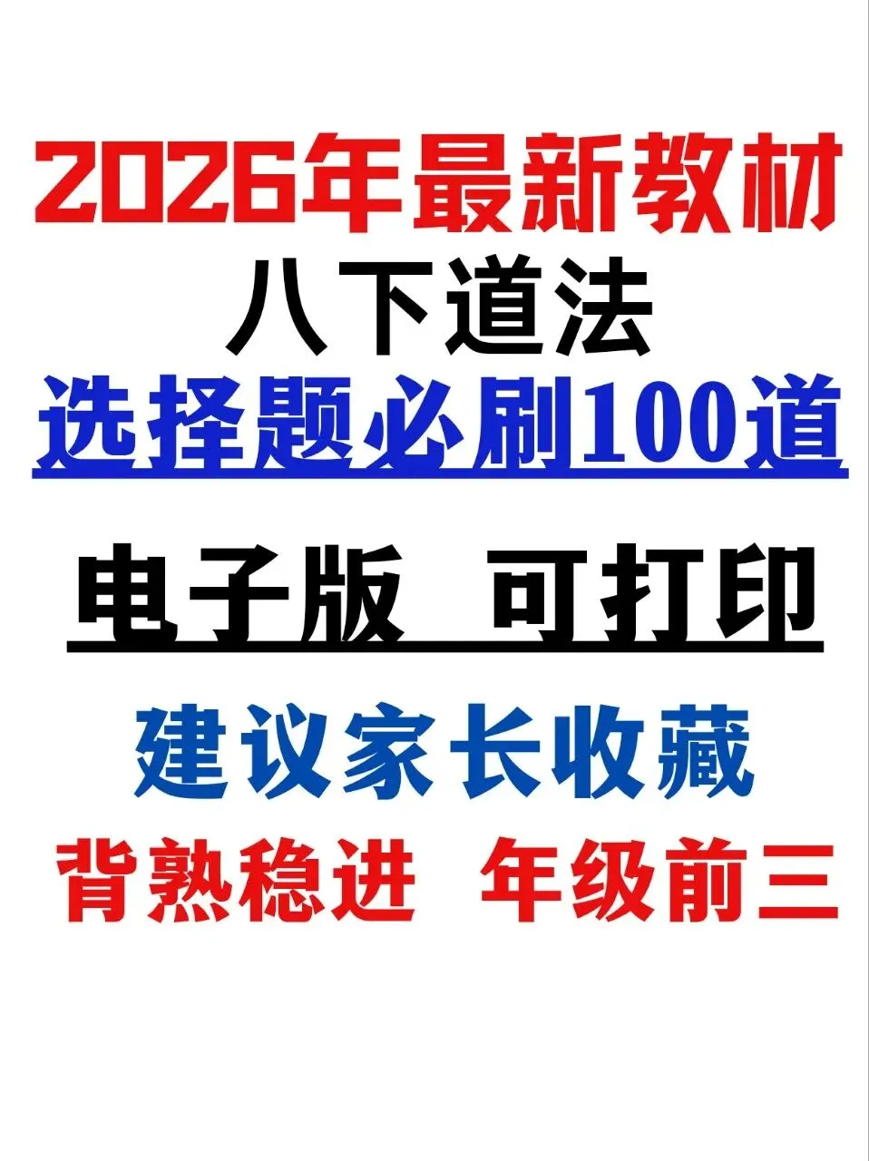 2026年最新版八年级下册道法期中复习选择题必刷100道,有完整可打印,学霸学习好帮手,建议家长打印,学霸人手一份!点击蓝字关注我们!2026年最新版八年级下册道法期中复习选择题必刷100道,有完整电子版可打印,学霸学习好帮手,建议家长打印,学霸人手一份!