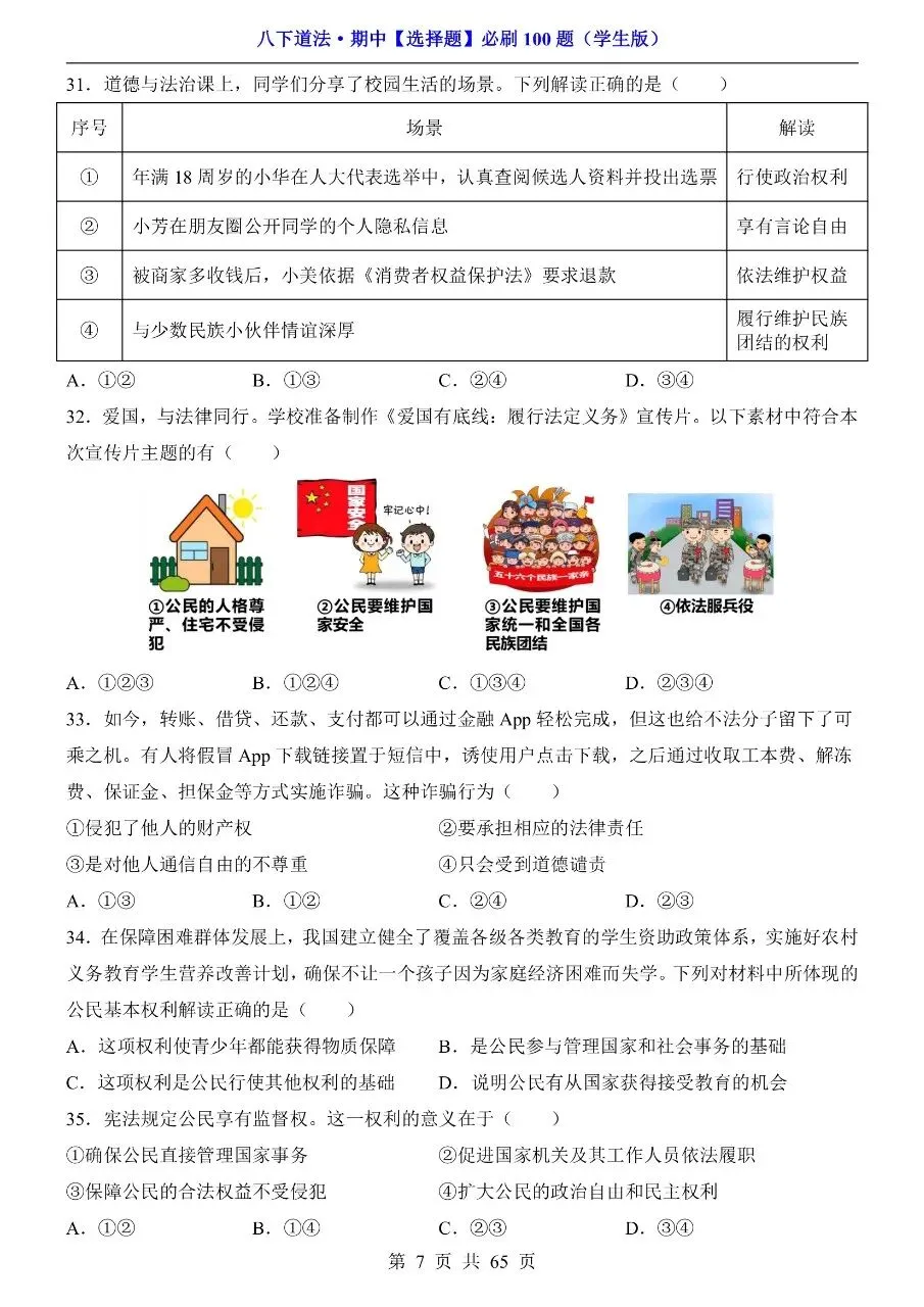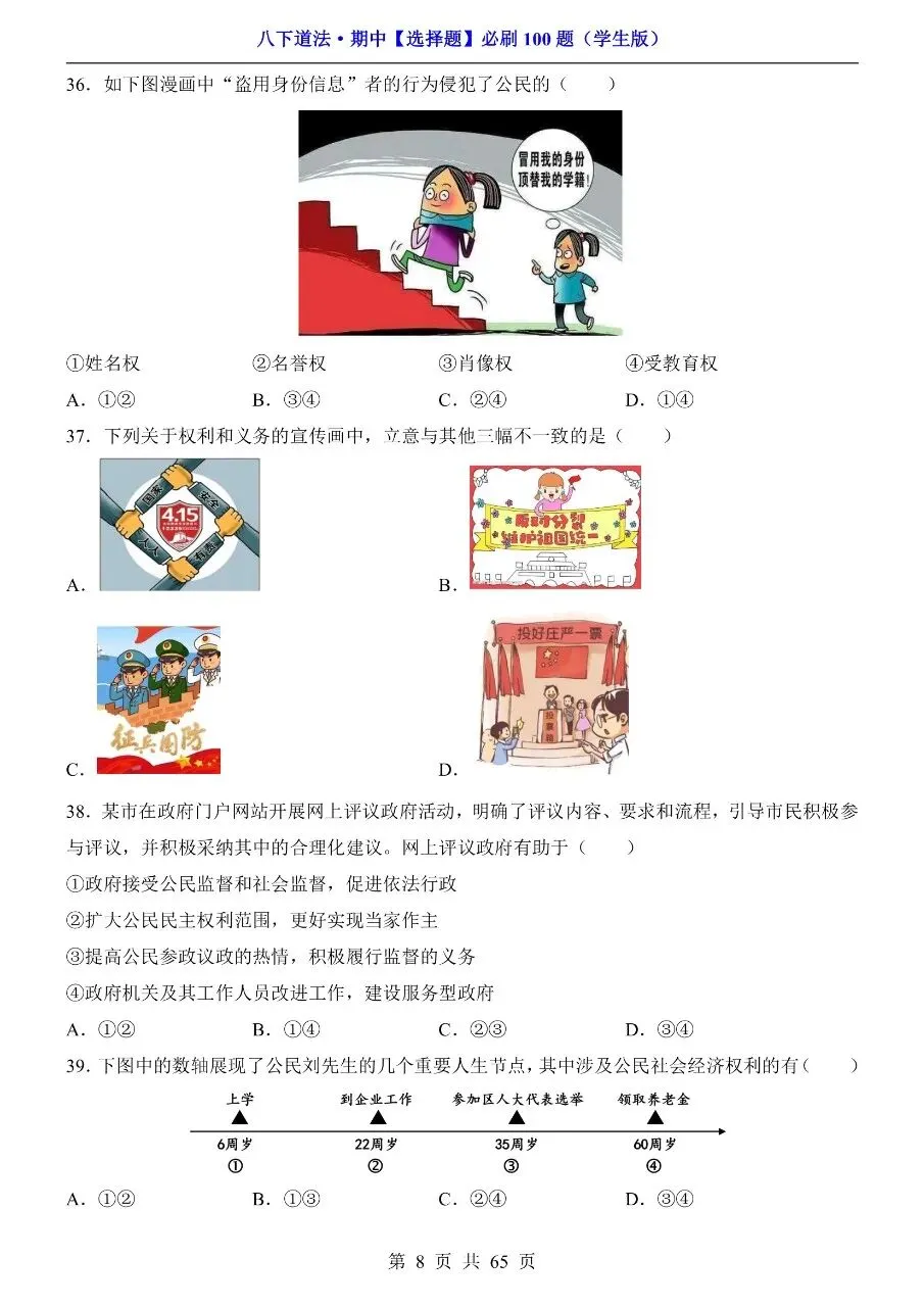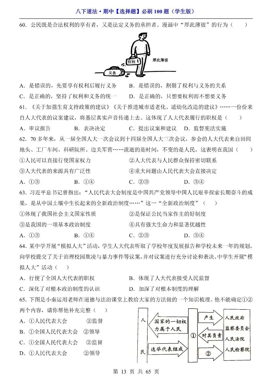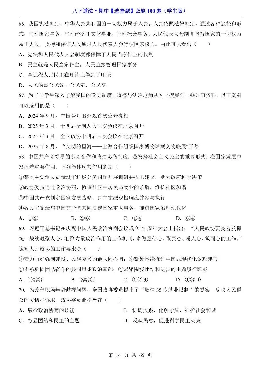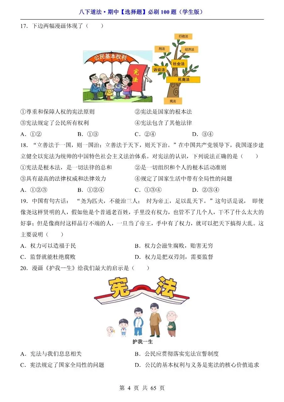 2026年最新版八年级下册道法期中复习选择题必刷100道,有完整可打印,学霸学习好帮手,建议家长打印,学霸人手一份!点击蓝字关注我们!2026年最新版八年级下册道法期中复习选择题必刷100道,有完整电子版可打印,学霸学习好帮手,建议家长打印,学霸人手一份!