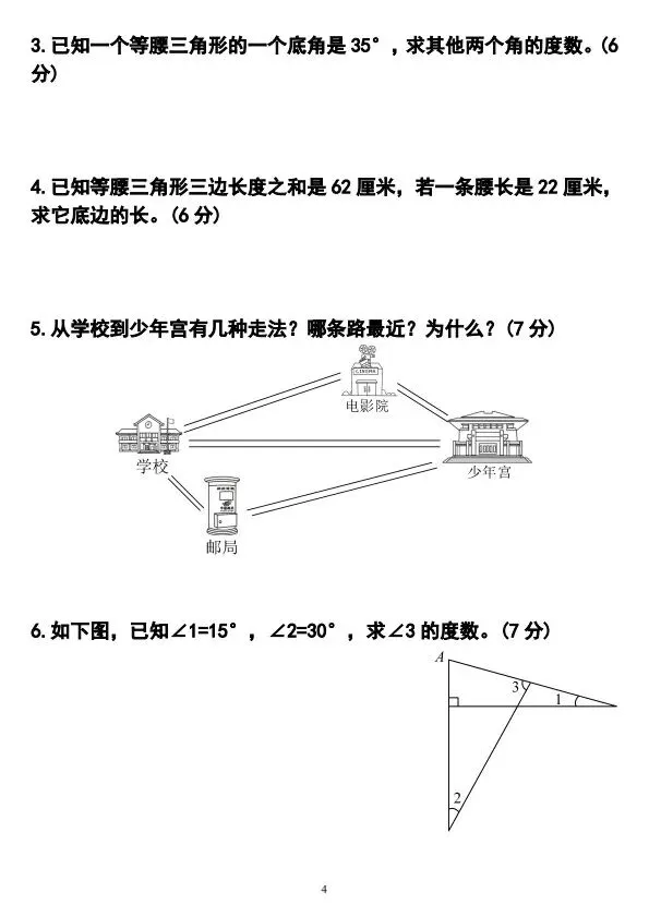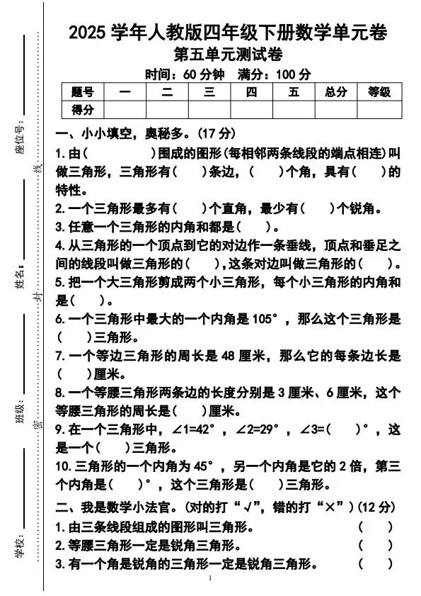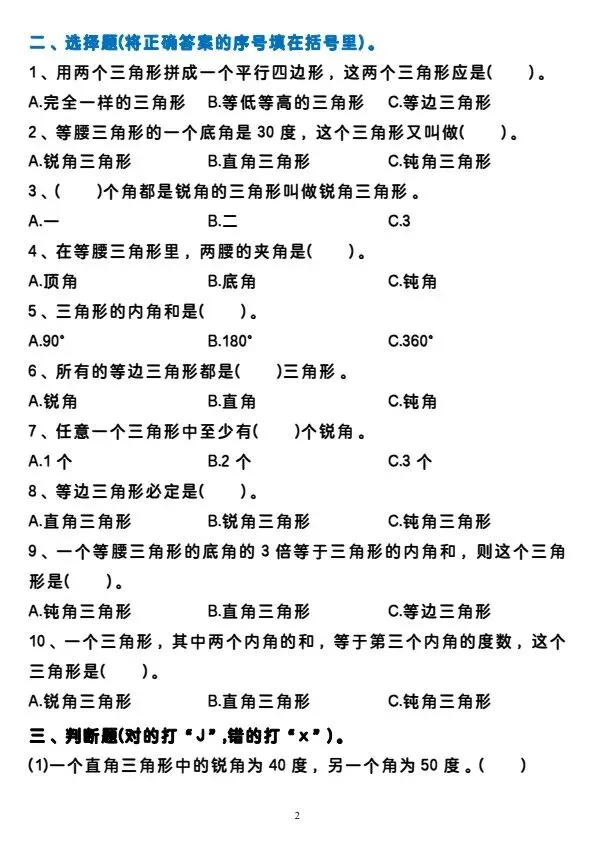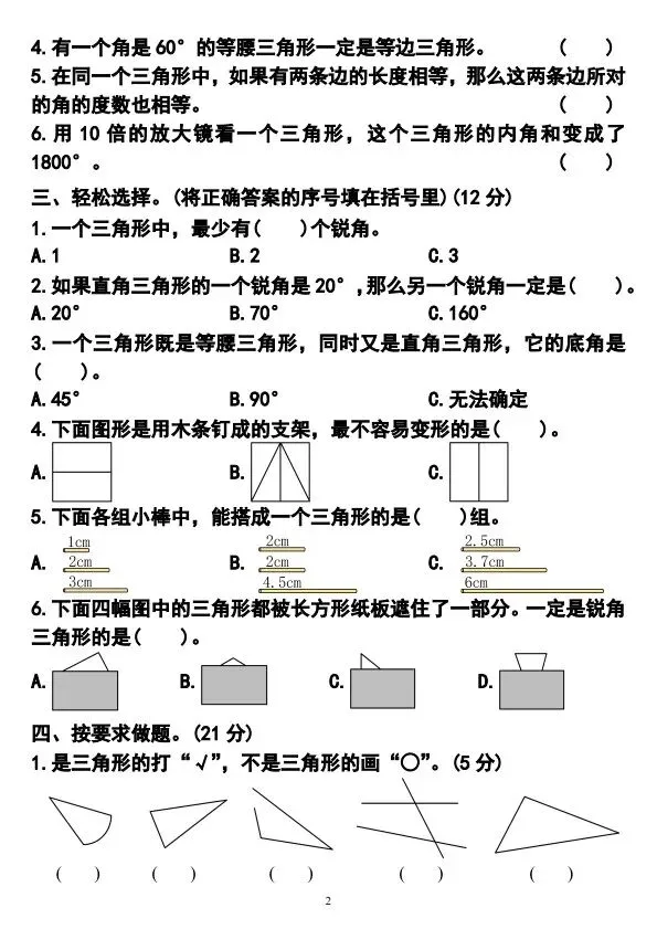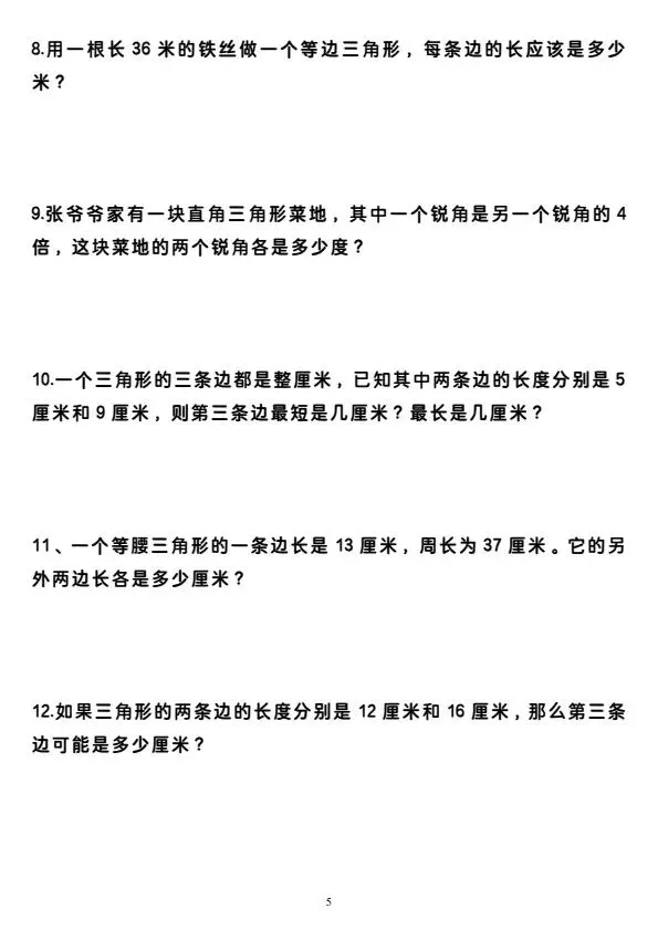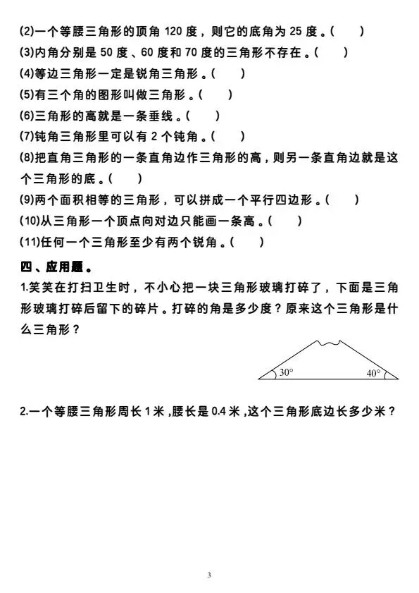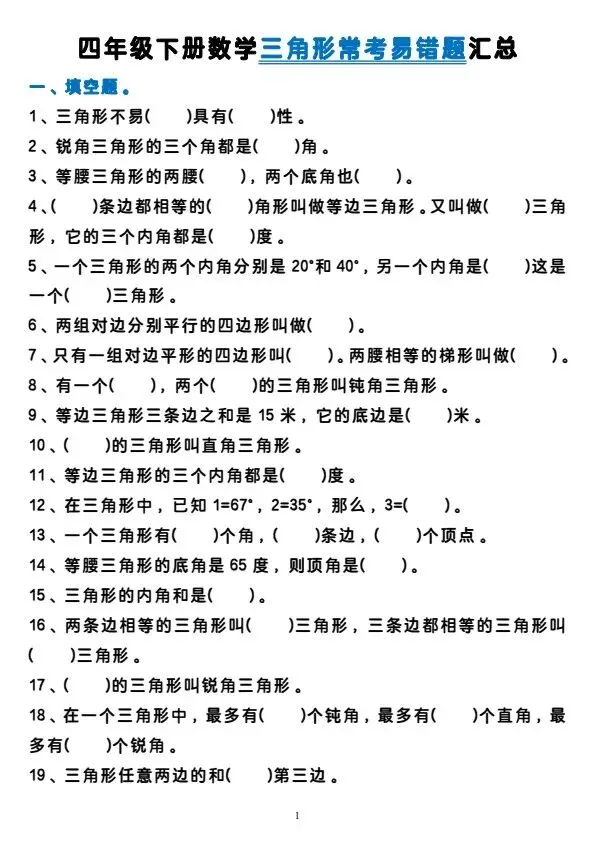 今日分享四年级下册数学三角形常考易错题汇总(完整电子版可打印)!高清电子版可直接打印,排版规整适配练习,不用费心整理,孩子每日一练夯实基础,家长辅导省心!