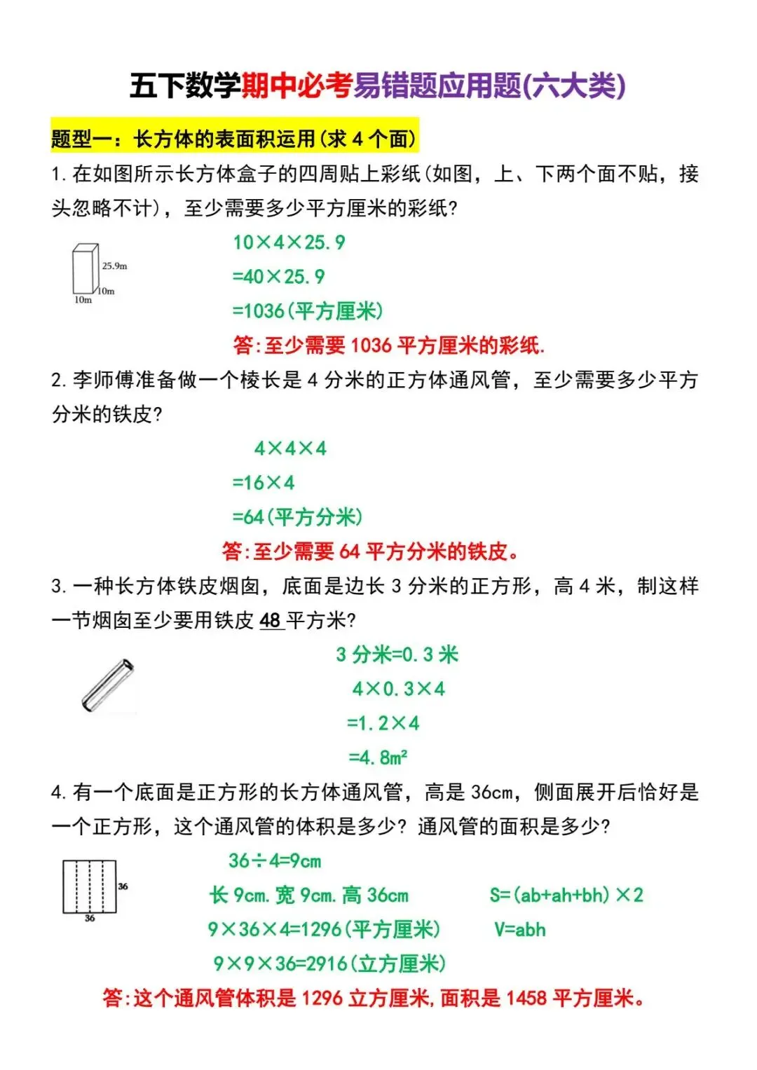 这套 16 页《易错应用题汇总》,聚焦期中高频考点,把长方体表面积、体积计算、增减高 / 切拼问题等六大类易错应用题全部拆解,附详细解题步骤,帮孩子吃透易错题型!