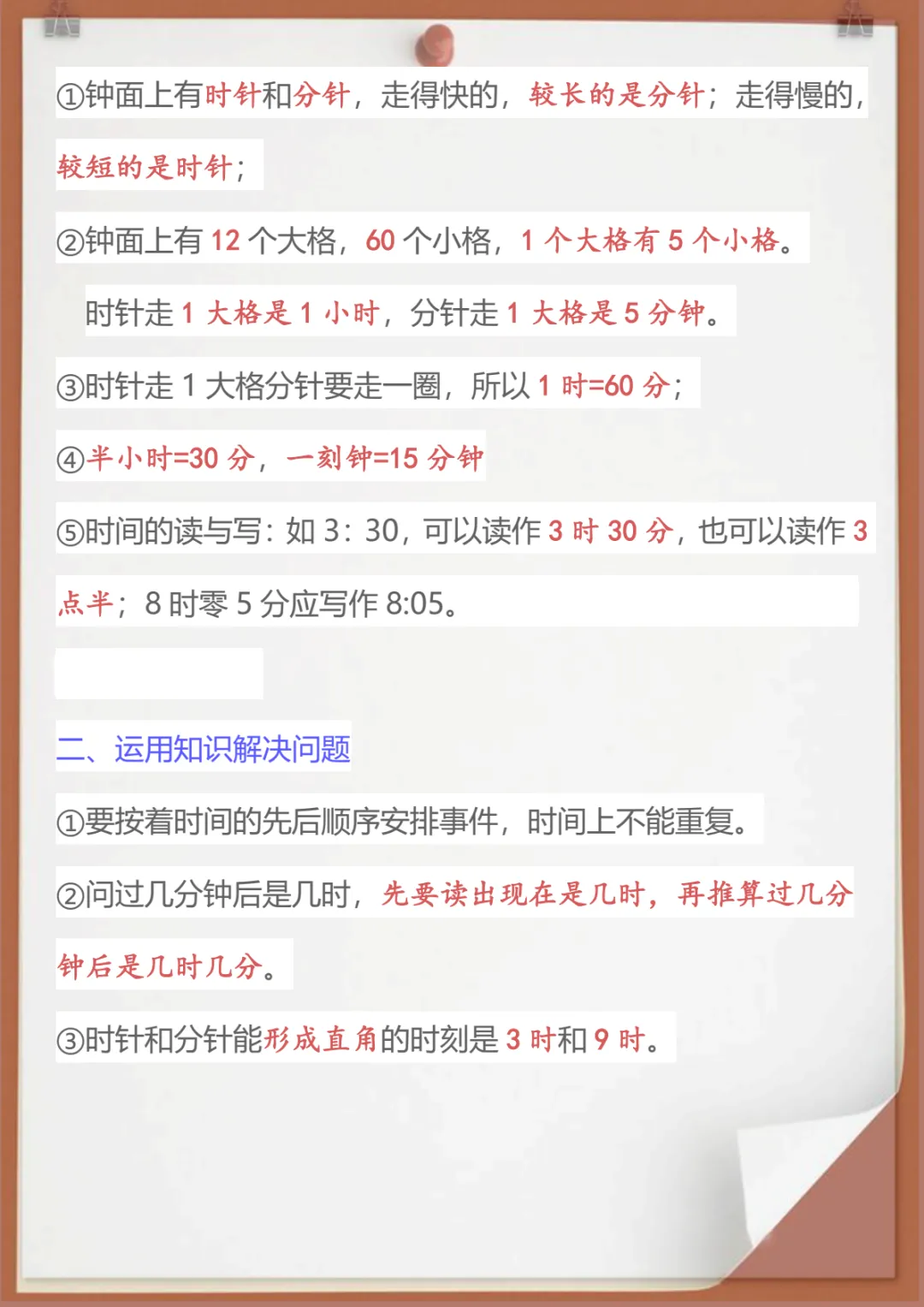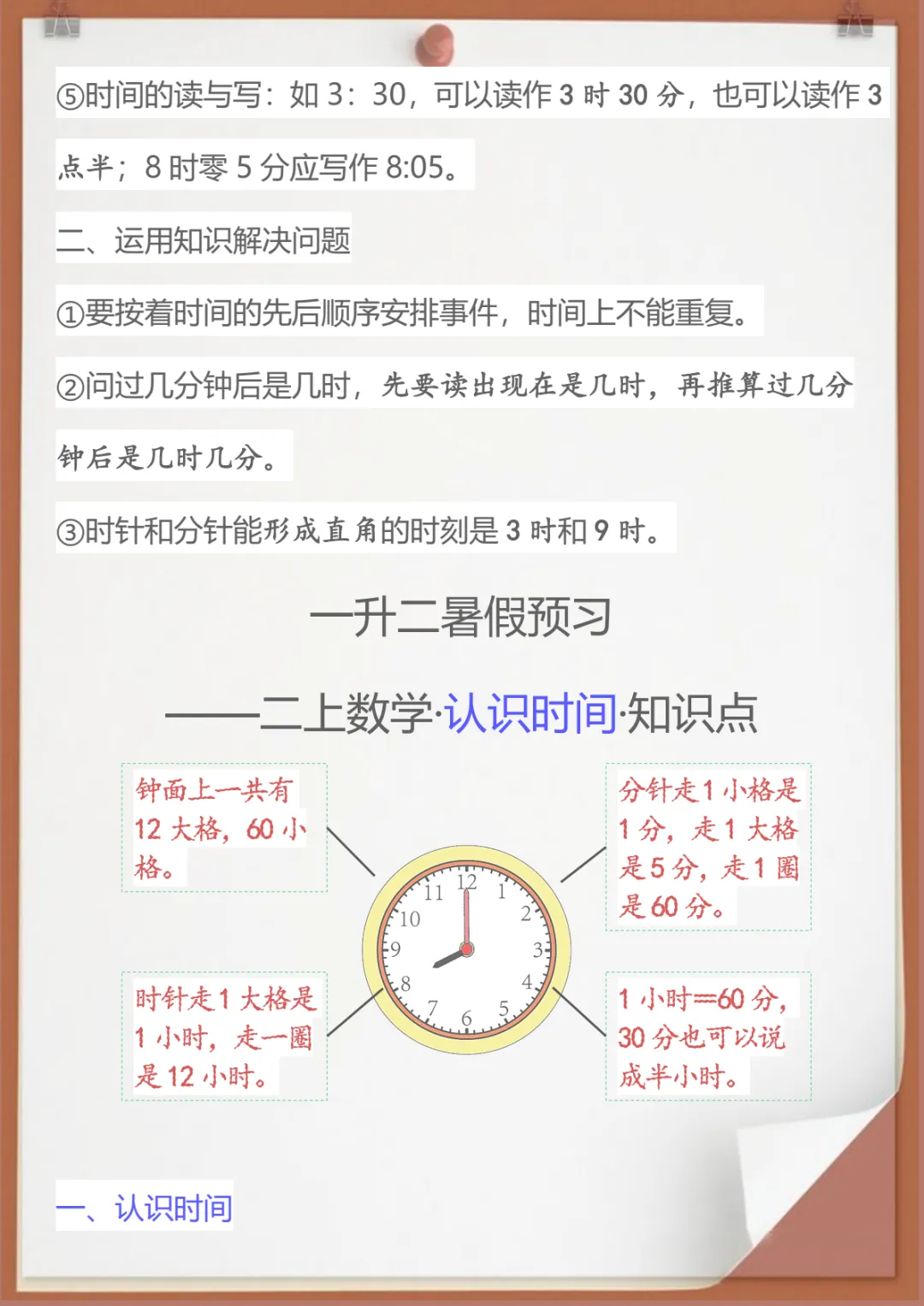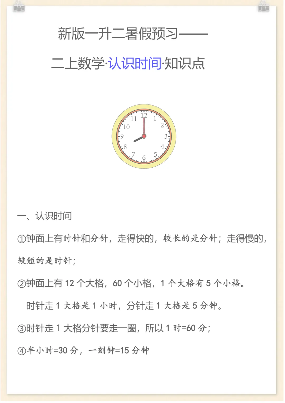 【新版】二年级数学上册认识时间知识点,共3页,电子版可下载可打印,这份资料紧扣二年级数学上册认识时间这一重点内容,帮助孩子进一步理解整时、几时几分、钟面读写及时刻判断等常见知识点,也便于家长在课后进行针对性巩固与复习。内容精炼实用,适合日常练习和查漏补缺,需要的家长可以及时下载打印,陪孩子练一练。
