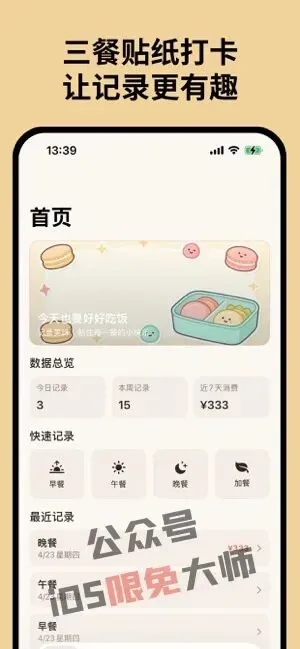 【吃饭记录 】一款吃饭记录工具。把每一餐变成贴纸,记录三餐、复用素材、查看统计、生成海报,一边打卡一边收藏你的饮食日常。