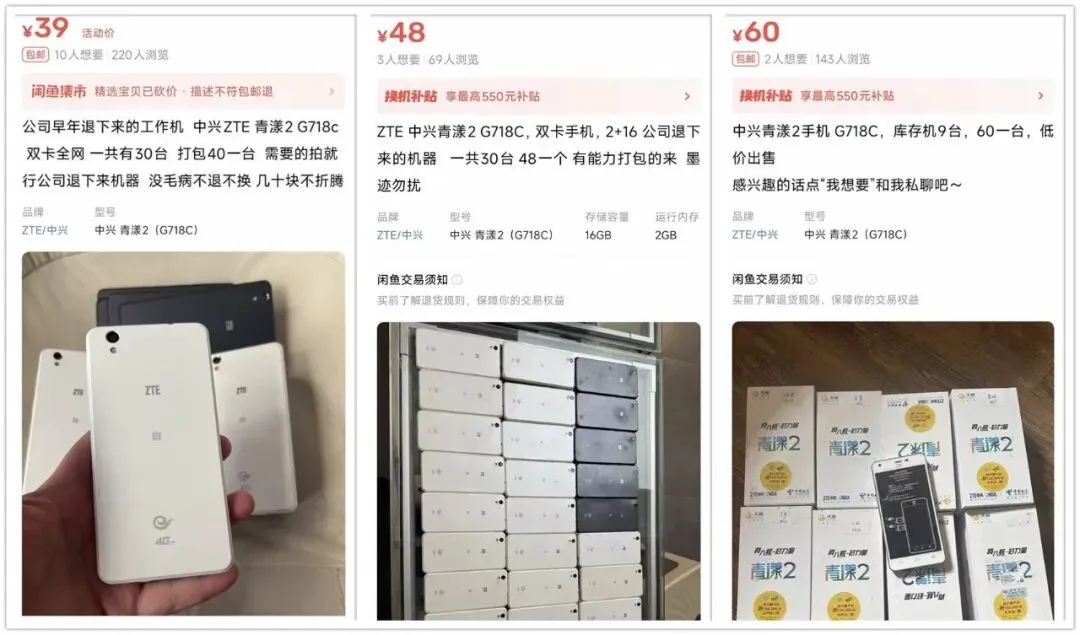 大量中兴4G手机流入闲鱼!二手39块,还是电信定制版最近几年,由于抖音等短视频太占用碎片化时间,有极强的成瘾性,使得“戒网手机”慢慢火了起来。所谓戒网手机,说白了就是单纯打接电话的功能机,但为啥十多年前诺基亚那种不行?因为那是2G或3G手机,现在基本用不了。而在近期,我发现大量中兴青漾2手机流入闲鱼,既有公司淘汰下来的工作机,又有全新库存机。于是去研究了一下,发现这不就是戒网手机么,因为它居然支持4G。根据查证,中兴青漾2的具体型号是G718C,首发于2014年8月,属于当时第一批电信4G定制机,背面打上了天翼的LOGO。虽然它是双卡双待手机,但联通只支持2G/3G,移动只支持2G,目前部分城市核心地段还有移动2G,因此最多是电信4G+移动2G的组合。它的配置一听就很有年代感了,采用了5英寸TFT触摸屏,分辨率是1280x720,搭载高通骁龙MSM8926处理器,存储组合是2G+16G,前置500万摄像头。这正脸不说是公模外观,当年也是被用烂了的设计。我曾用过的vivo X3也长这样,无非是“三大天王键”的左右键顺序对调了一下。至于安卓系统版本,还是古老的4.4.2,就算装了抖音都会卡死,索性可以“物理戒网”(苦笑)。此外内置2300mAh电池,顶部有3.5mm耳机孔,插根耳机当个MP3也还行。至于价格,二手的中兴青漾2卖39元包邮,直接怼到了闲鱼最低价,一共有30台。后来我还查到它有全新库存机,标价60元包邮,连出厂膜都在,看来仓库钥匙找到了。总之,现在电商卖的飞利浦、朵唯、诺基亚等4G功能机也要一两百,如果正巧是用电信卡且就想打接电话,那不如找这种老款的安卓4G手机。