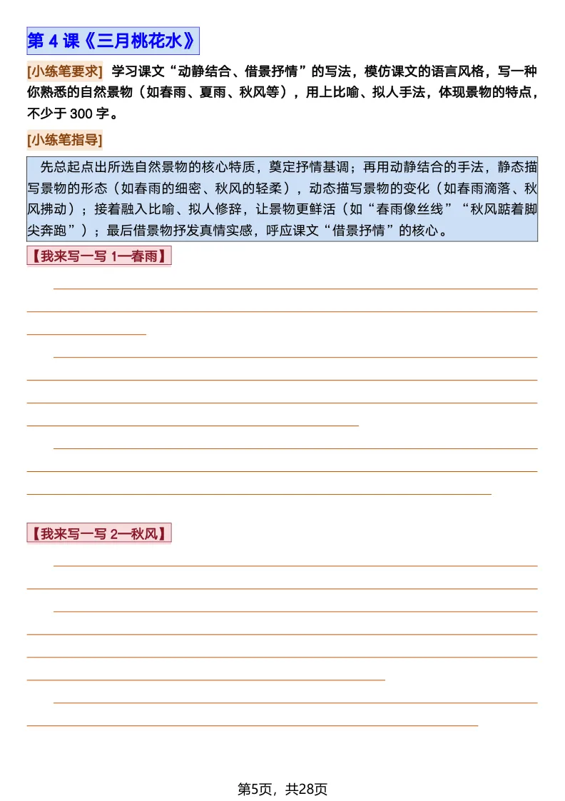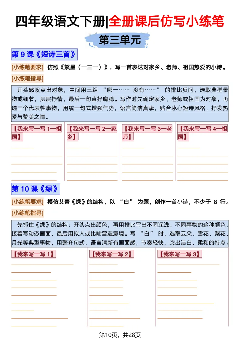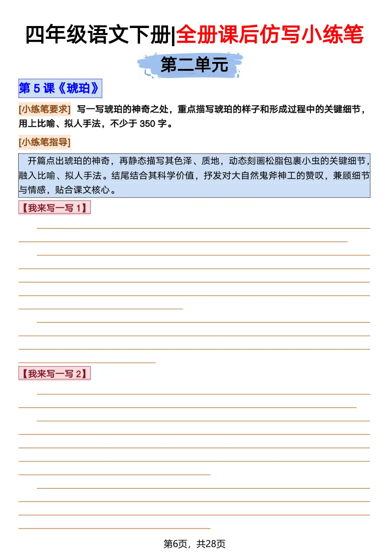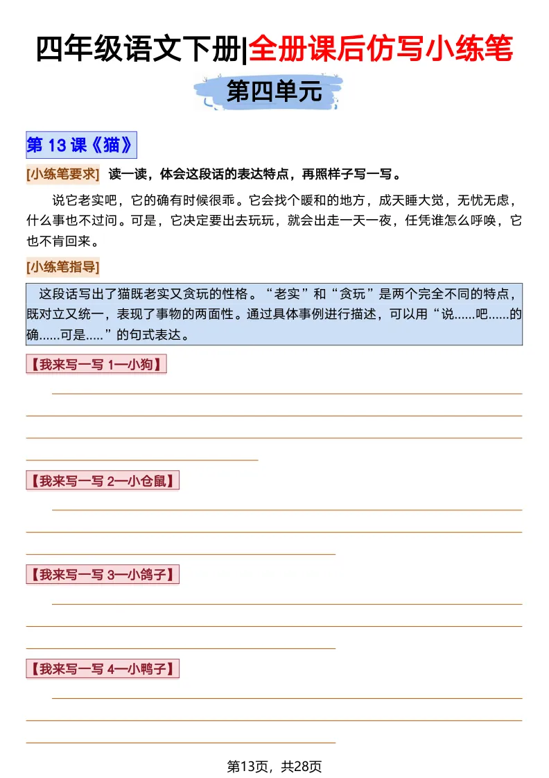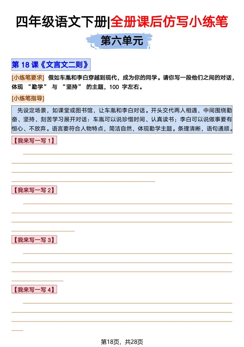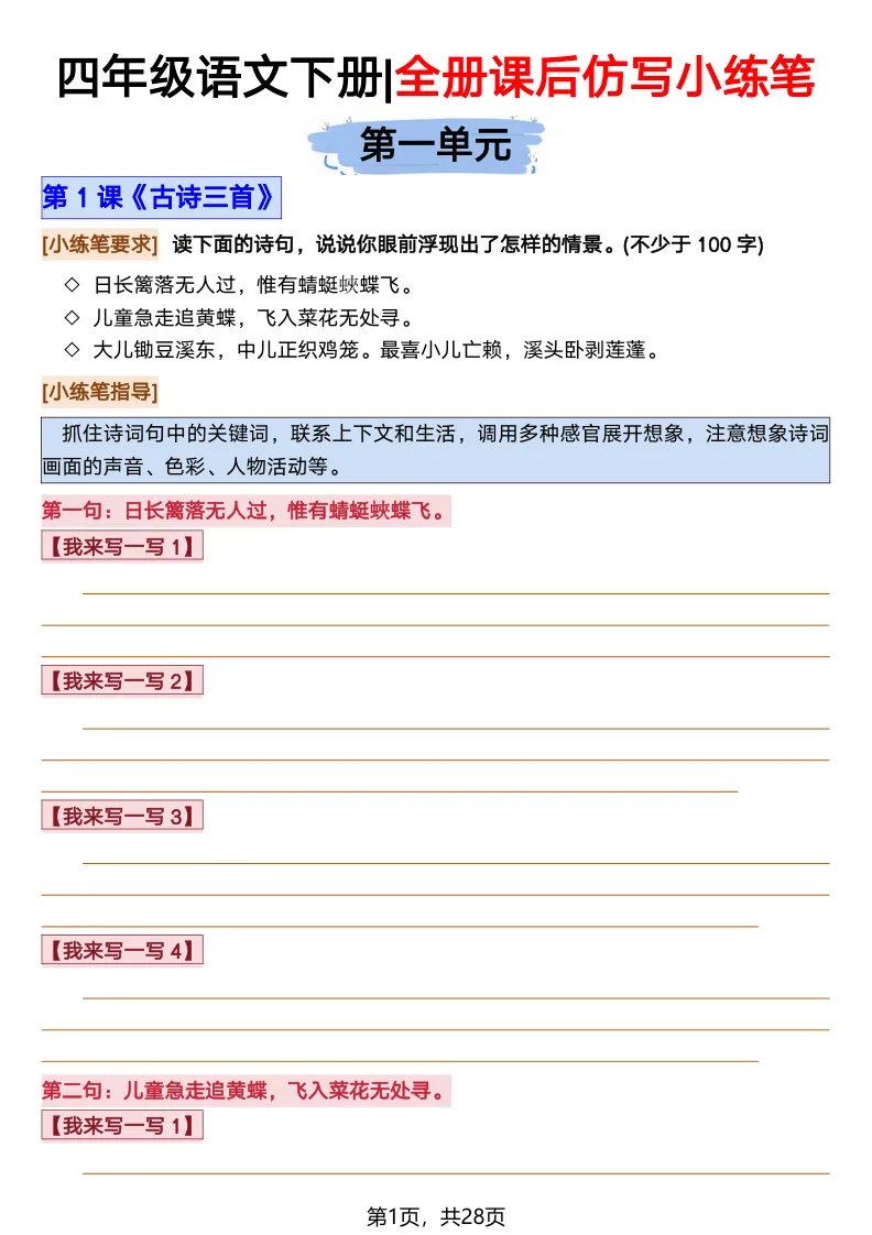 26春部编版《四年级语文下册全册·课文课后小练笔仿写句子》(含打印版)具体看完整PDF文件(温馨提示:文末有电子版下载方式)文件名四年级语文下册全册课后仿写小练笔完整pdf 28 页△因篇幅有限,只展示部分资料截图△复制上方文件名;再这个小程序首页搜索获取↓↓↓好了,以上就是今天的分享。如果对您有帮助,可以点个关注,我是欣骆学习屋,我们下期再见!