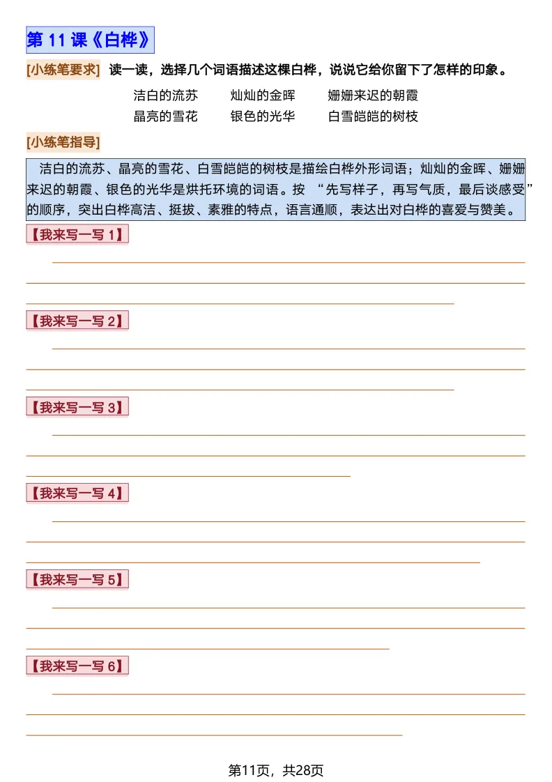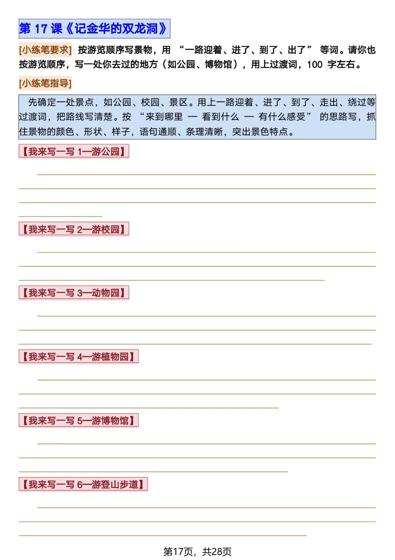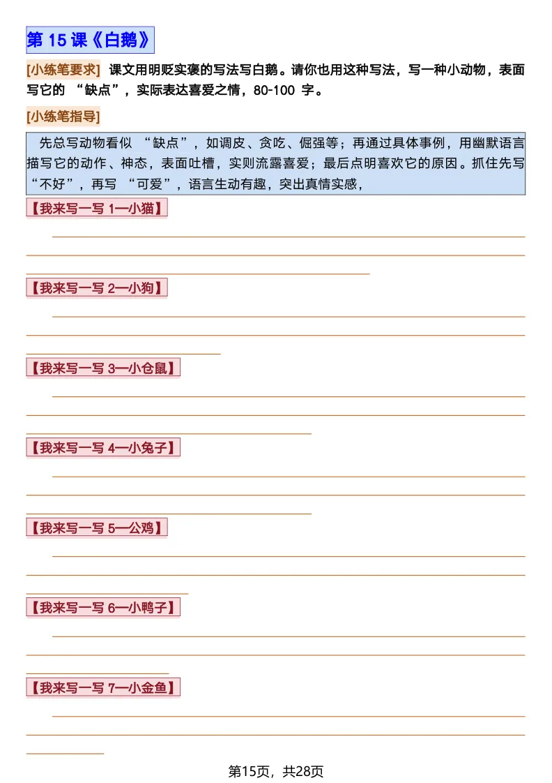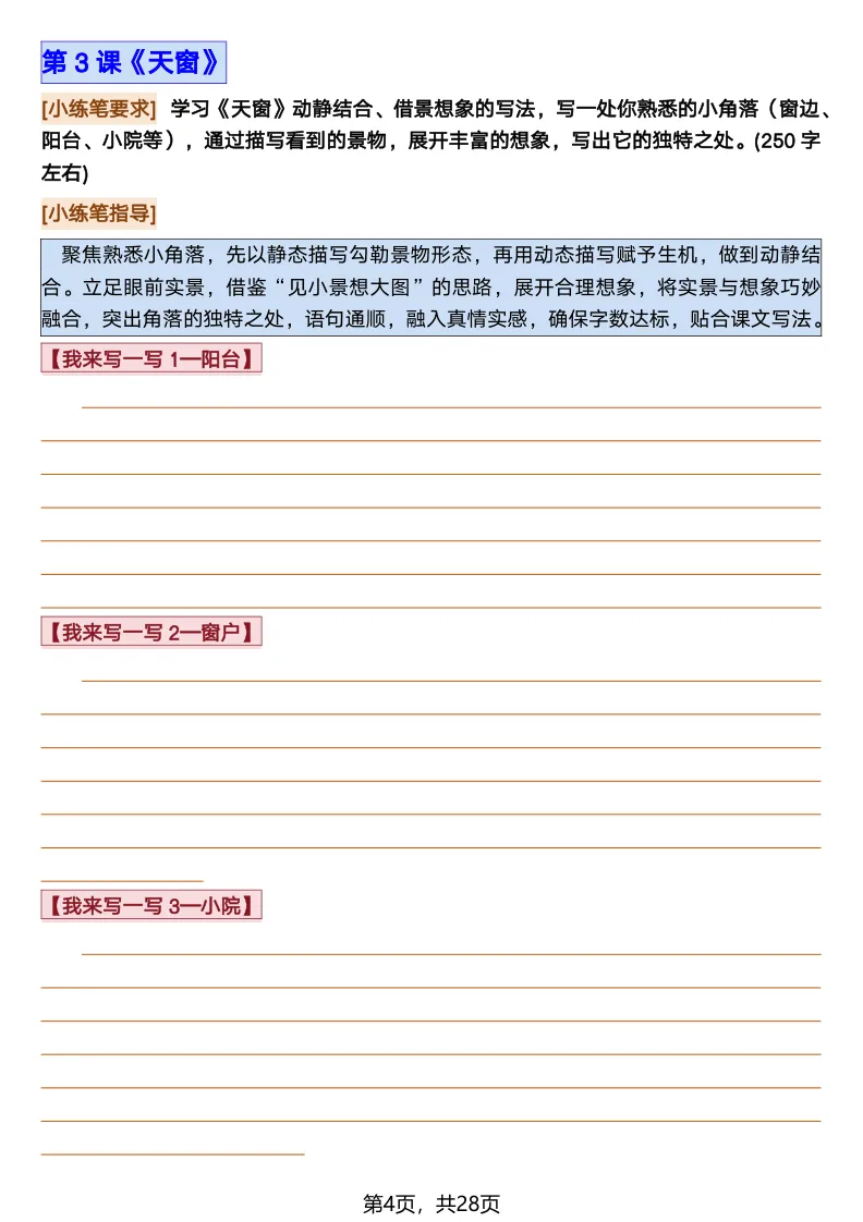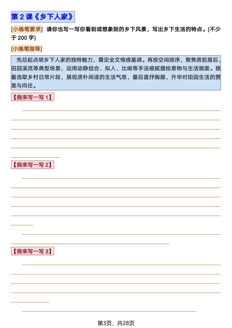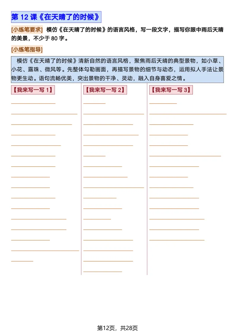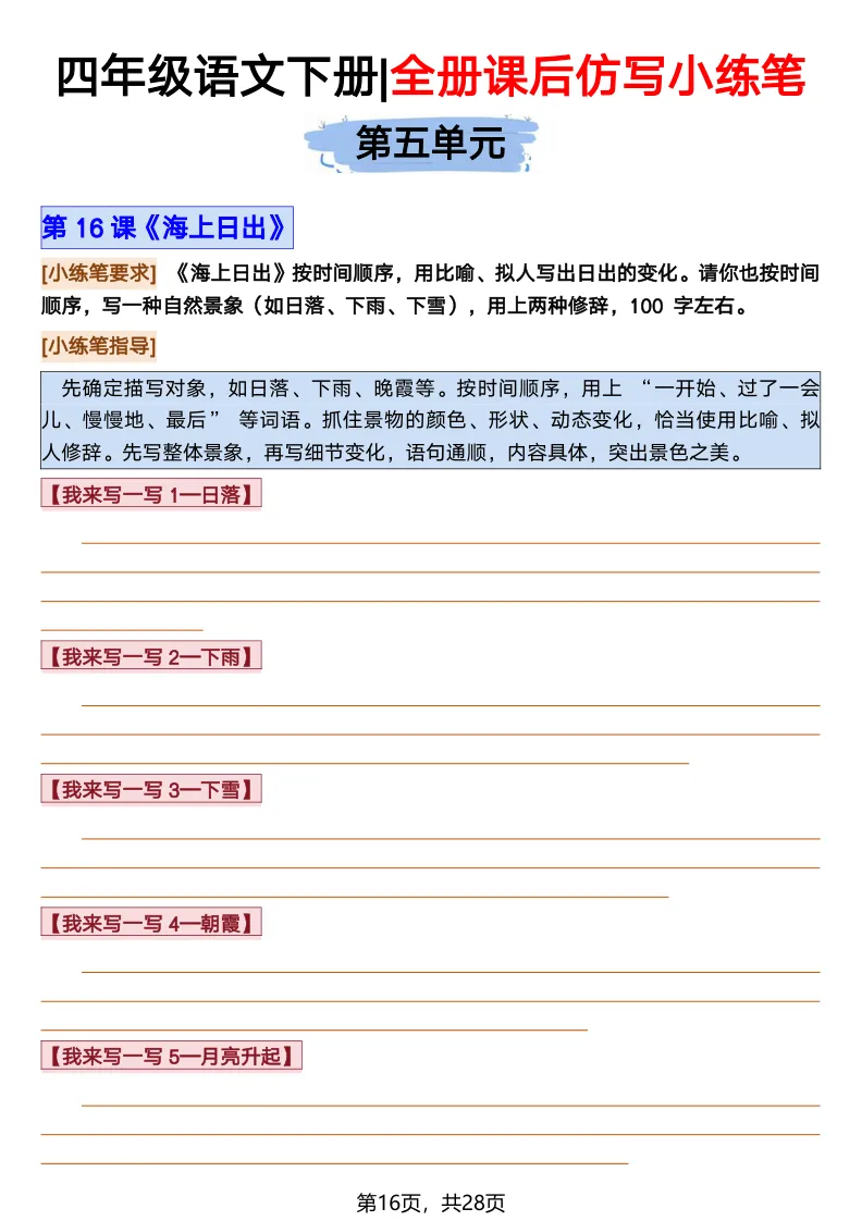 26春部编版《四年级语文下册全册·课文课后小练笔仿写句子》(含打印版)具体看完整PDF文件(温馨提示:文末有电子版下载方式)文件名四年级语文下册全册课后仿写小练笔完整pdf 28 页△因篇幅有限,只展示部分资料截图△复制上方文件名;再这个小程序首页搜索获取↓↓↓好了,以上就是今天的分享。如果对您有帮助,可以点个关注,我是欣骆学习屋,我们下期再见!