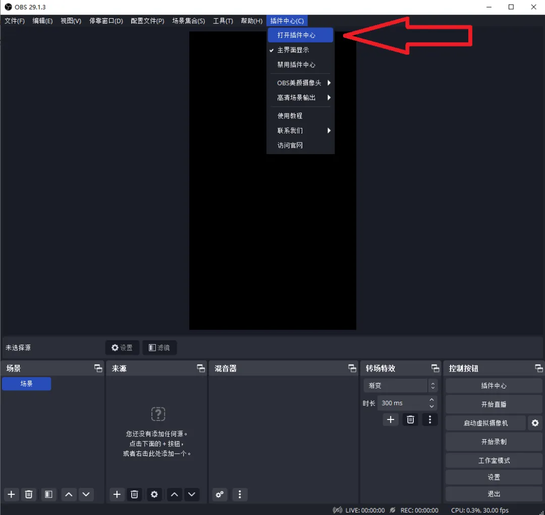 打开刚刚安装的OBS直播软件,然后登录插件中心,如下图所示