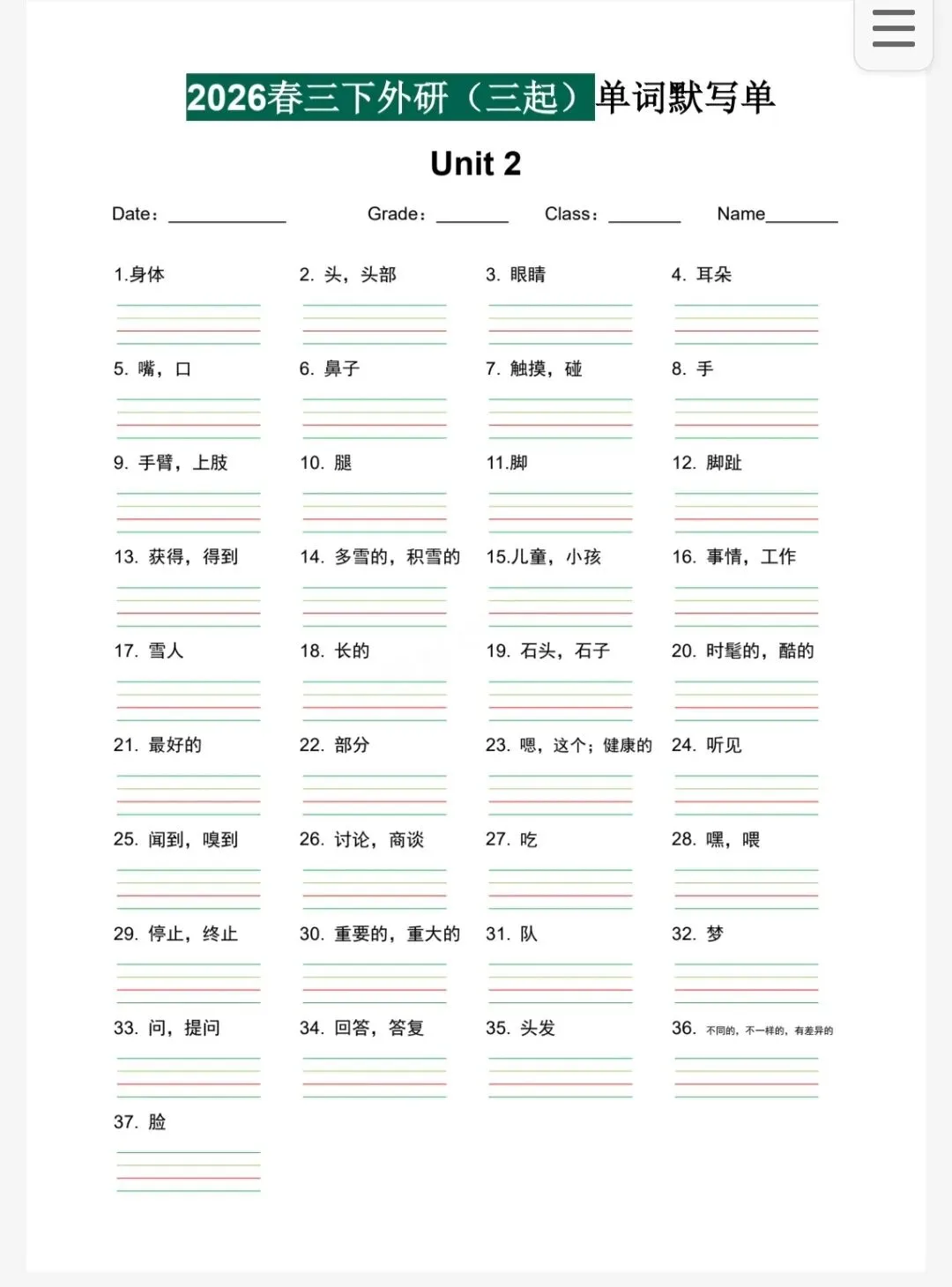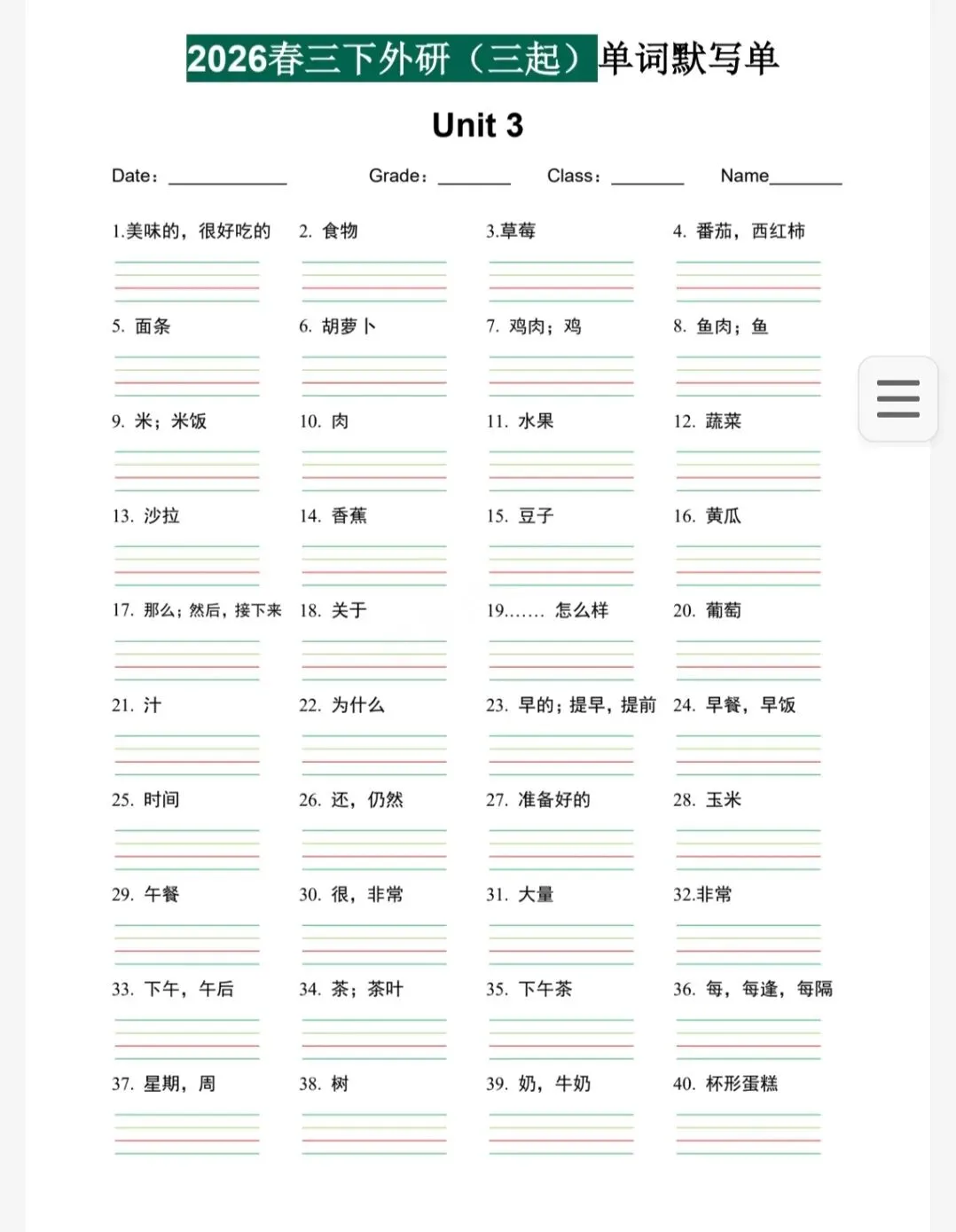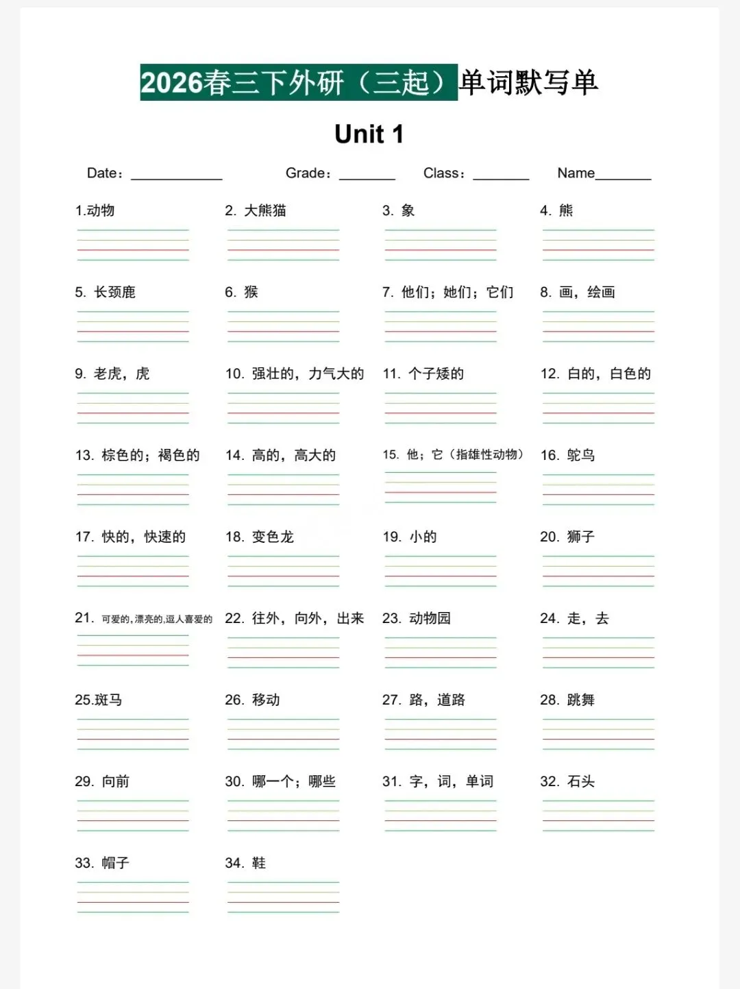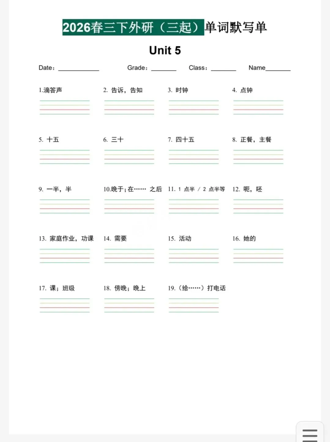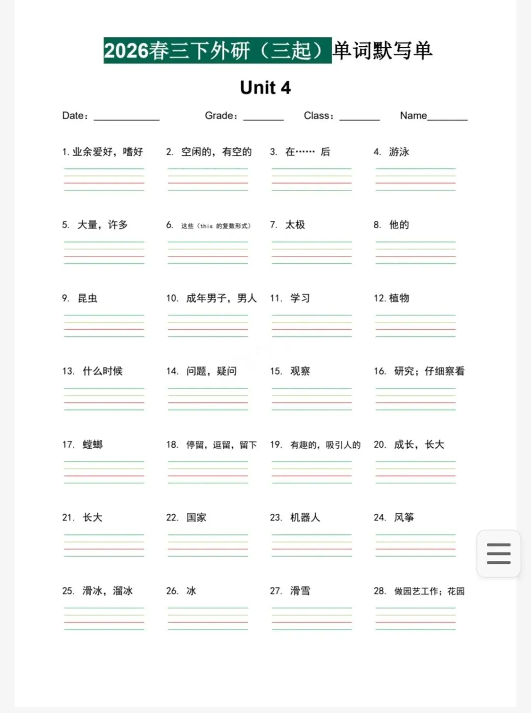 今天给大家分享的是 26春3-6年级下册外研版英语《重点单词句子默写单》中译英 pdf电子版可下载打印。喜欢的家长和老师可以打印给孩子们练习,也可以购买正版资源。