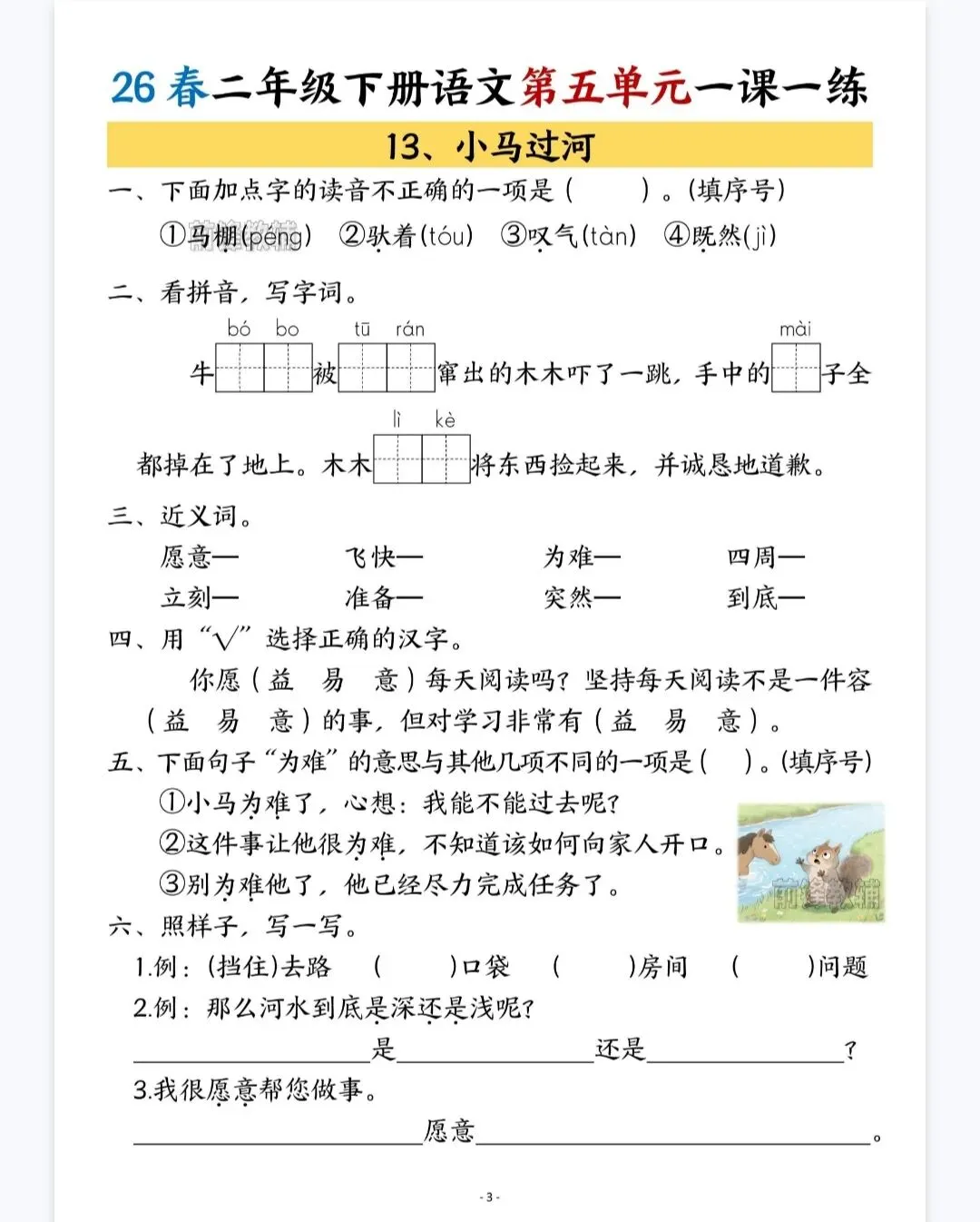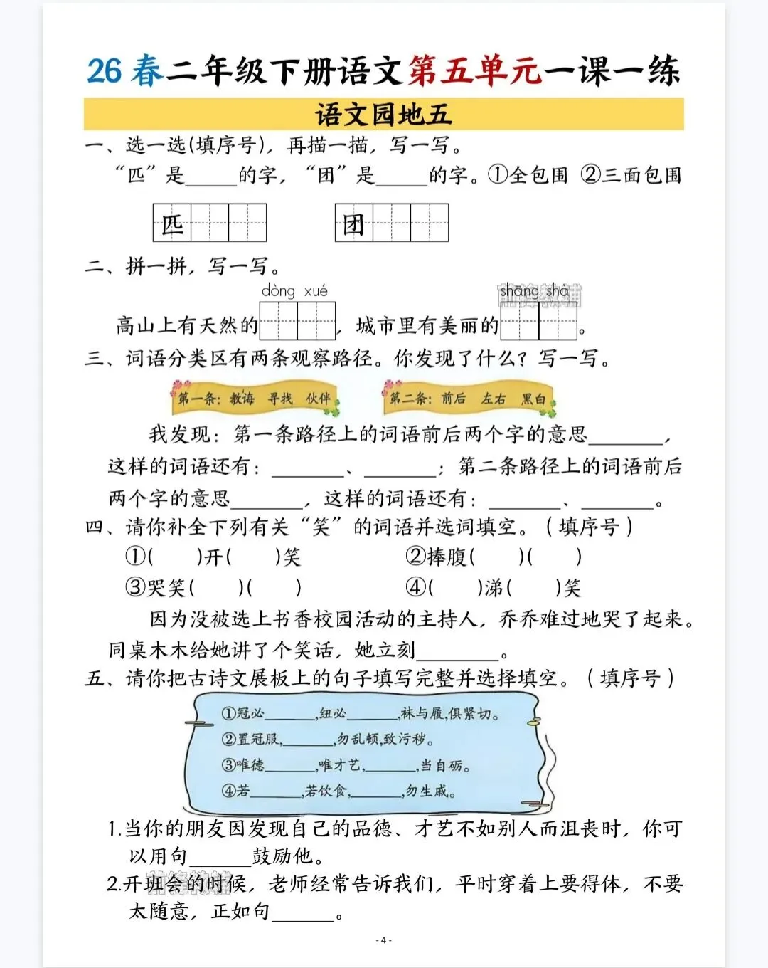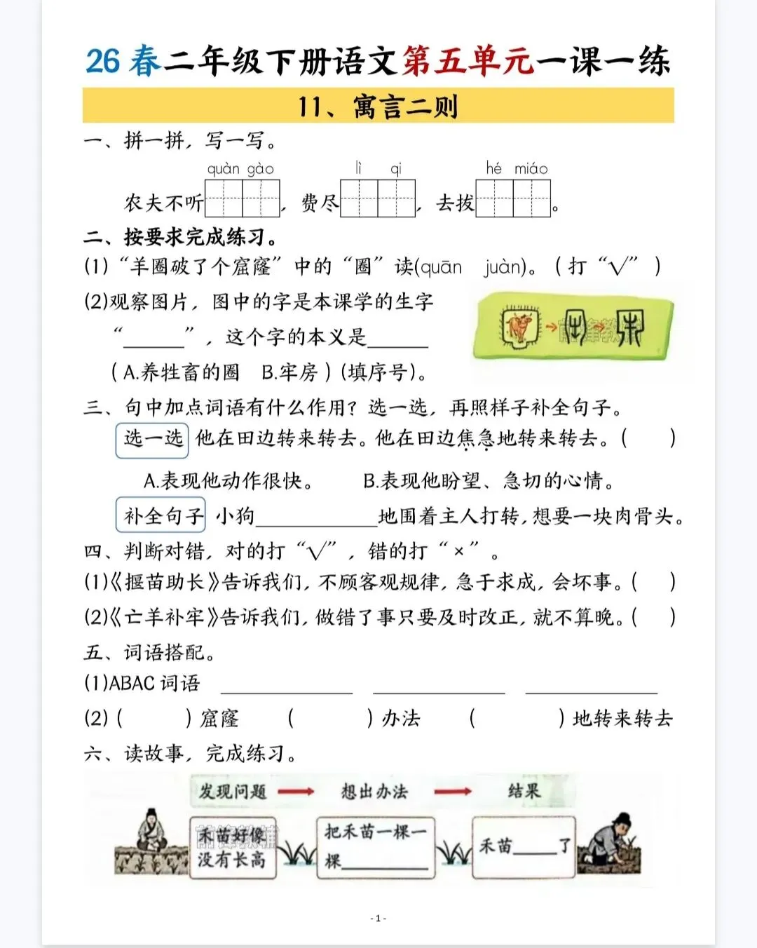 今天给大家整理了26春二年级下册语文第五单元一课一练,转发给朋友或班级群,受益更多人,帮助孩子学习!