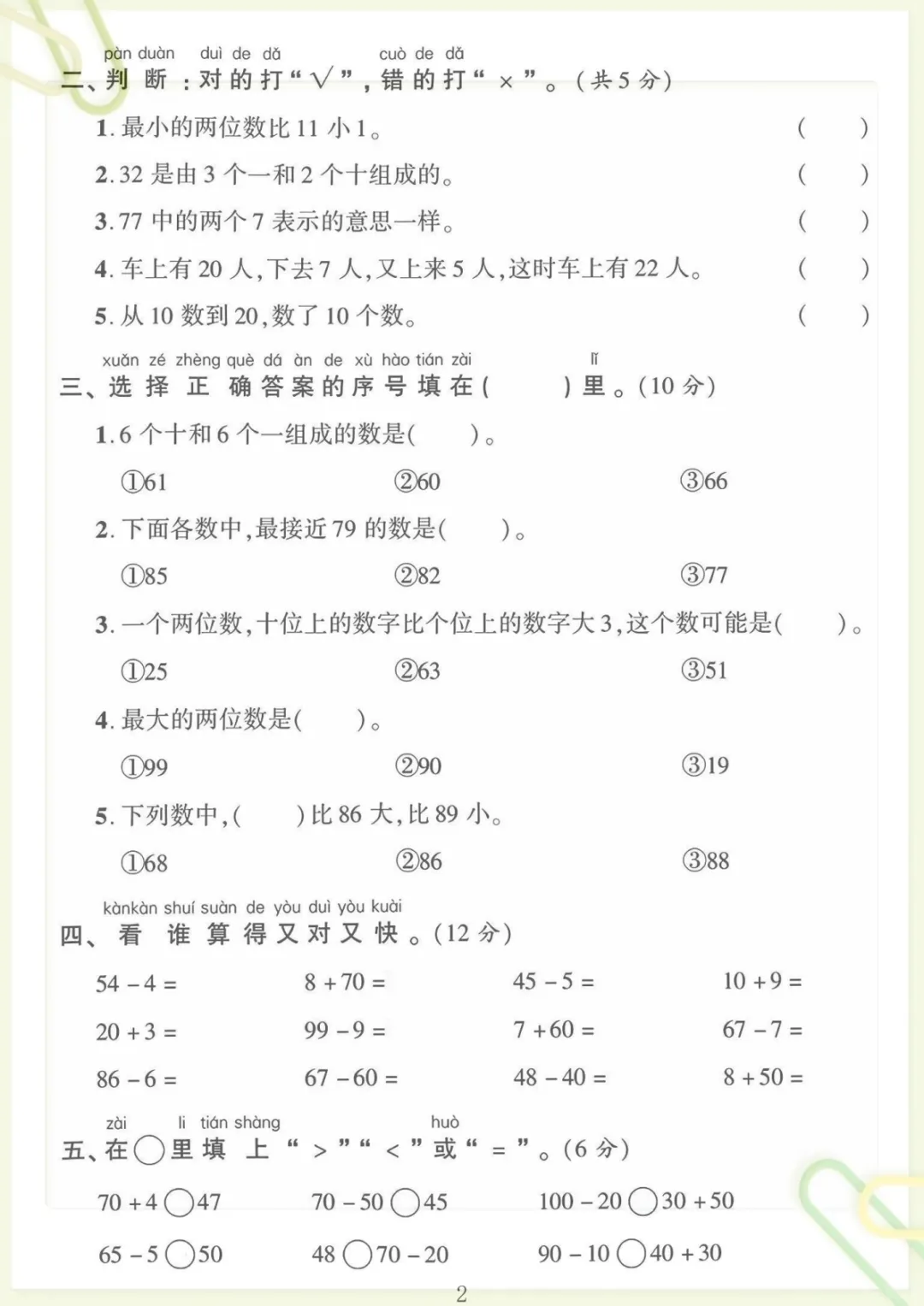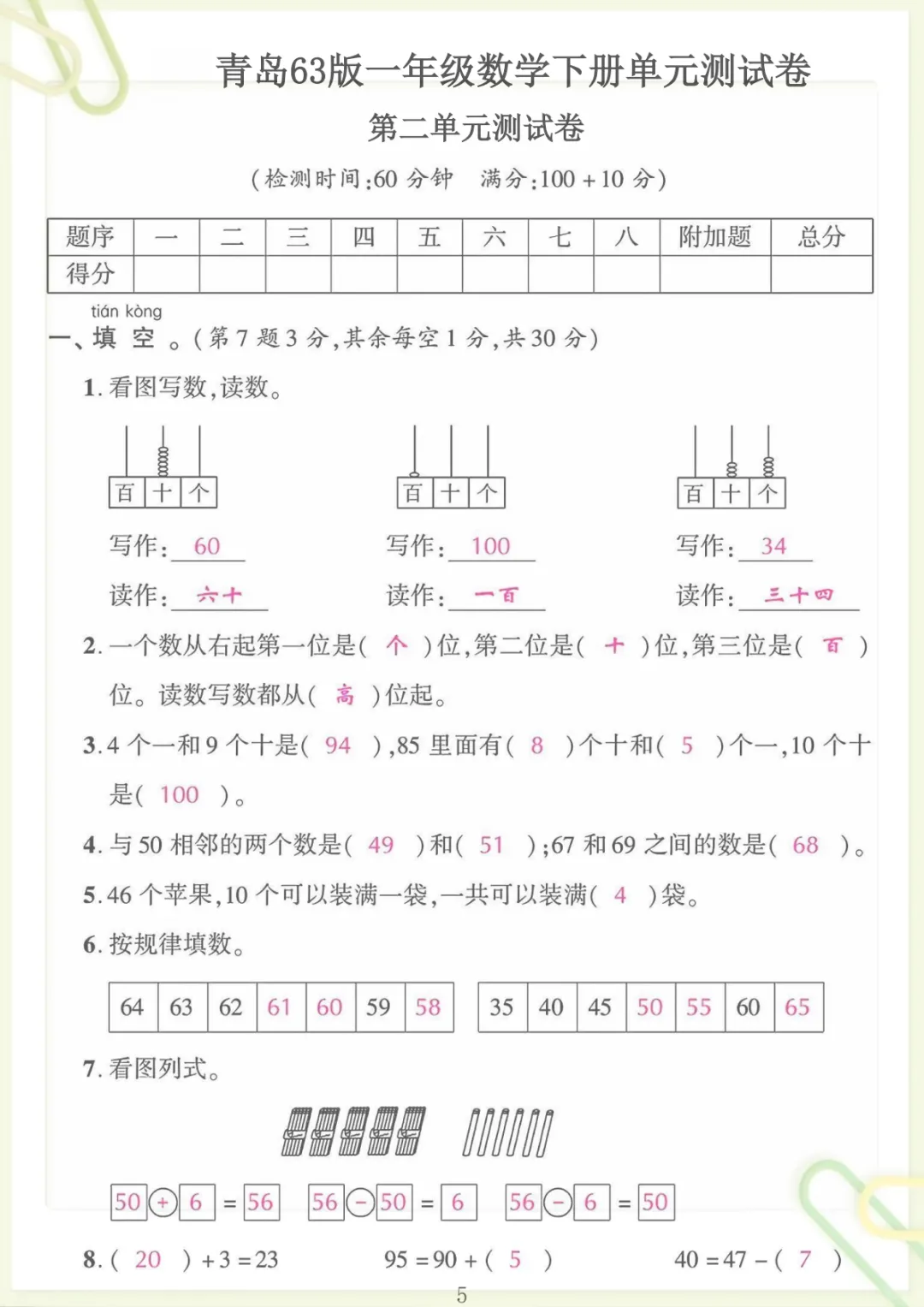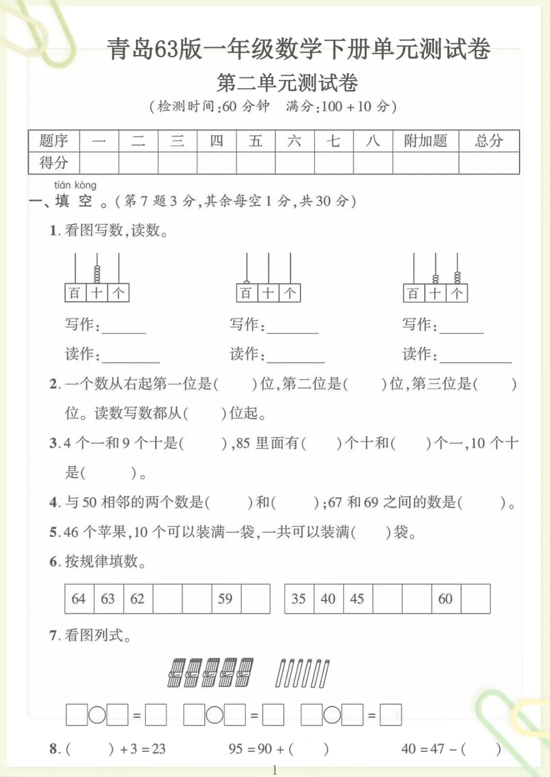 一年级下数学第二单元拔尖测试卷《青岛63版》,共8页,电子版可下载可打印,这份资料紧扣一年级下册数学第二单元学习内容,涵盖多个核心知识点与专项训练内容,题型设置更有针对性,适合孩子在学完单元内容后进行巩固提升与拔尖练习,帮助家长更高效地检查孩子对本单元知识的掌握情况。需要的家长可以提前保存并打印出来,让孩子及时练一练,更好地夯实基础、提升解题能力。