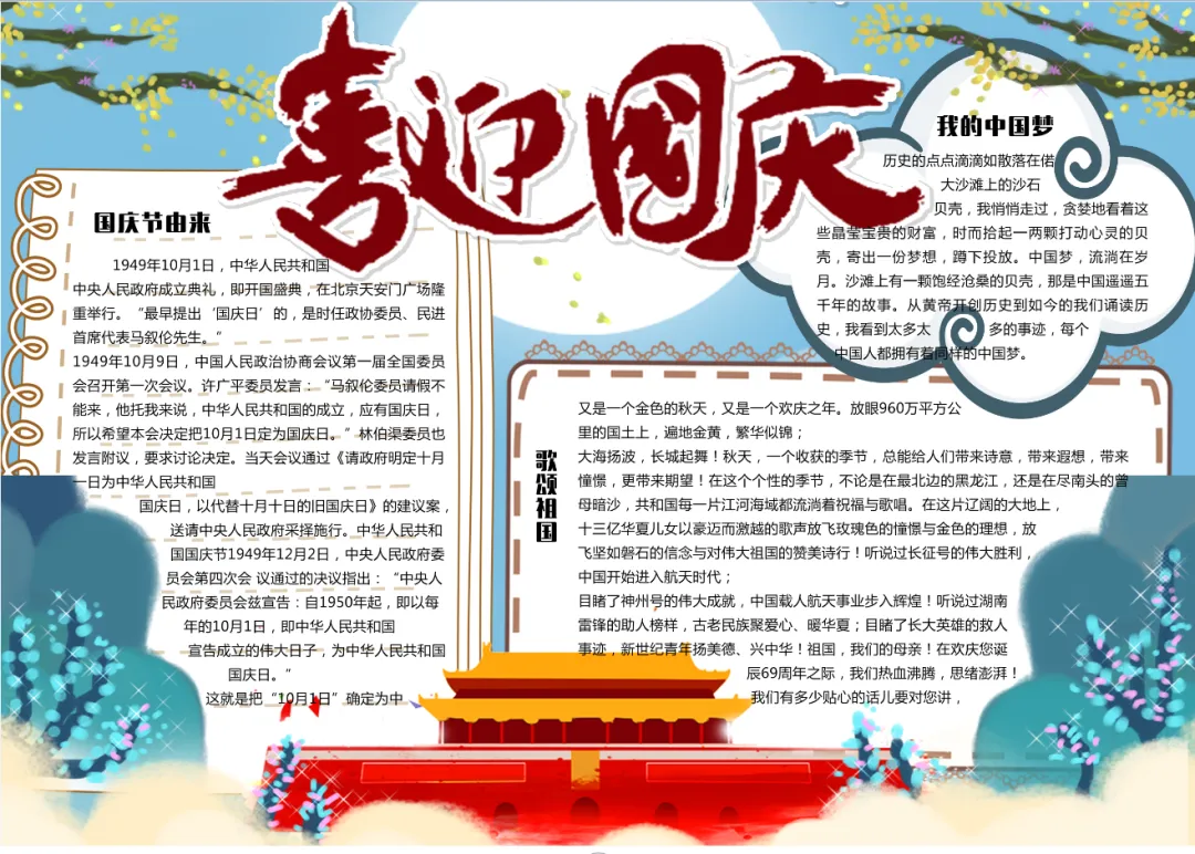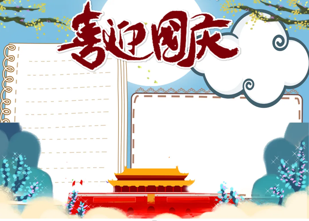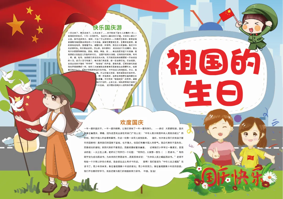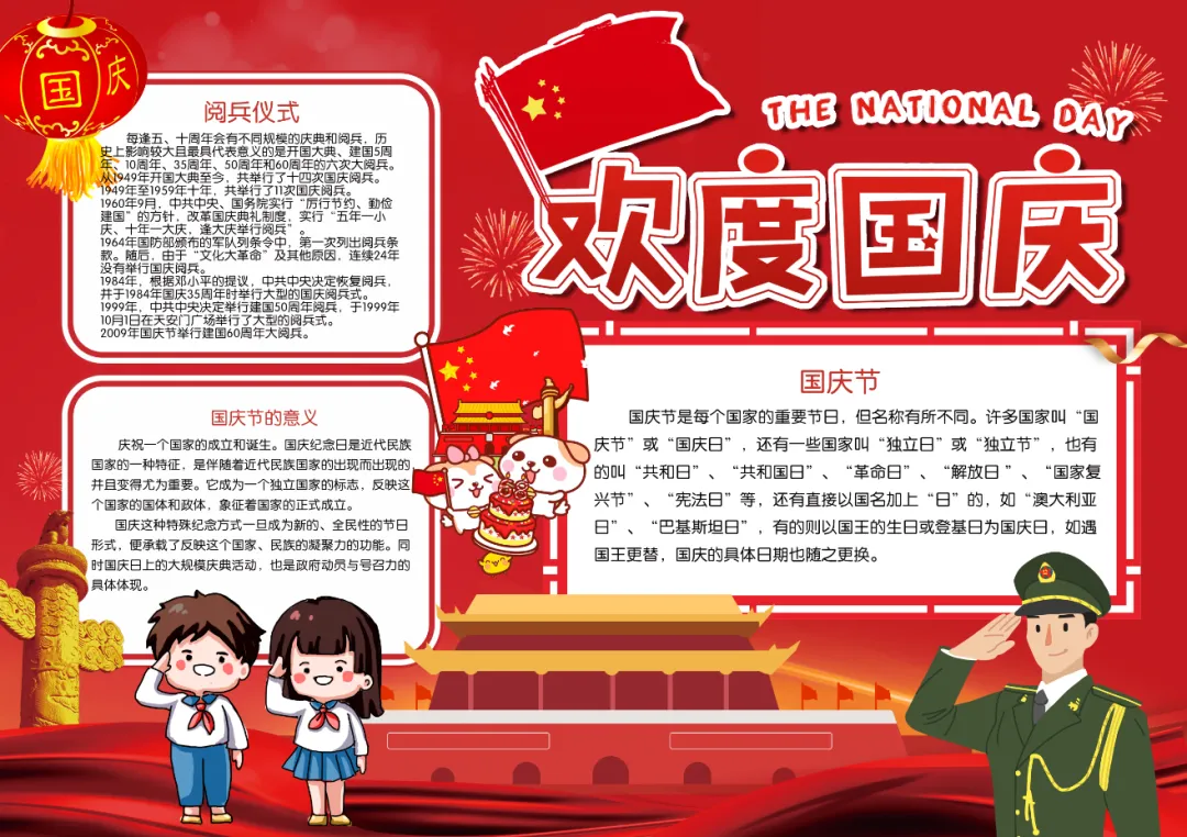 1. 一年一度的国庆节来临了,这是祖国母亲的生日,全国人民都洋溢在普天同庆的节日氛围中。