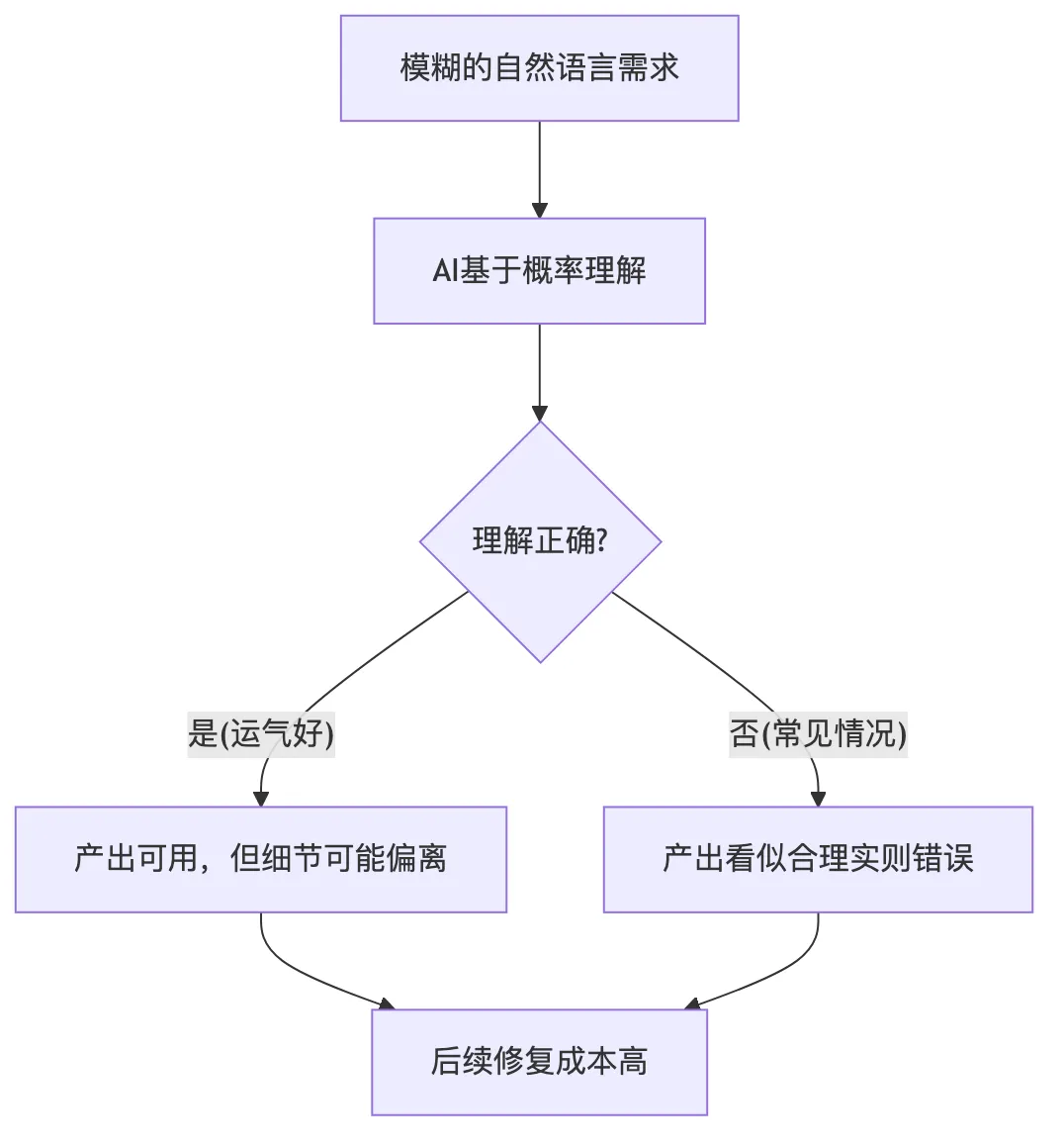 在这个过程中,自然语言的歧义可能带来重大误解。更多的内容请参考我的另一篇文章 《意图对齐:AI 编程时代被忽视的核心工程能力》,其中详细讨论了自然语言处理中的一些潜在问题。