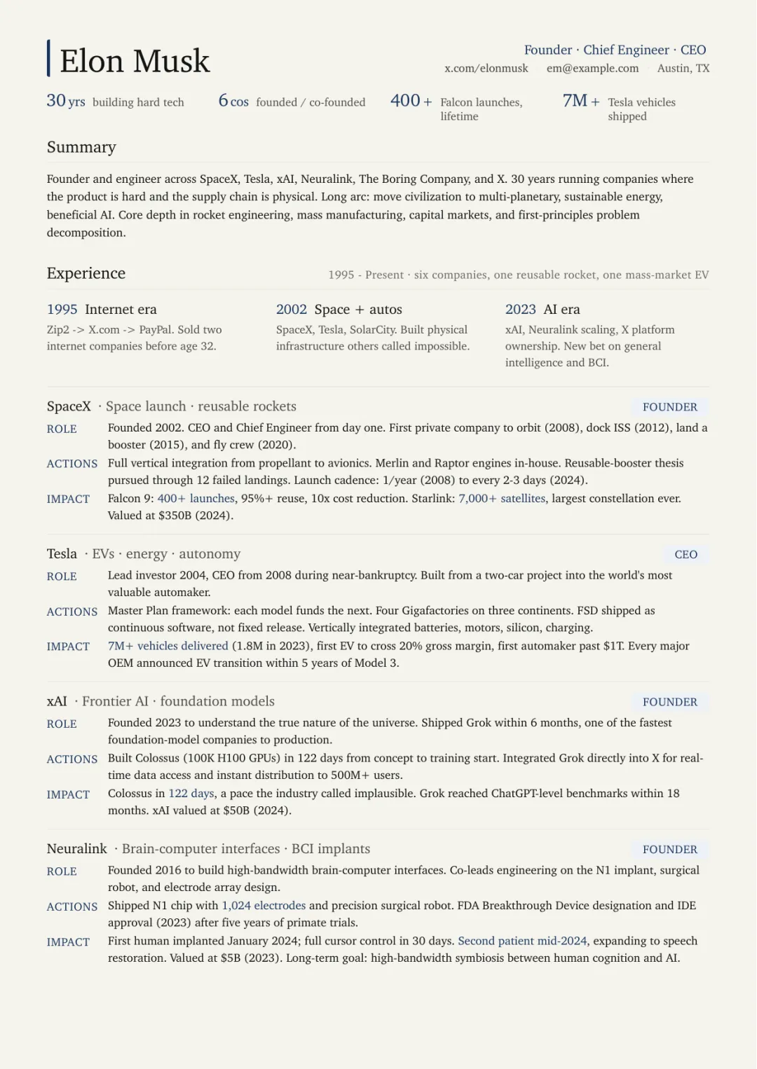 • 一页纸(One-Pager): 适合做公司或产品介绍,把核心内容压缩在一张 A4 内。示例里用了特斯拉的公司简介,排版非常干净,一眼能抓到关键信息。 • 长文档(Long Doc): 用于研究报告、技术说明这类需要多页展开的内容。Kami 在这里把行距和字号管理得比较细,密排和阅读两种模式行距分别控制在 1.4–1.45 和 1.5–1.55,读起来不累。 • 正式信件(Letter): 格式清晰,适合对外的商务沟通或正式函件。 • 作品集(Portfolio): 展示项目经历,有独立的布局结构,适合设计师或开发者整理自己的工作成果。 • 简历(Resume): 这是很多人最常用到的。Kami 的简历模板不靠花哨的颜色块吸引注意,靠的是字体和间距的层级。示例用的是 Elon Musk 的虚构简历,可以当作参考看看效果。 • 幻灯片(Slides): 生成类似 Keynote 风格的演示文稿。项目里有一份 AI Agent 相关的幻灯片示例,六张左右,布局简洁,没有多余装饰。