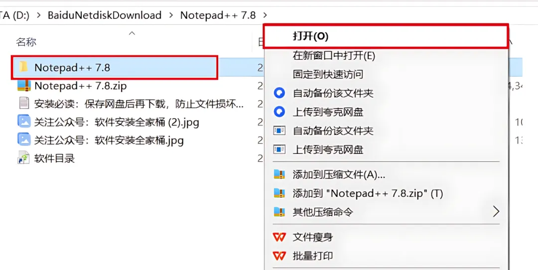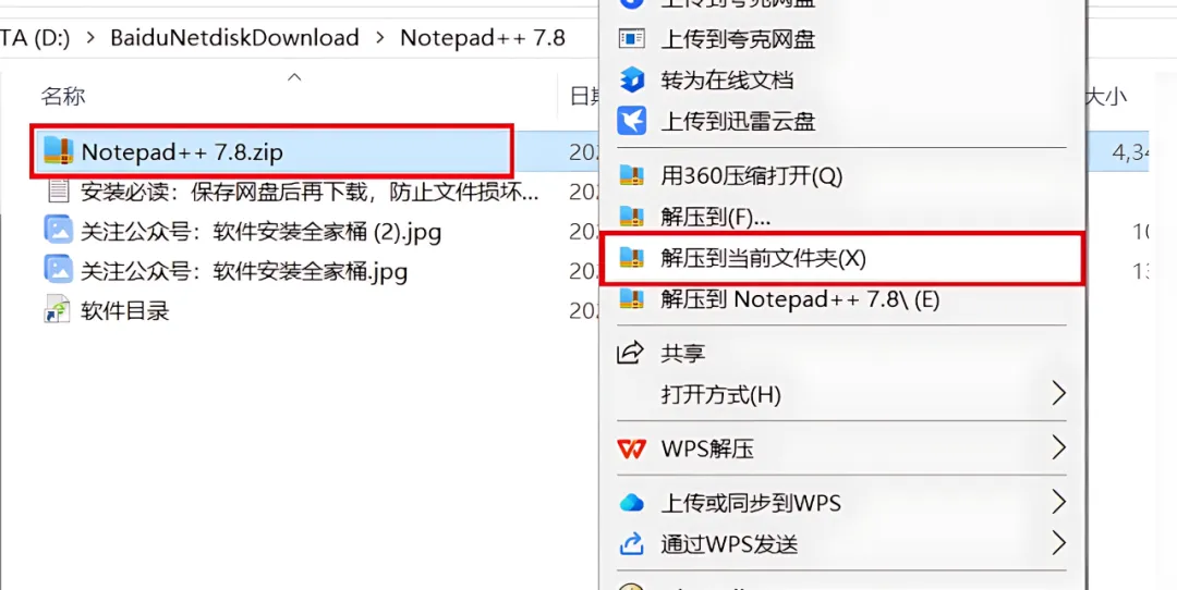 1、下载Notepad++ 7.8软件安装包到电脑上,右键选择【解压到当前文件夹】。