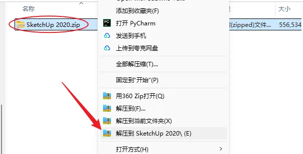 1.解压安装包:鼠标右击【SketchUp 2020】压缩包,选择电脑上安装的解压软件,点击【SketchUp 2020】。