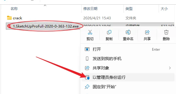 3.鼠标右击【1.SketchUpProFull-2020-0-363-132.exe】选择【以管理员身份运行】。